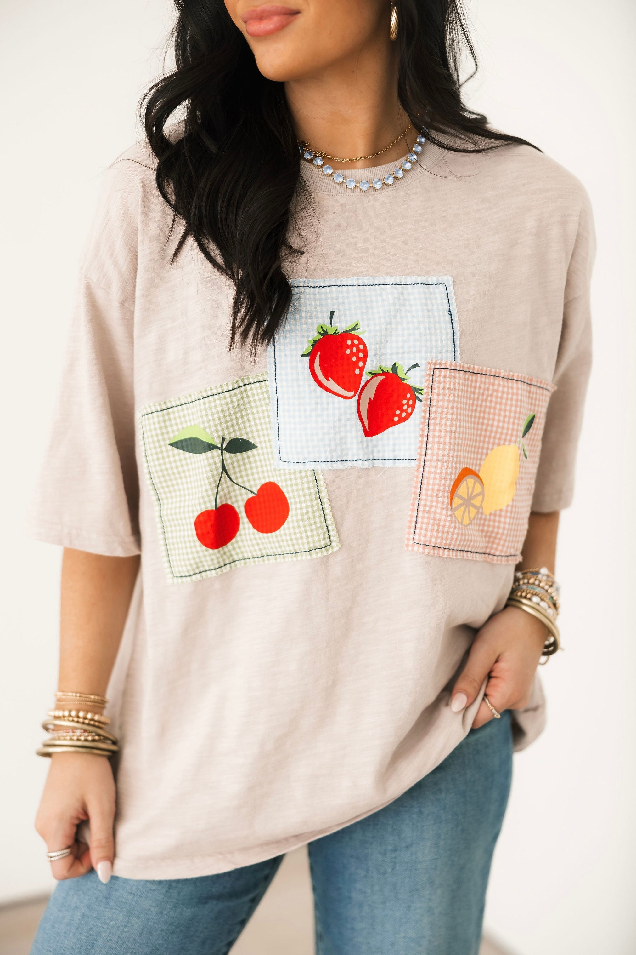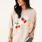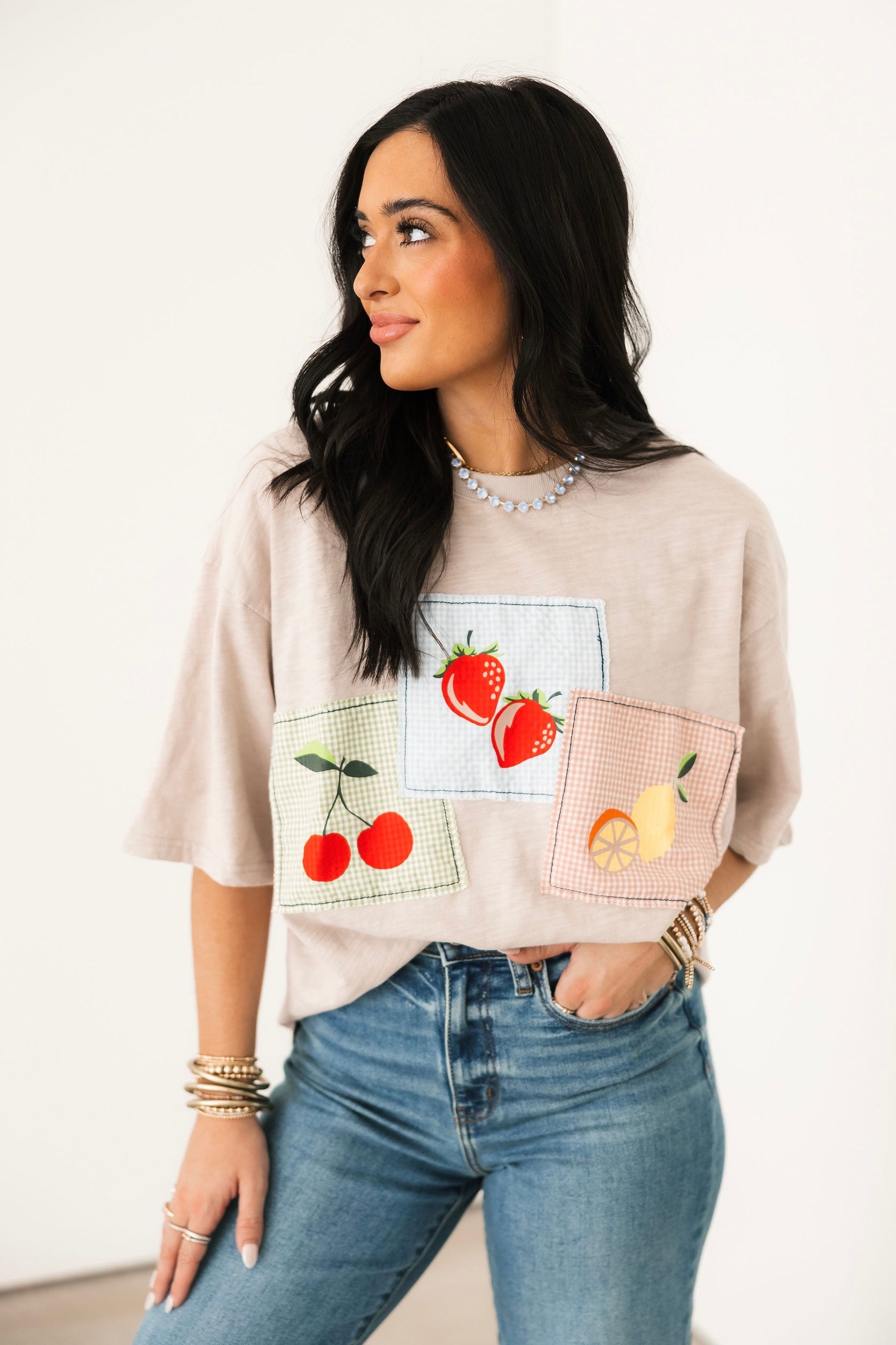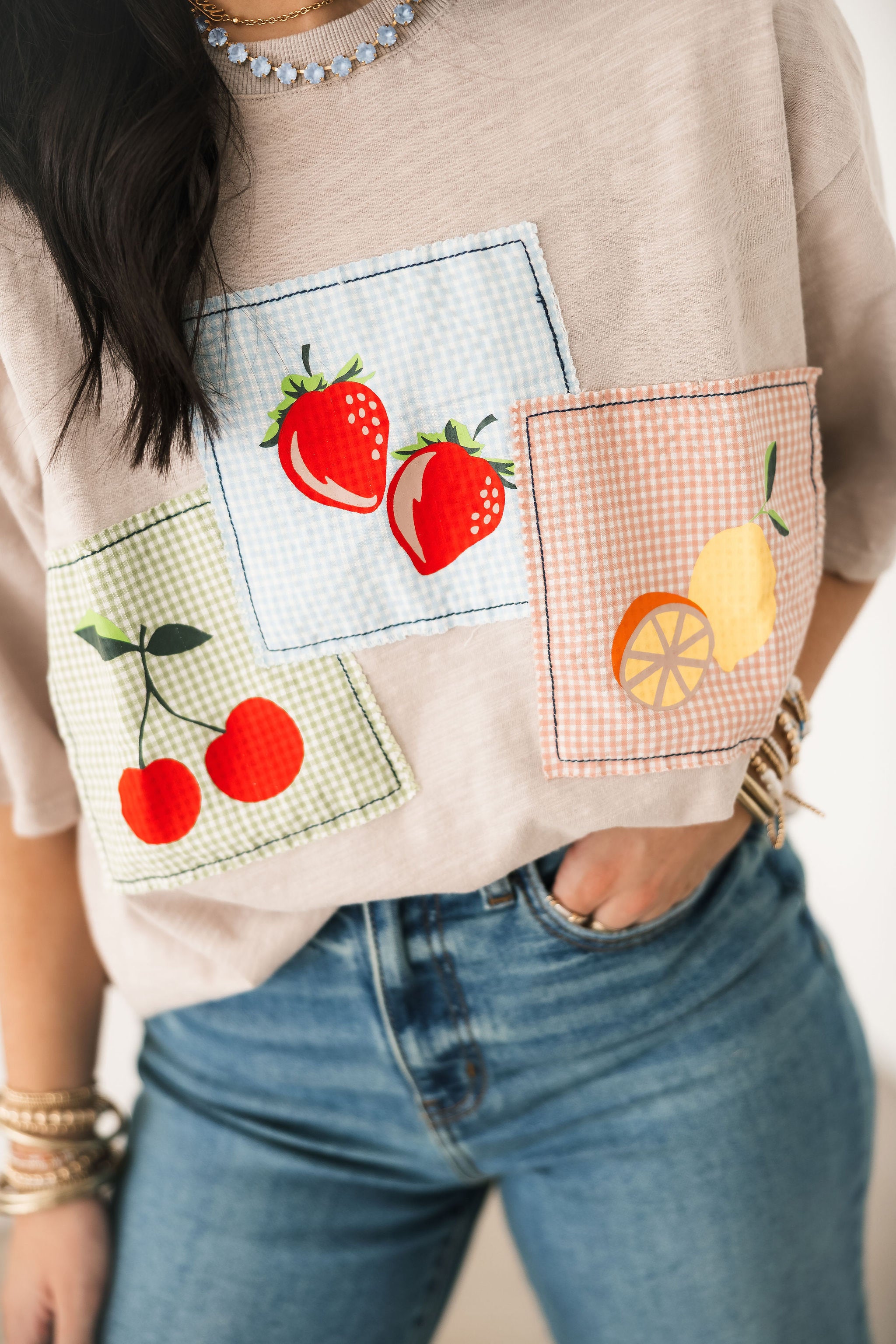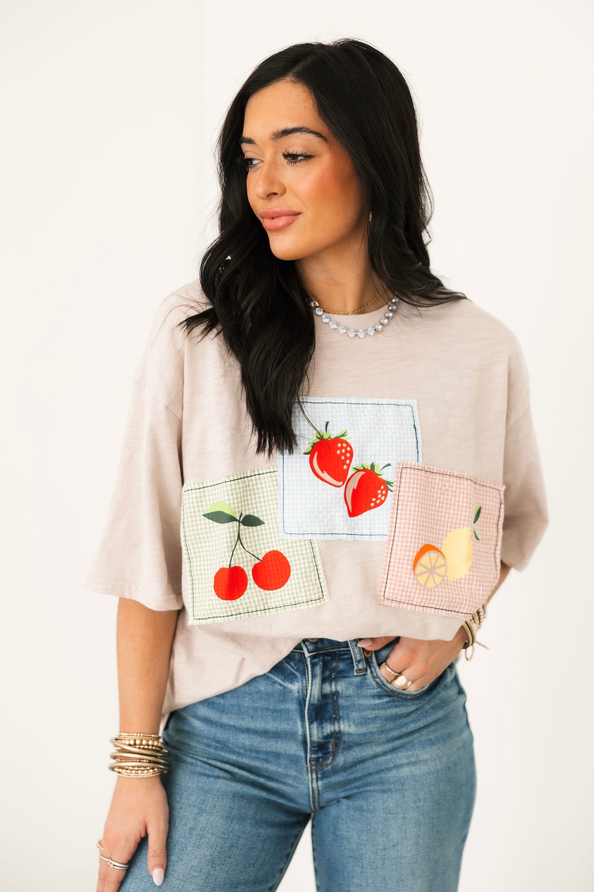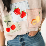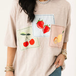 The Fruit Gingham Patch Tee is an oversized, boxy tee that’s made for sunny spring and summer days. With its playful patchwork design and pops of color, it instantly adds a fun touch to any outfit. Easy to throw on with denim, shorts, or lounge bottoms, this tee brings personality and comfort together in one cute, laid-back look. Sage is wearing a small.