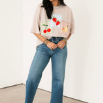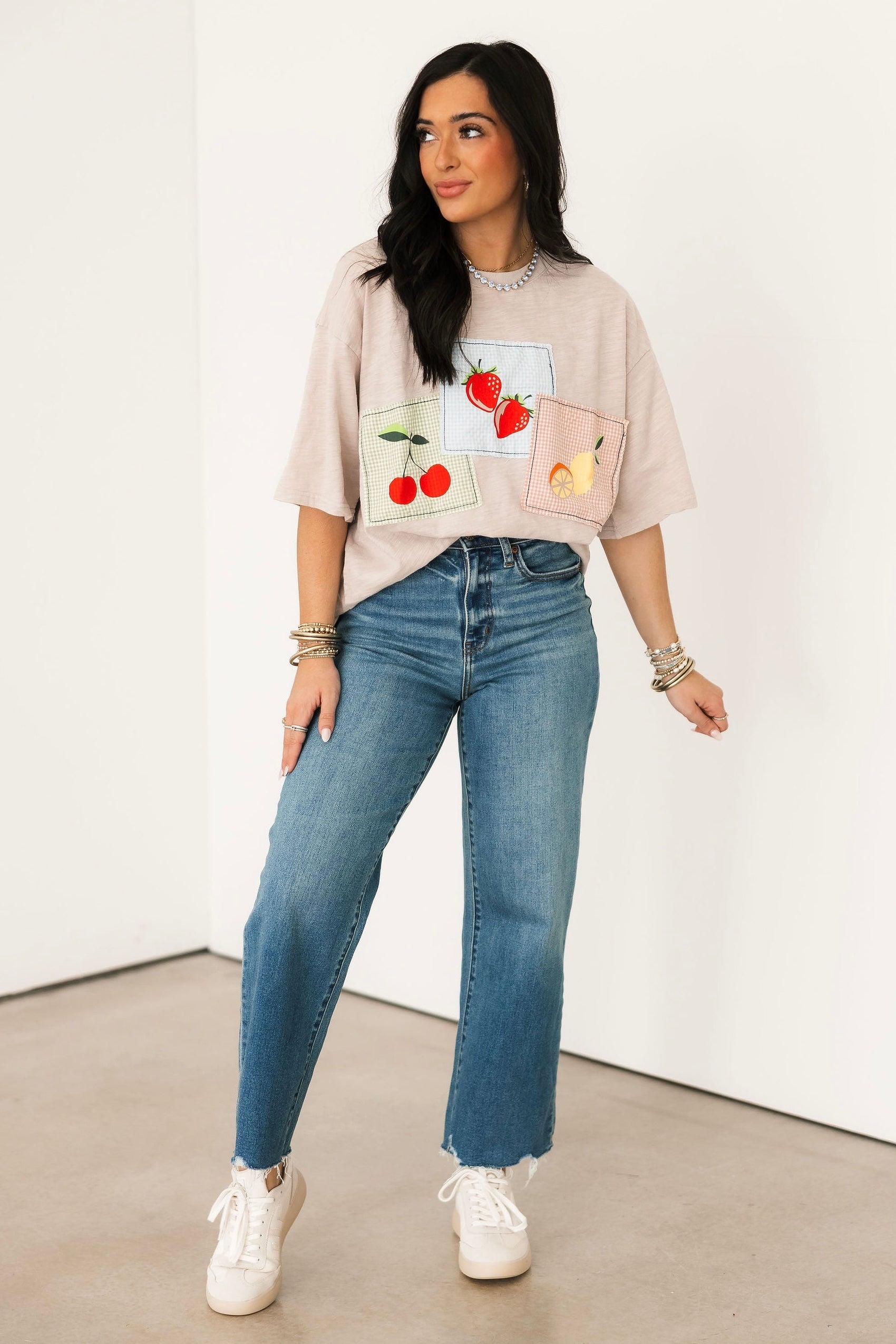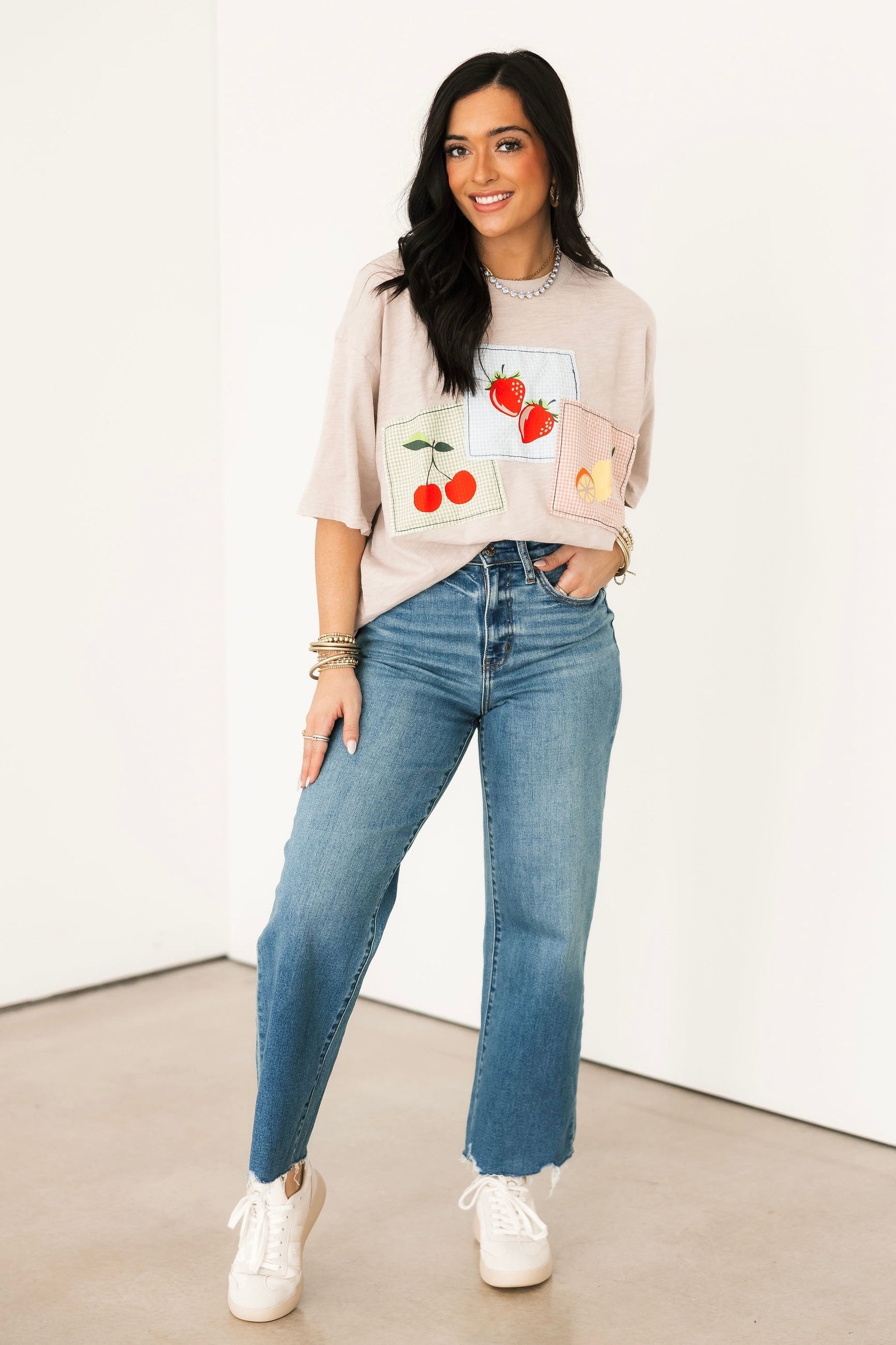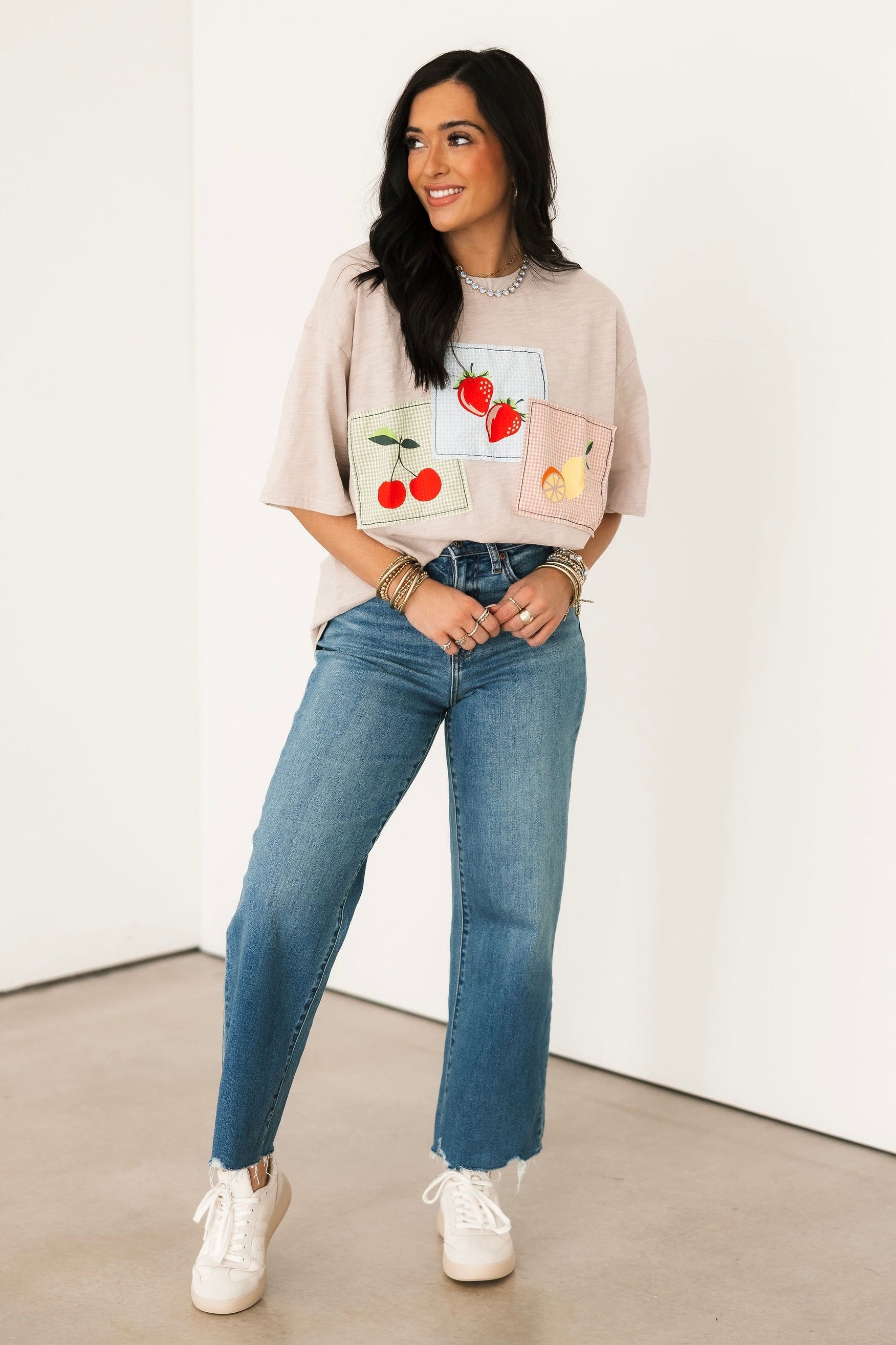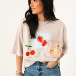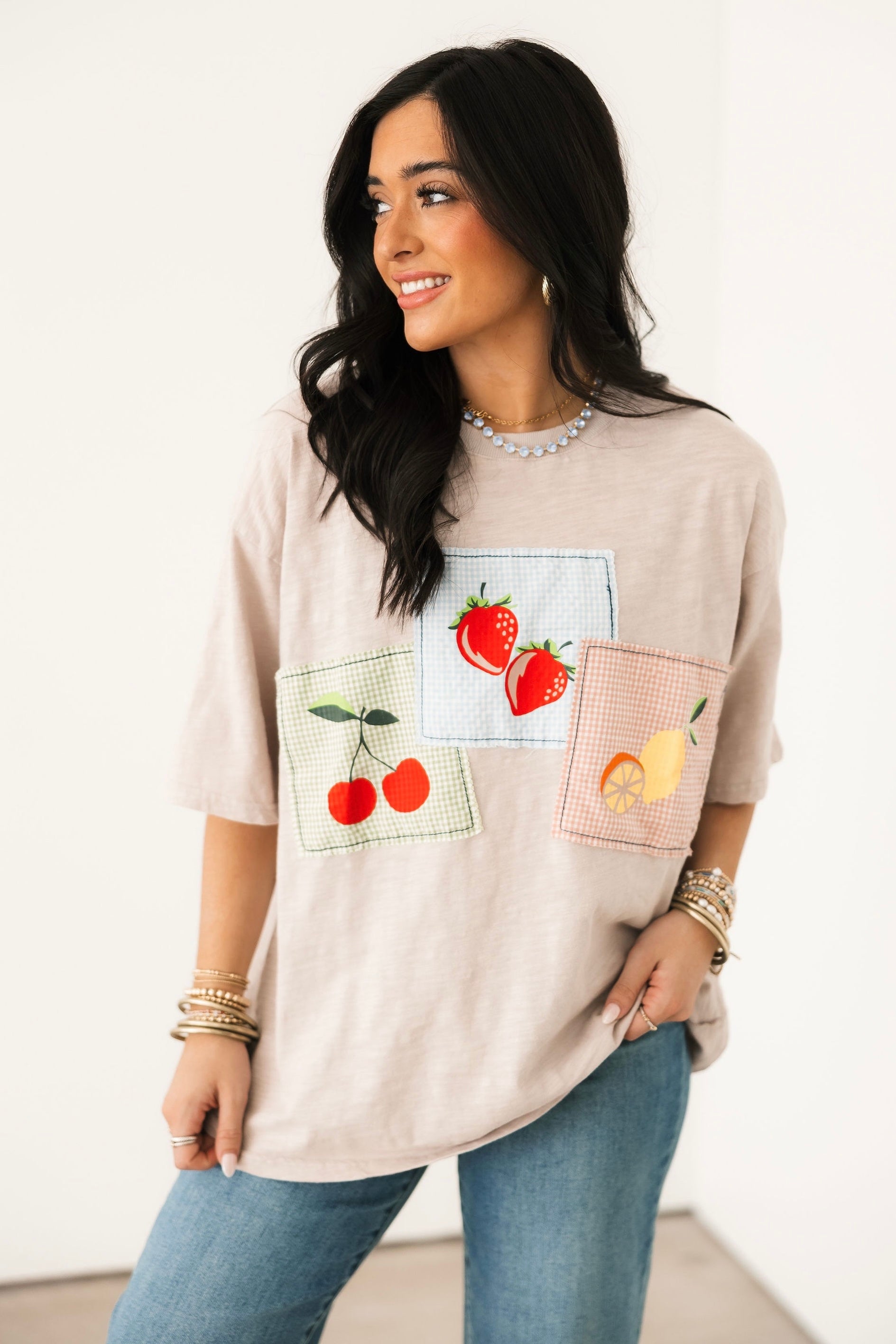 The Fruit Gingham Patch Tee is an oversized, boxy tee that’s made for sunny spring and summer days. With its playful patchwork design and pops of color, it instantly adds a fun touch to any outfit. Easy to throw on with denim, shorts, or lounge bottoms, this tee brings personality and comfort together in one cute, laid-back look. Sage is wearing a small.