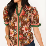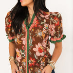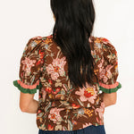 The Garden Party Blouse features a soft floral print with a flattering V-neckline, romantic puff sleeves, and a playful ruffle hem. Its relaxed fit makes it an easy go-to for dressing up or down all season long. Sage is wearing a small.
