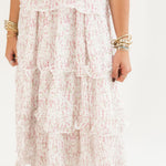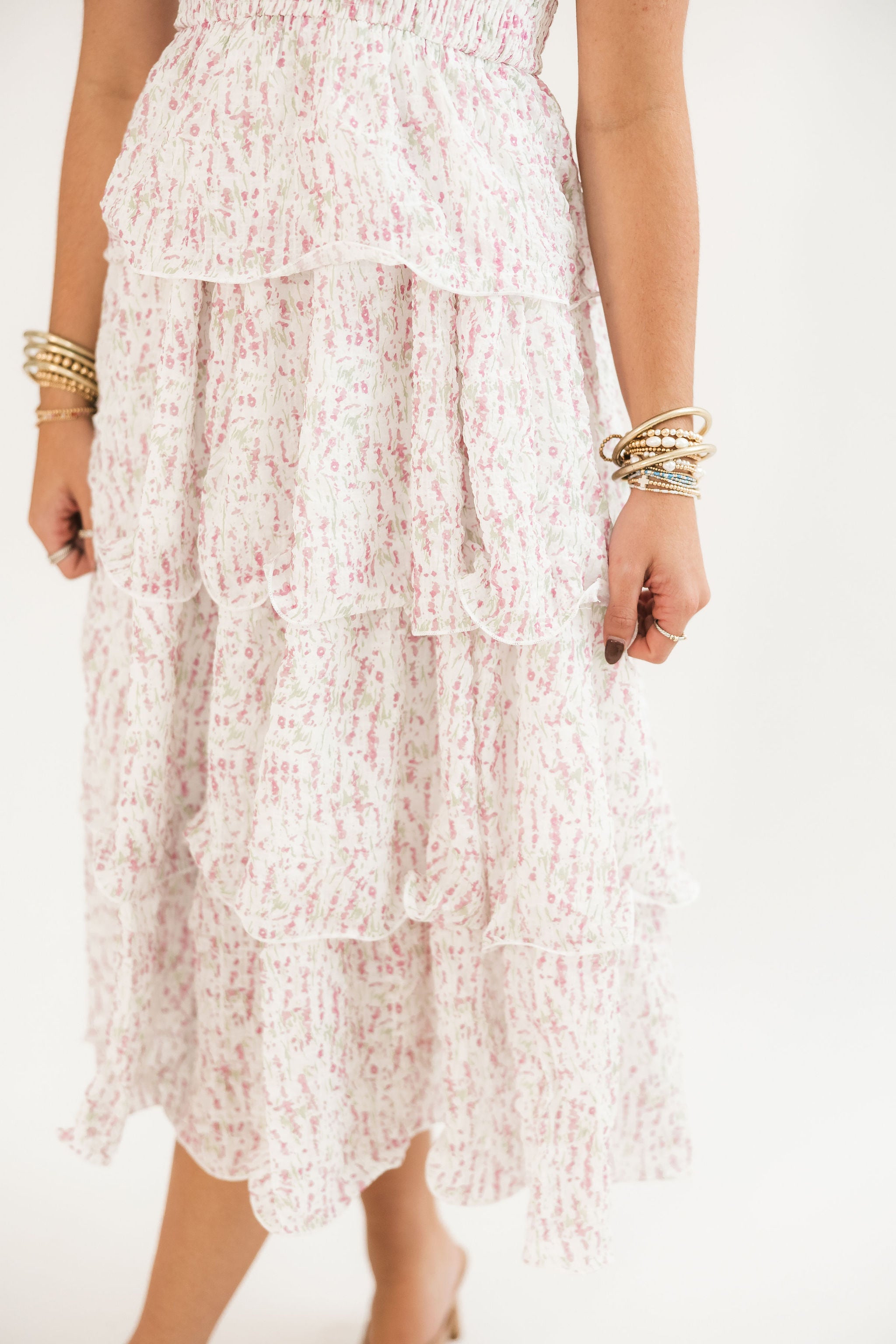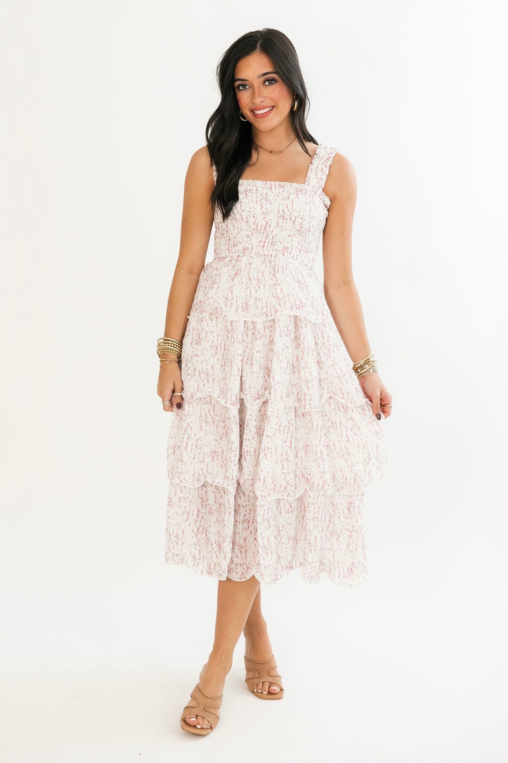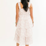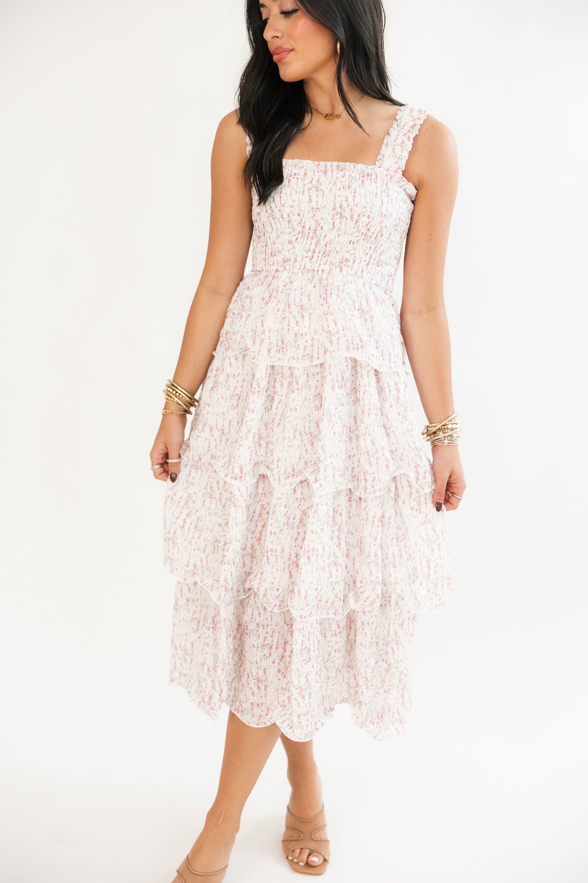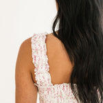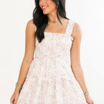 Romantic and feminine, this dress features a smocked, fitted bodice that flows into a tiered skirt covered in soft pink florals. Delicate shoulder ruffles and a sleeveless design create a light, airy feel that’s perfect for warm days or special occasions. Sage is wearing a small.