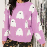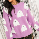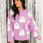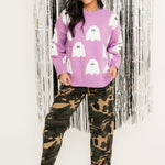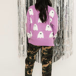 Cozy up for spooky season with the Ghost All Over Sweater in Lavender Haze. This soft, plush knit features a minimalist white ghost graphic that brings just the right hint of Halloween whimsy to a relaxed, easygoing silhouette. Sage is wearing a small.