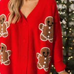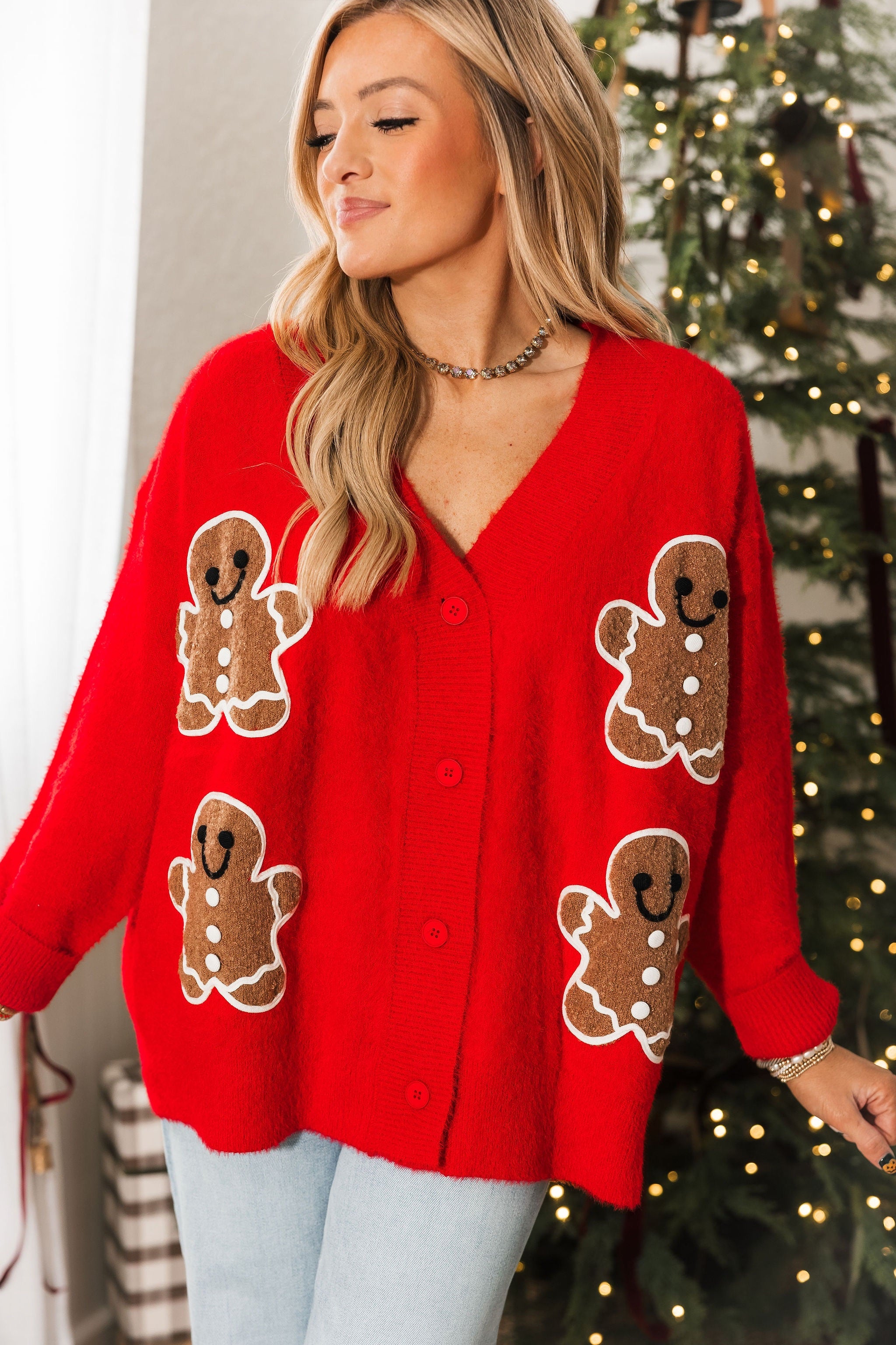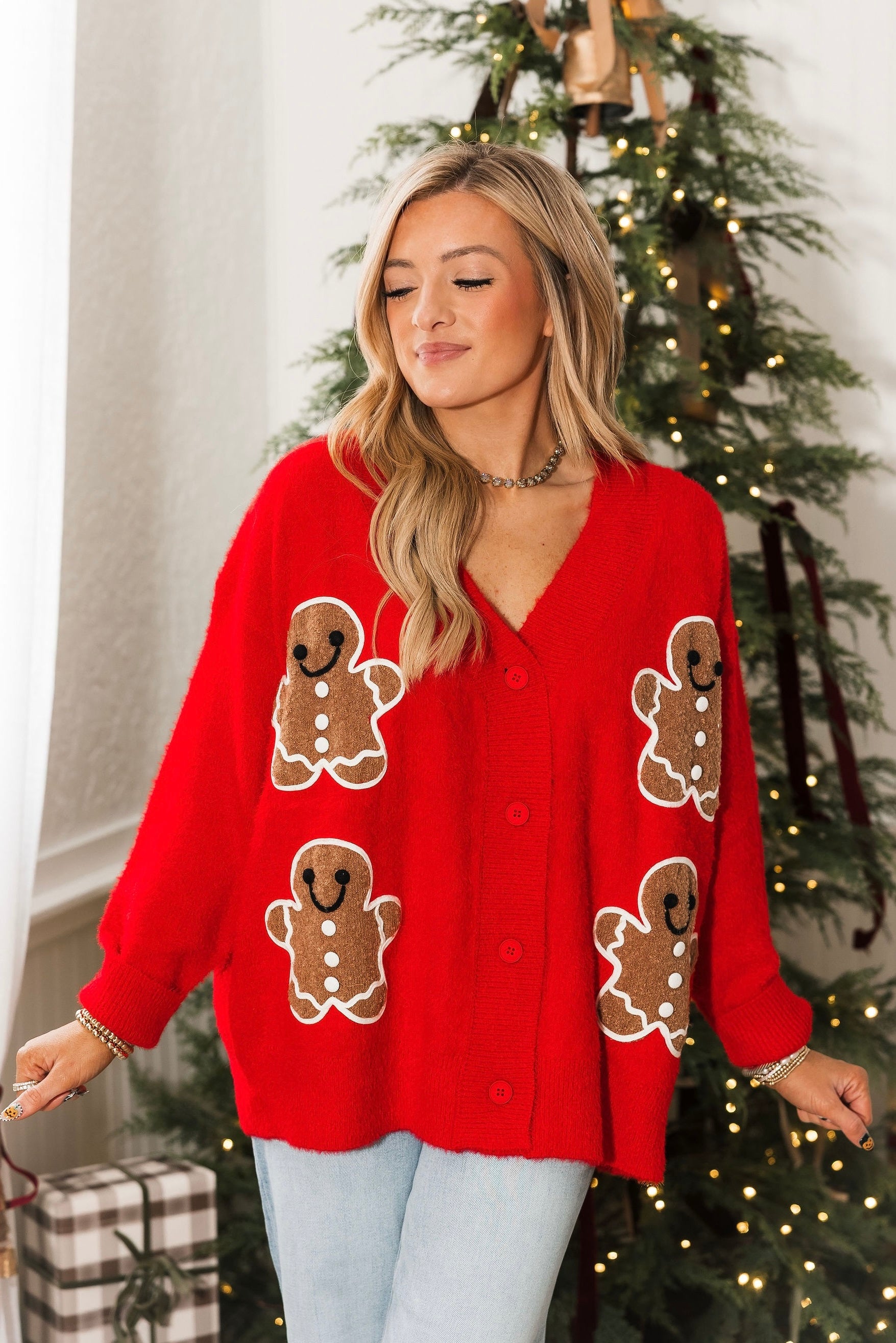 The Gingerbread Lane Cardigan is a festive favorite that brings instant cheer to your winter wardrobe. Featuring adorable gingerbread graphics, a classic V-neckline, and a relaxed fit, this button-up style layers perfectly over your favorite tee or dress. Soft, cozy, and full of holiday charm — it’s the ultimate sweater for spreading Christmas spirit! Lexi is wearing a small.