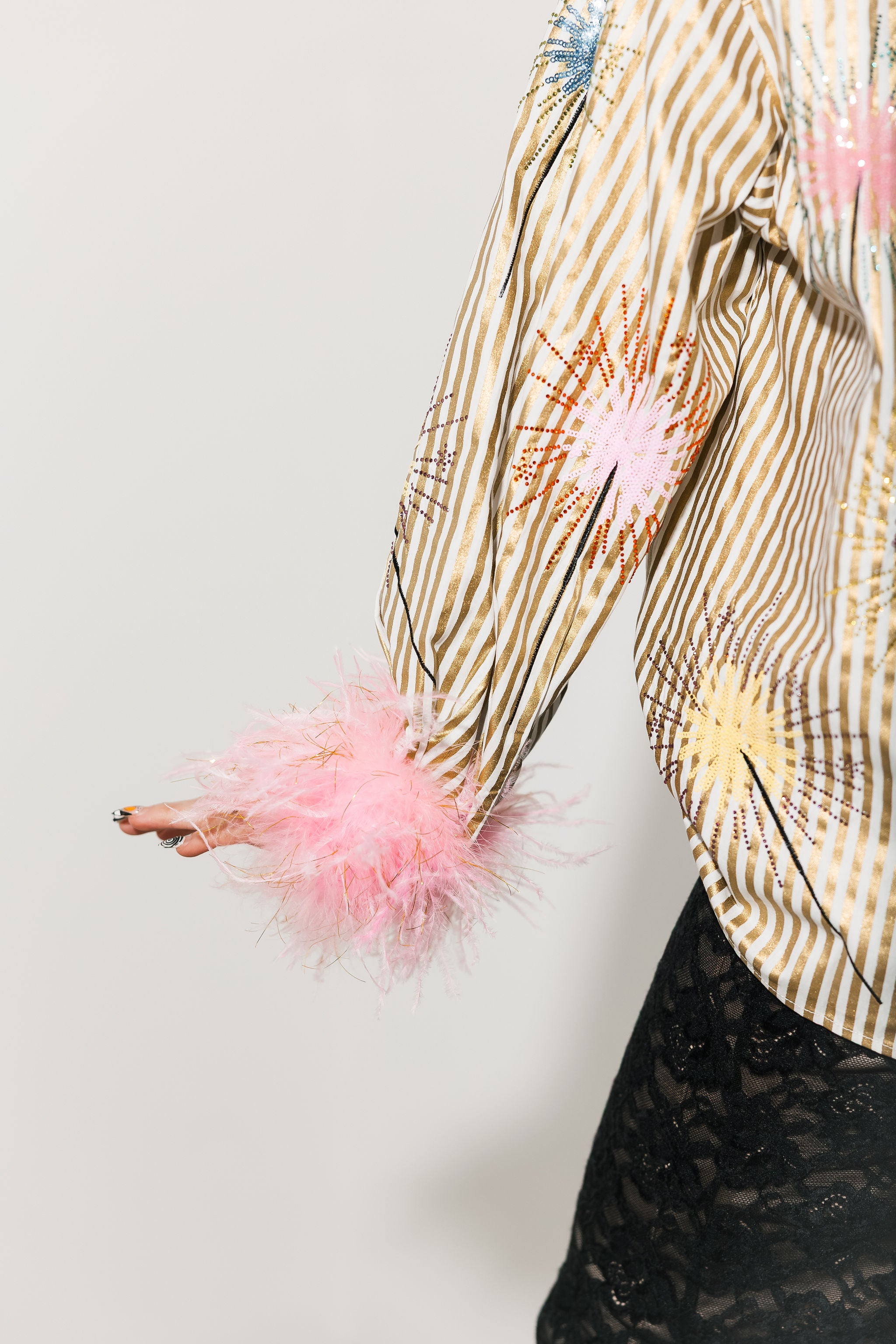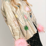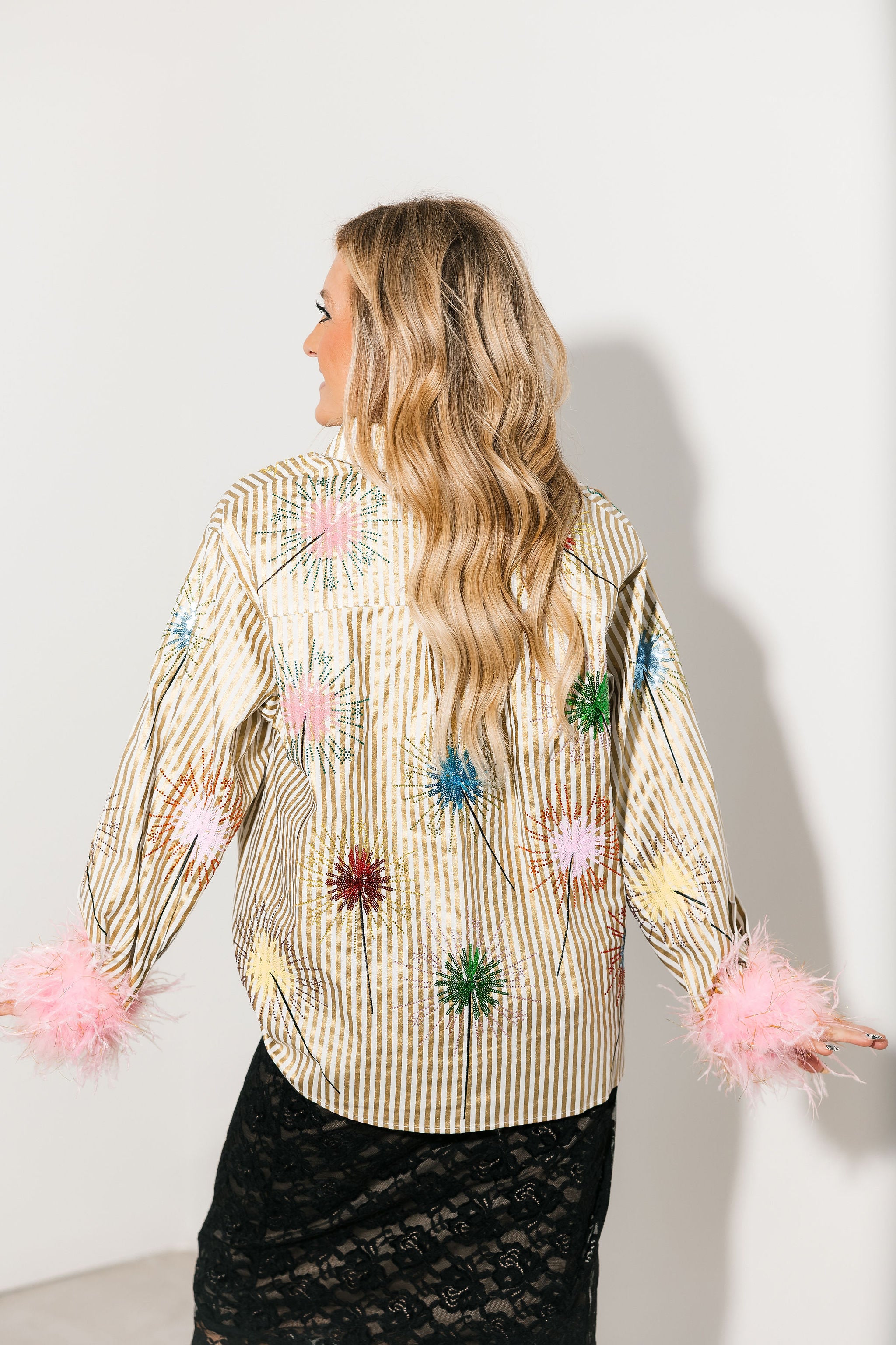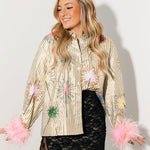 Queen Of Sparkles Gold Stripe Multi Sparkler Button Up Top With Pink Feather Sleeve