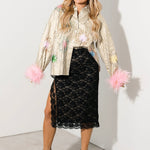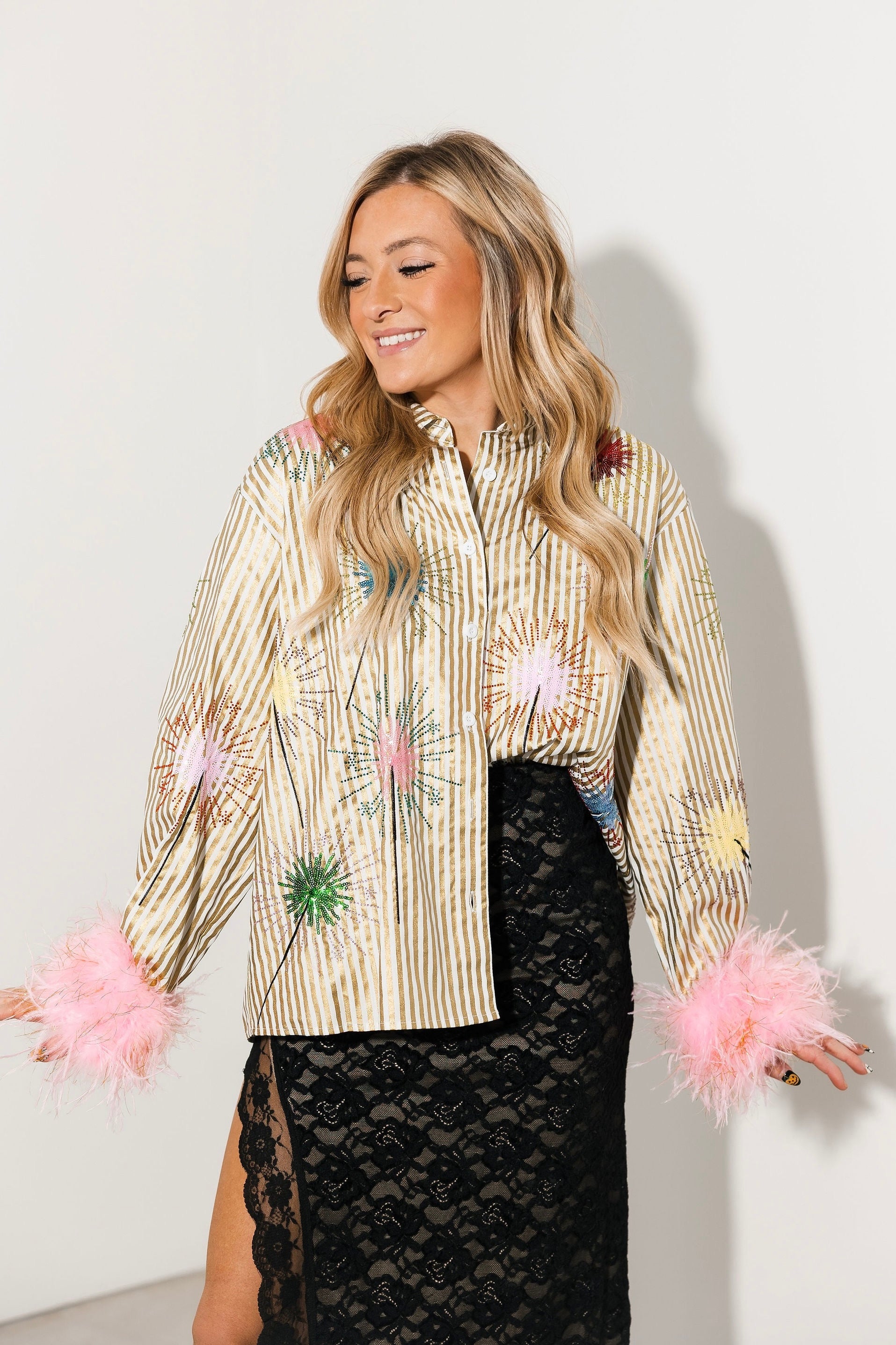 Turn heads in the Queen Of Sparkles Gold Stripe Multi Sparkler Button Up Top with Pink Feather Sleeves. With its relaxed fit, playful feather accents, and sparkling graphics, this top is a festive must-have for any celebration. Pair it with sleek black pants or the matching skirt for a full-on holiday-ready outfit. Whether you’re dancing the night away or sipping cocktails with friends, this top brings effortless glam to every occasion. Lexi Jade is wearing an XS.