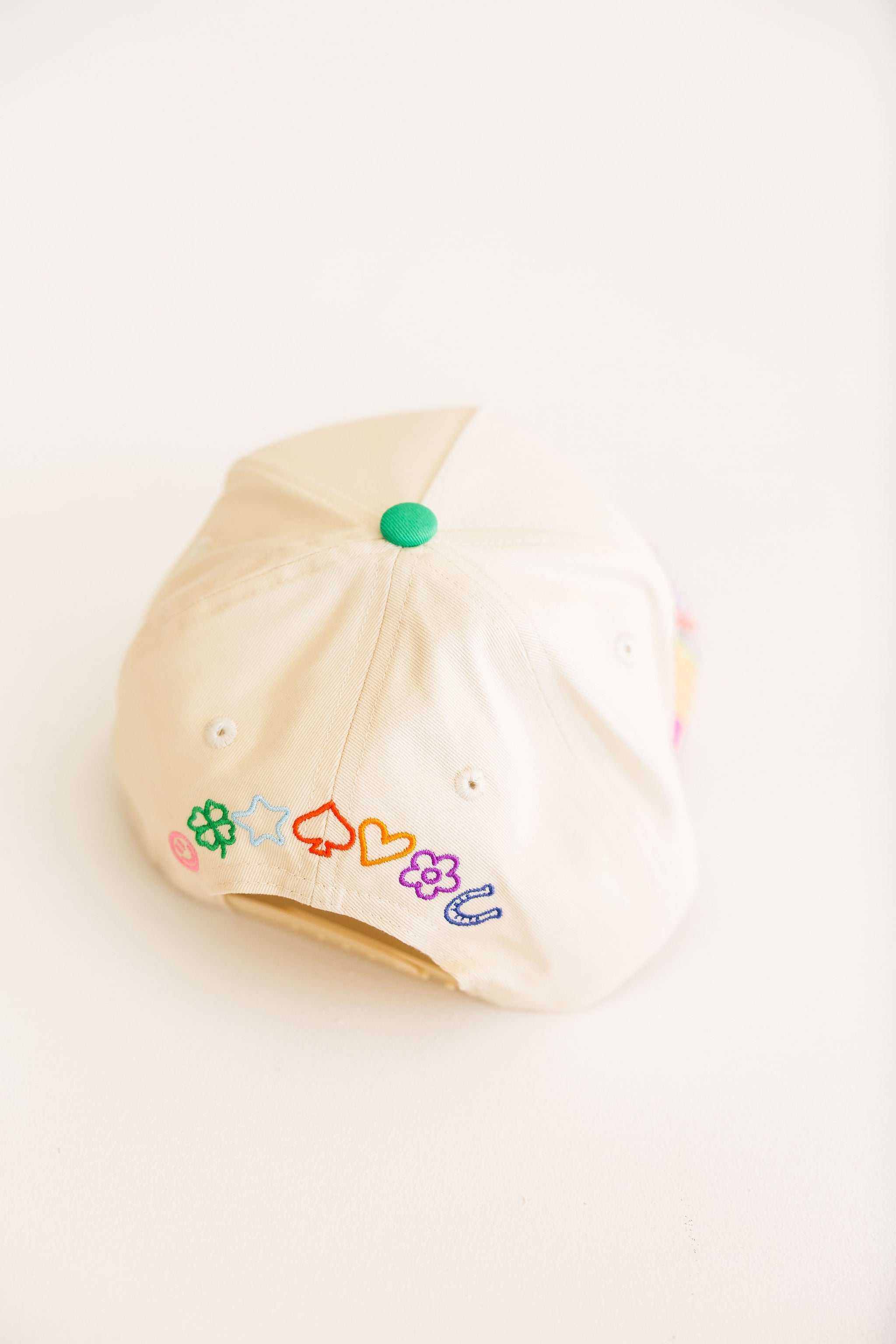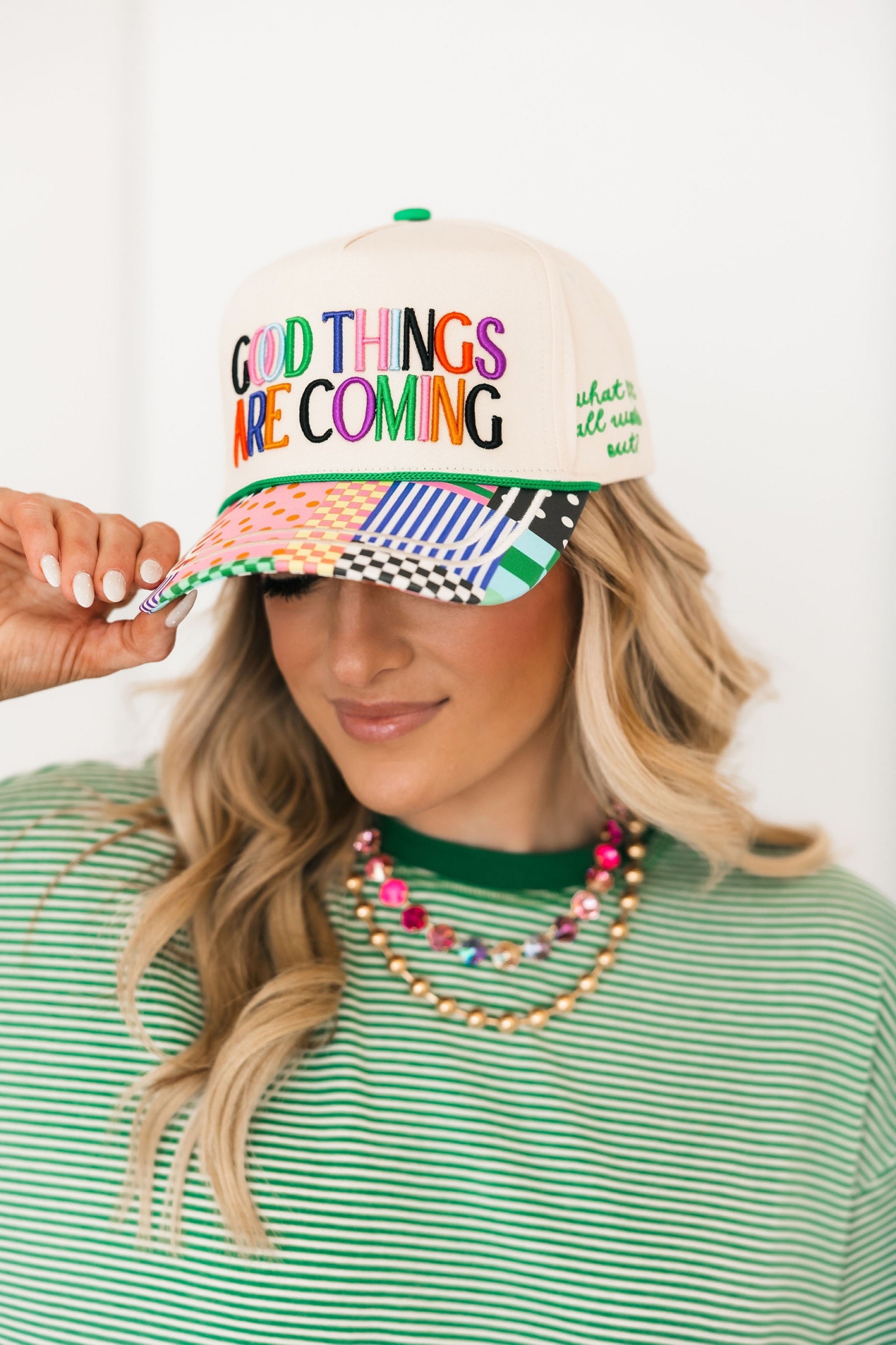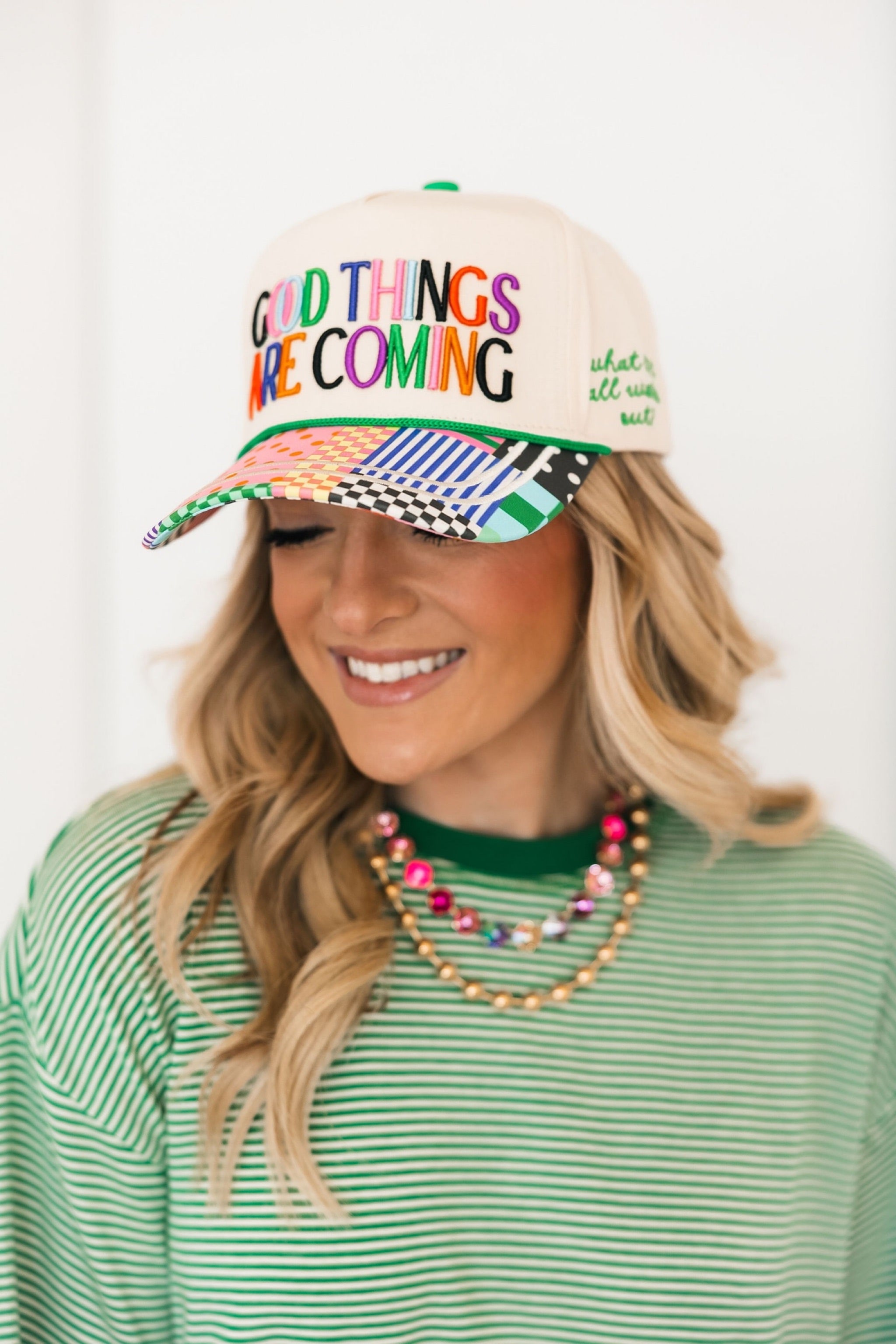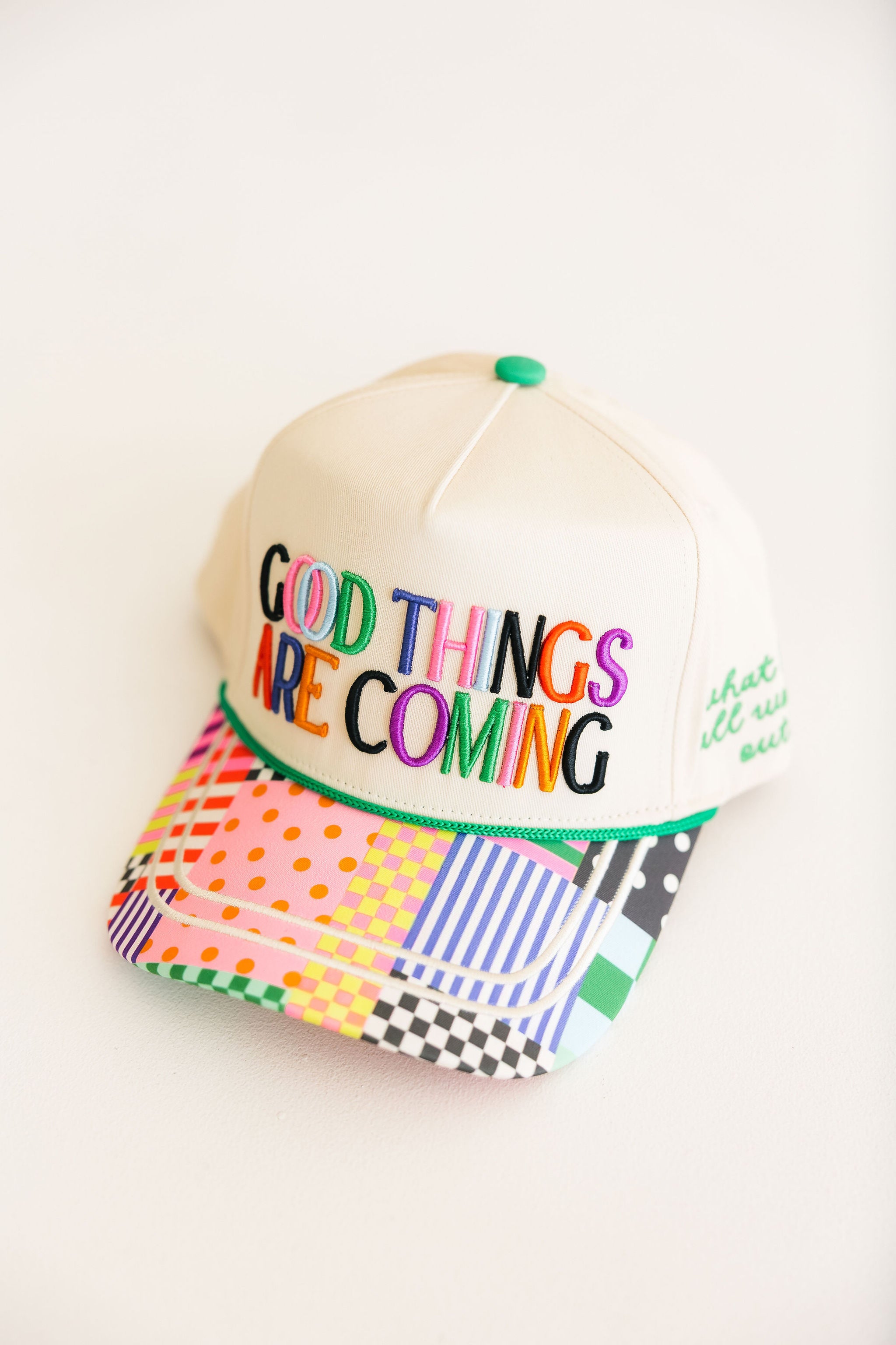 The Good Things Are Coming Hat is full of color featuring a patchwork bill and embroidered detailing. The perfect touch to any outfit.
