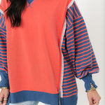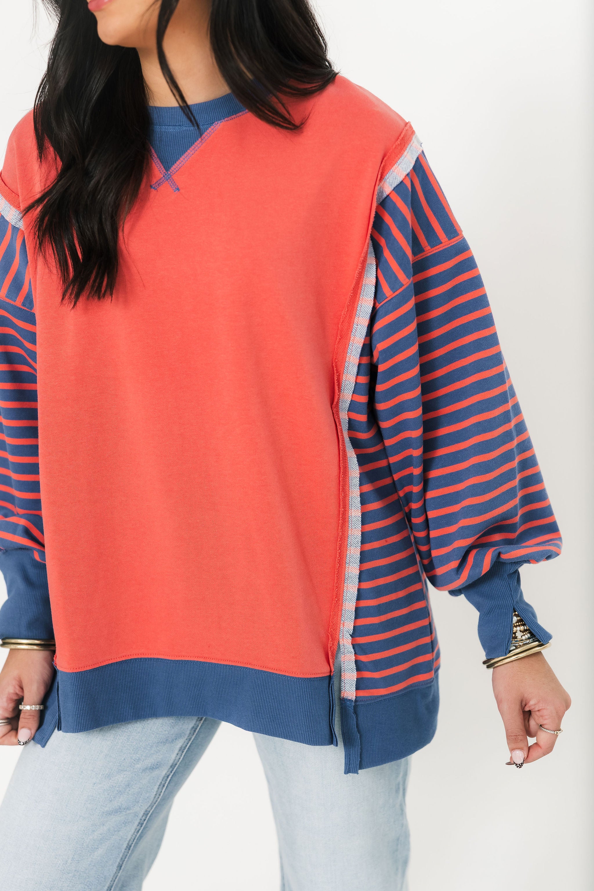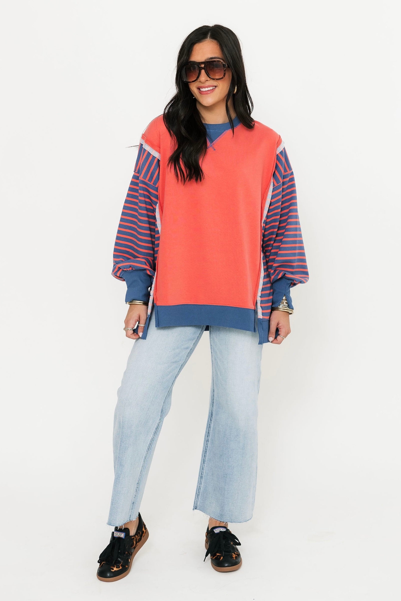 The Good Vibes Crew In Coral is made for easy, laid-back style. Designed with a relaxed oversized fit, this top features a classic round neckline, drop shoulders, front and sleeve slits, and a hi-lo hem for that little extra edge. Pair it with leggings or denim for an off-duty look that still feels put-together. Sage is wearing a small.