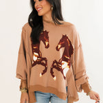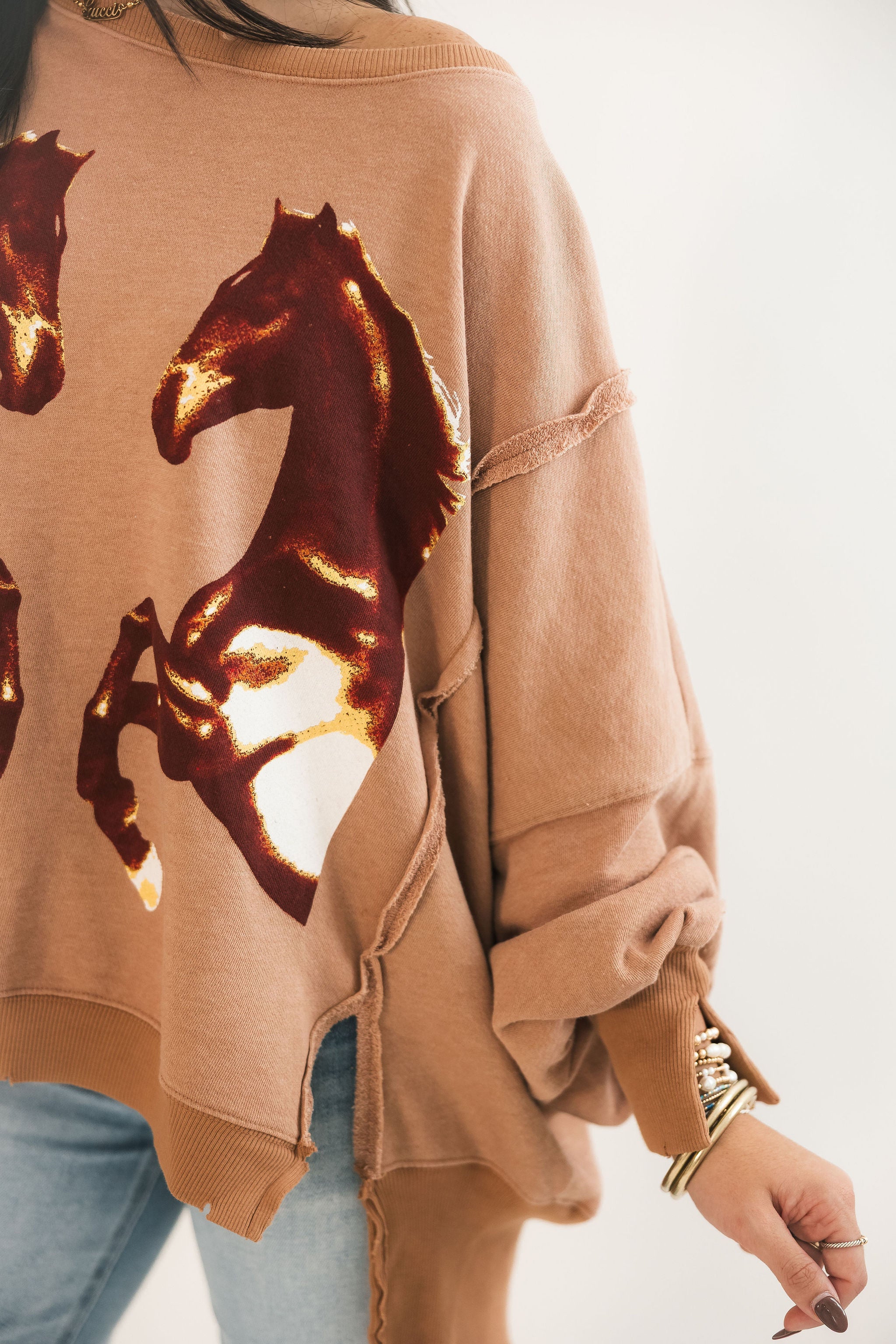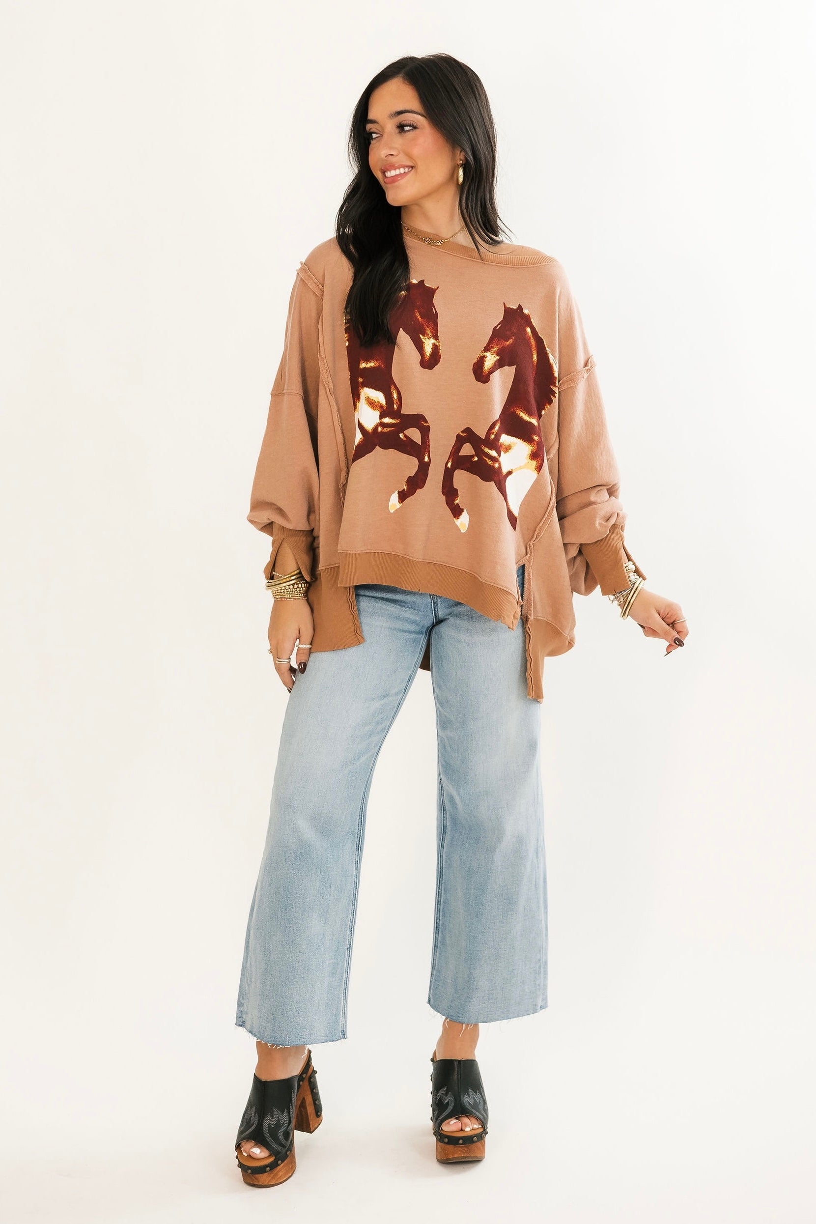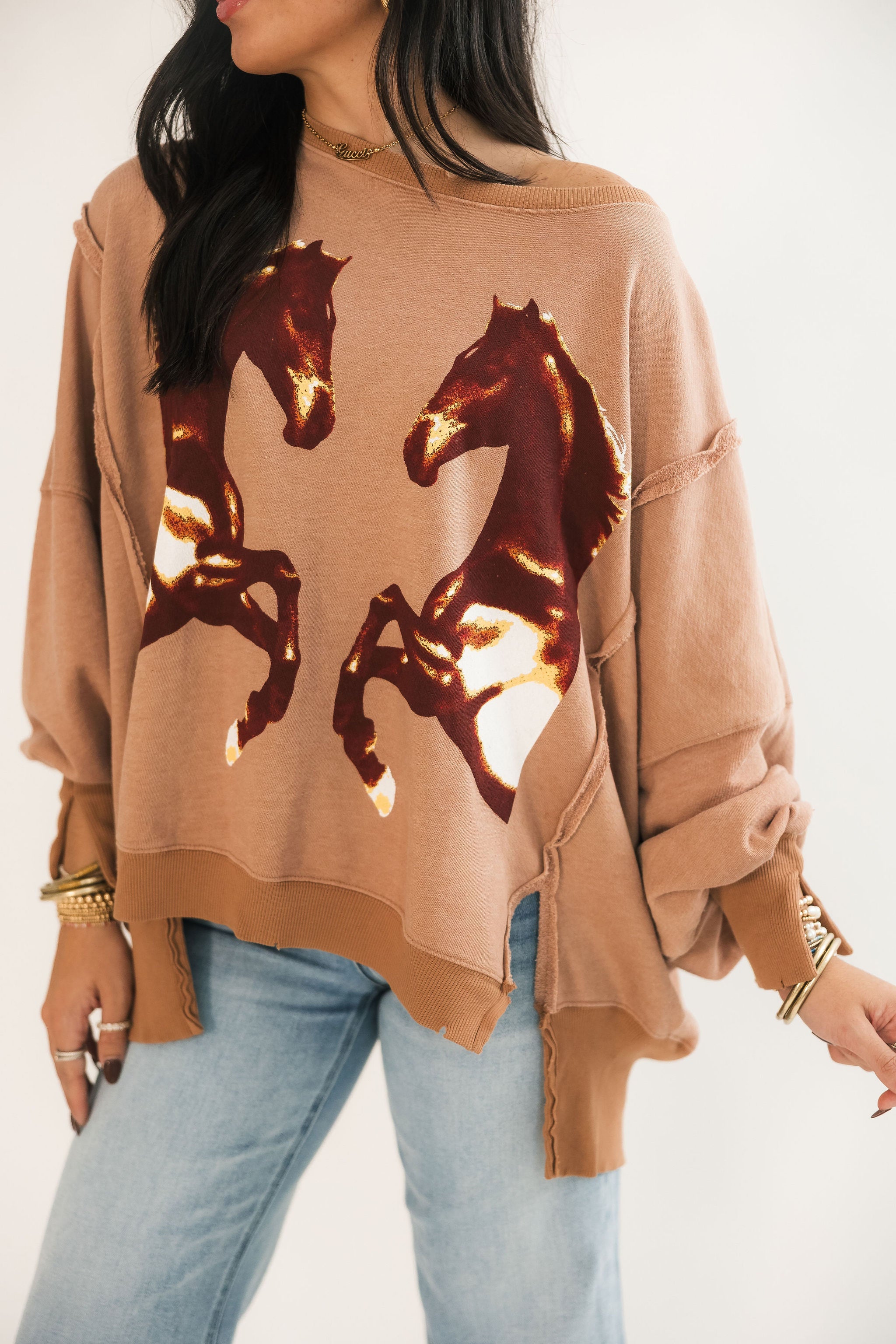 Just as cool as it is classic, this goes-with-anything long sleeve tee is featured in a slouchy, relaxed fit with worn, mirrored horse graphic at front for a true lived-in look. Sage is wearing an xs.
