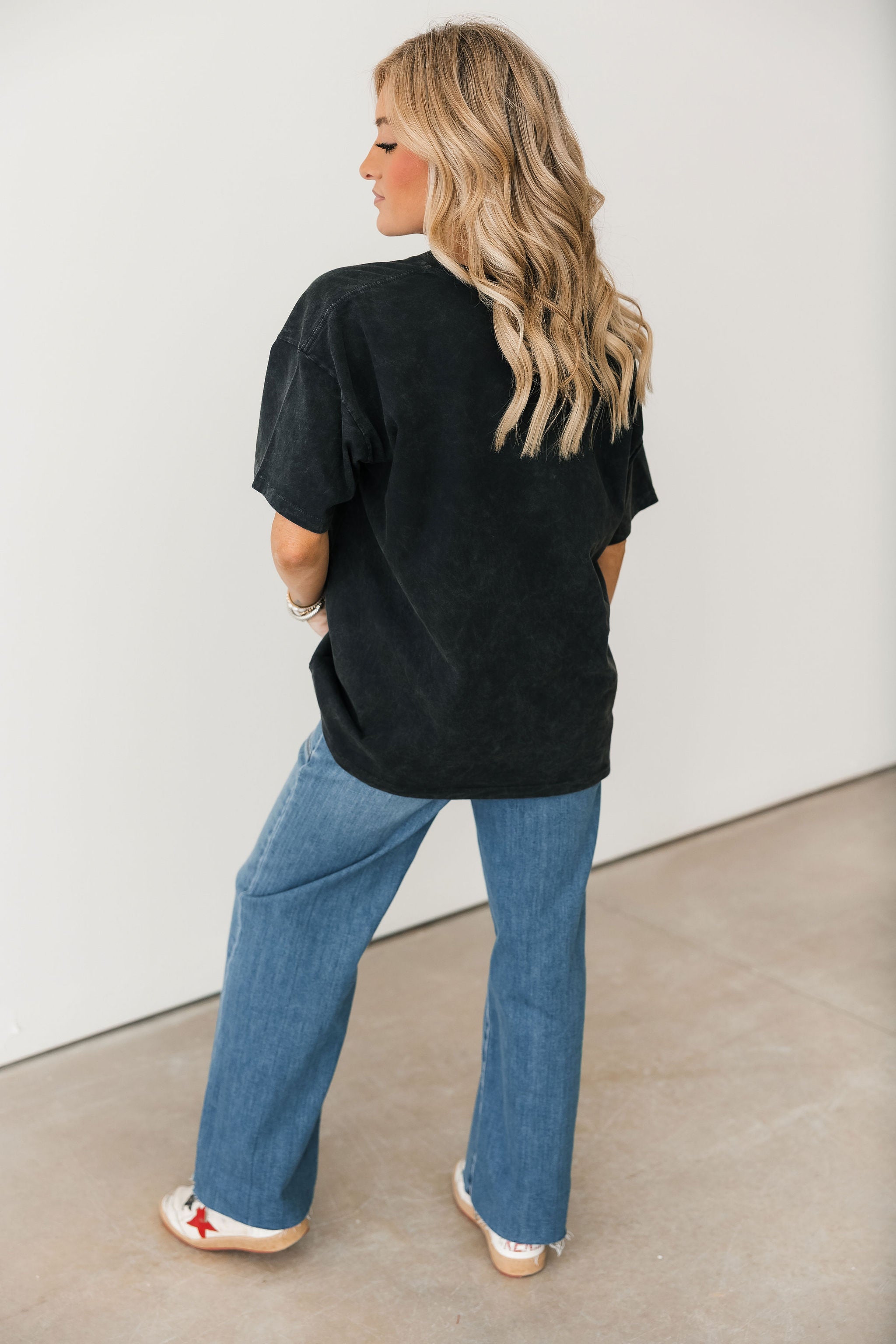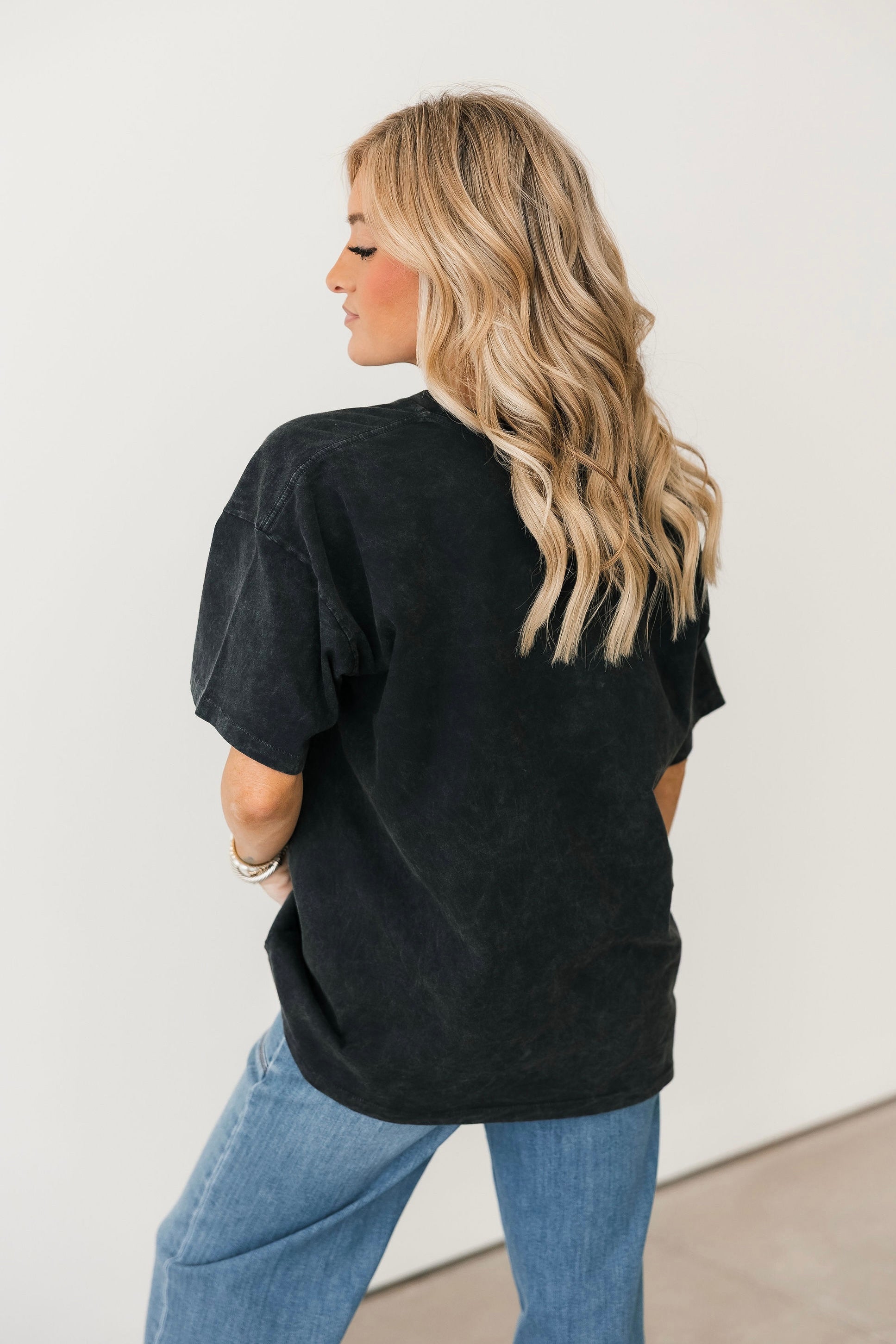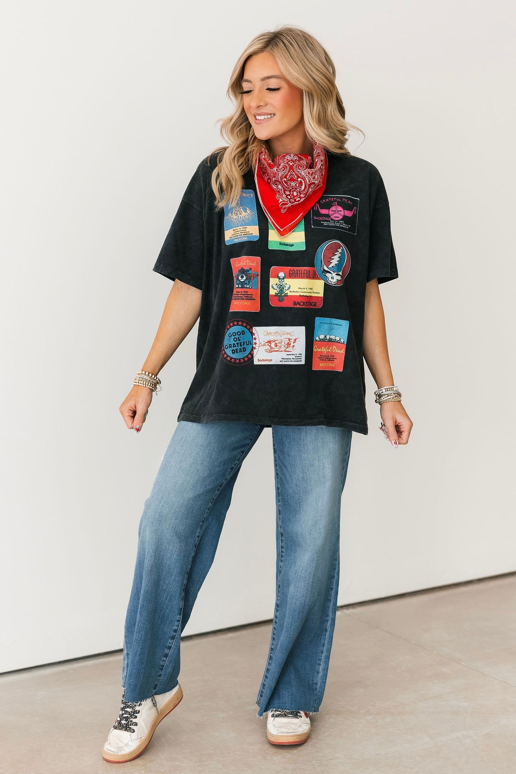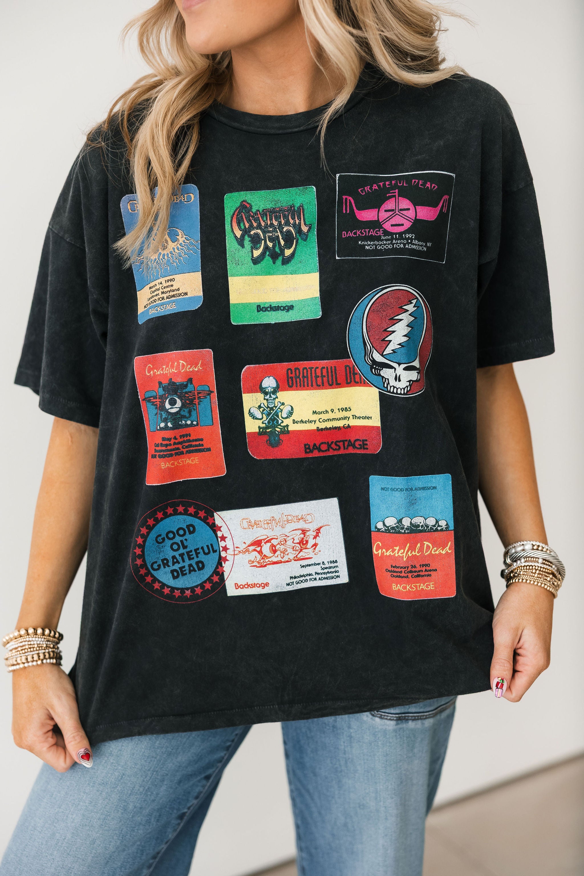 The Daydreamer Grateful Dead Backstage Merch Tee features a classic crewneck, short sleeves, and a relaxed, oversized fit. Pair it with jeans, shorts, or leggings for an easy everyday look. Lexi is wearing an xs.