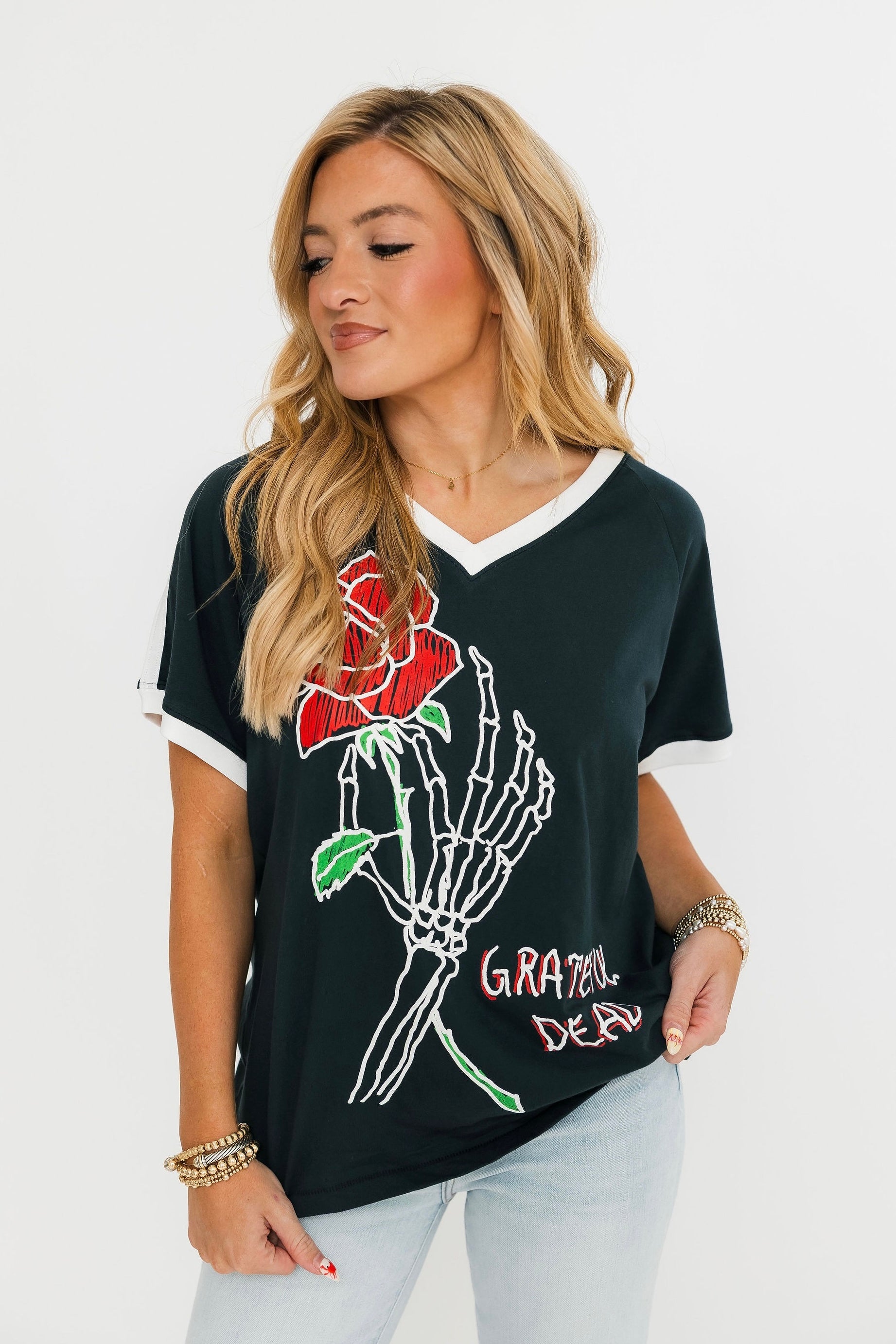 Rock your vintage vibes with this relaxed tee from Daydreamer. Featuring a Grateful Dead-inspired skeleton and rose graphic, a flattering V-neck, and short sleeves, it’s an easy way to add iconic band style to your everyday wardrobe. Lexi is wearing a small.