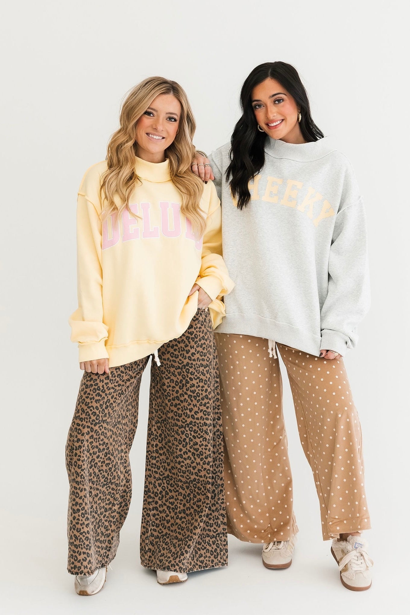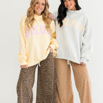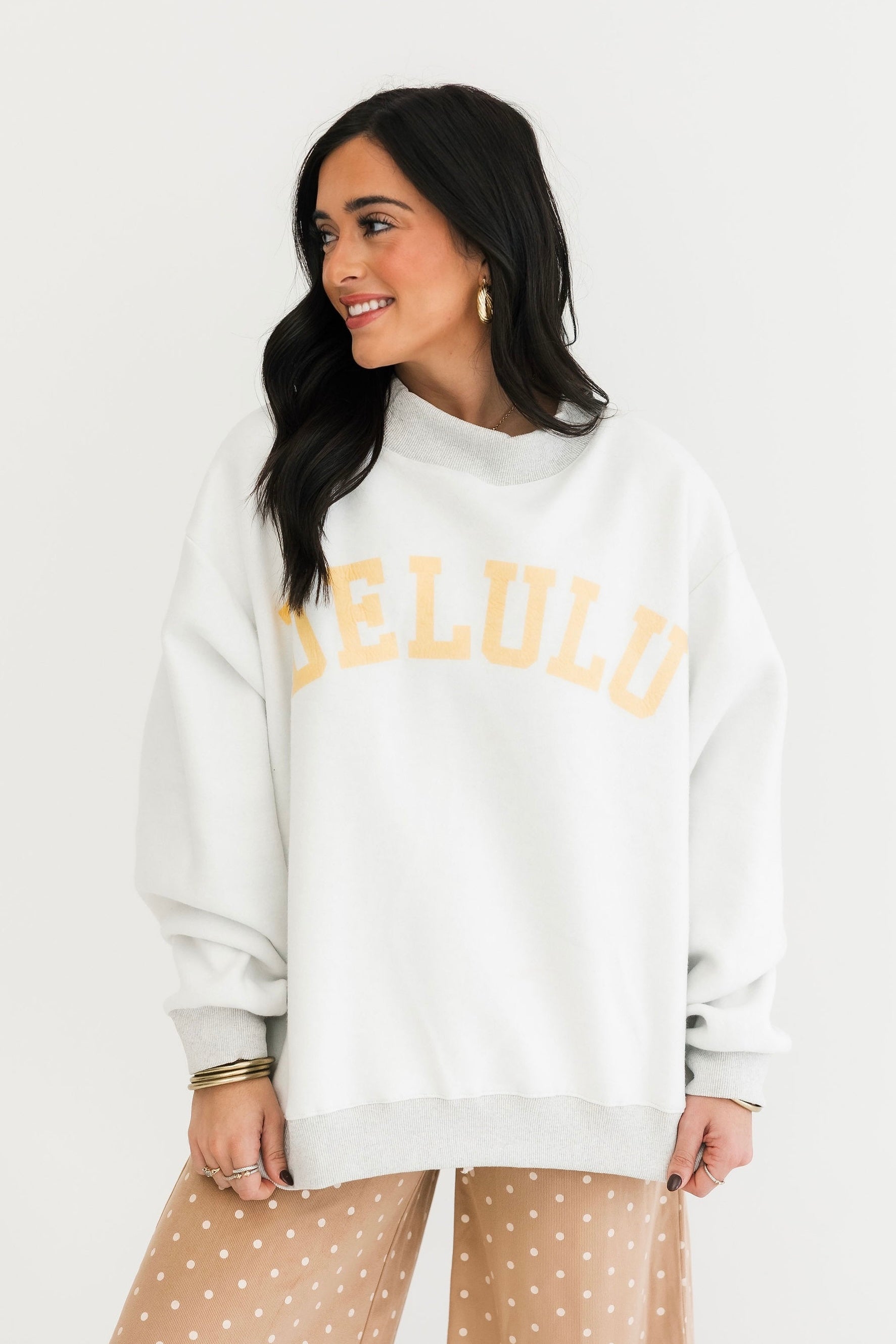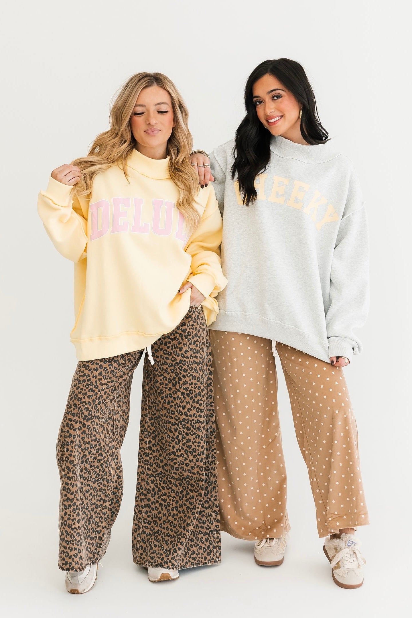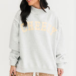 The Gray Reversible Mock Neck Sweatshirt in Cheeky Delulu features an oversized silhouette with a cozy mock neck, dropped shoulders, and rib-banded hem and cuffs. Made from ultra-soft fleece, it’s fully reversible for double the wear and endless outfit options. The perfect blend of comfort and personality. Sage is wearing a S/M.