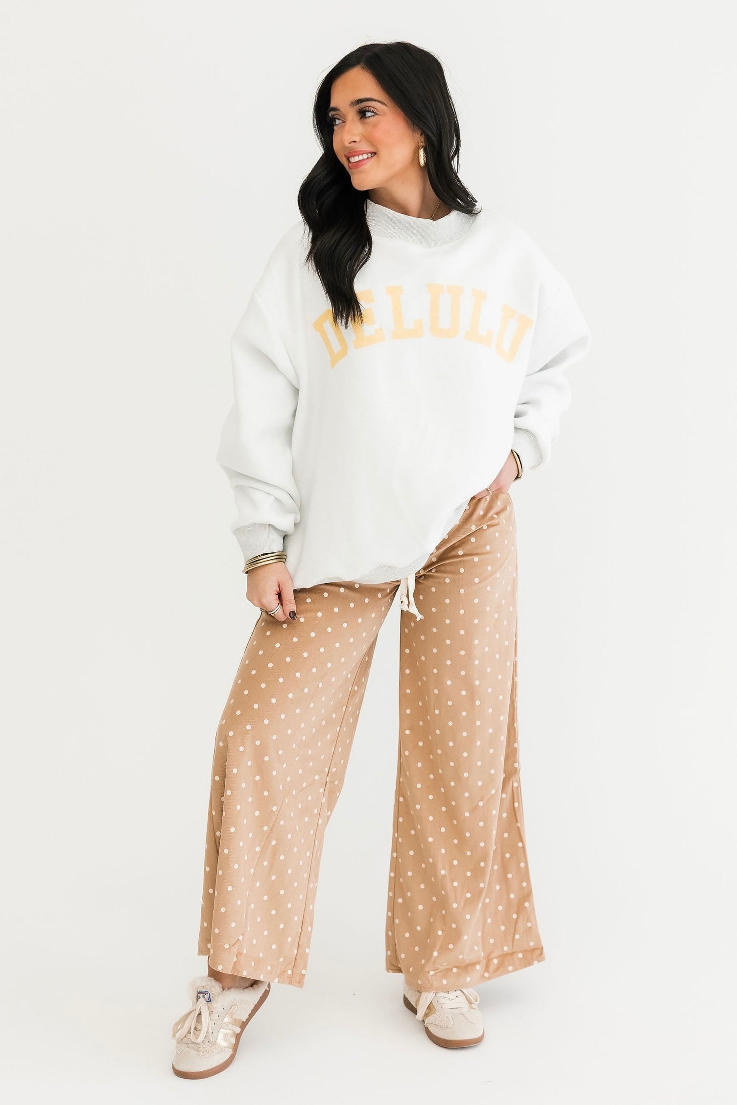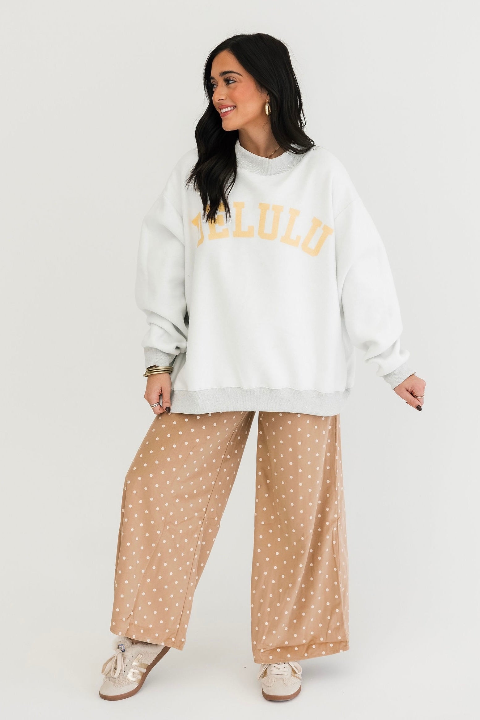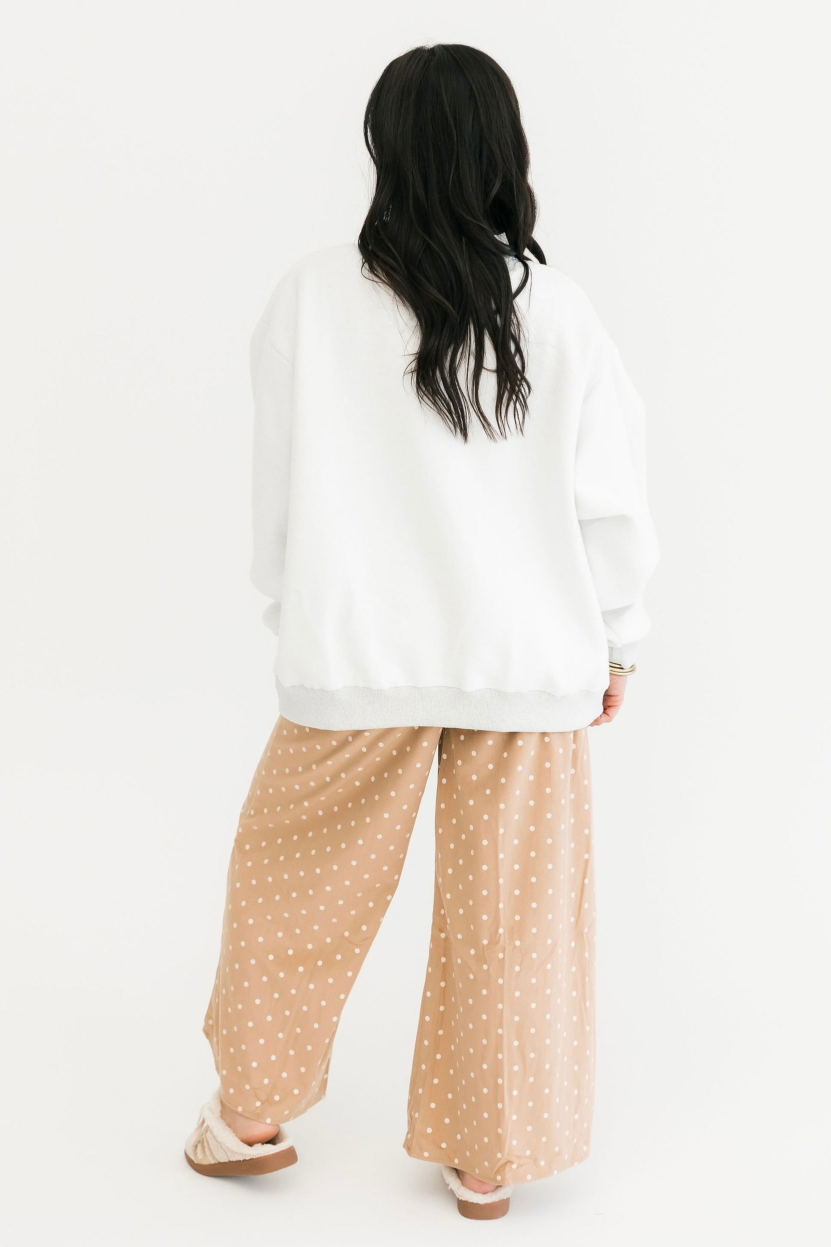 The Gray Reversible Mock Neck Sweatshirt in Cheeky Delulu features an oversized silhouette with a cozy mock neck, dropped shoulders, and rib-banded hem and cuffs. Made from ultra-soft fleece, it’s fully reversible for double the wear and endless outfit options. The perfect blend of comfort and personality. Sage is wearing a S/M.
