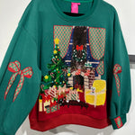 The Queen Of Sparkles Green Christmas Living Room Sweatshirt with Bow Sleeves is a cozy holiday essential with a relaxed fit and classic crewneck design. Featuring long sleeves with playful bow accents and a charming Christmas living room graphic, it pairs perfectly with leggings or your favorite festive bottoms. Wear it alone for a relaxed holiday vibe or style it with other Queen Of Sparkles pieces for a full-on festive look.