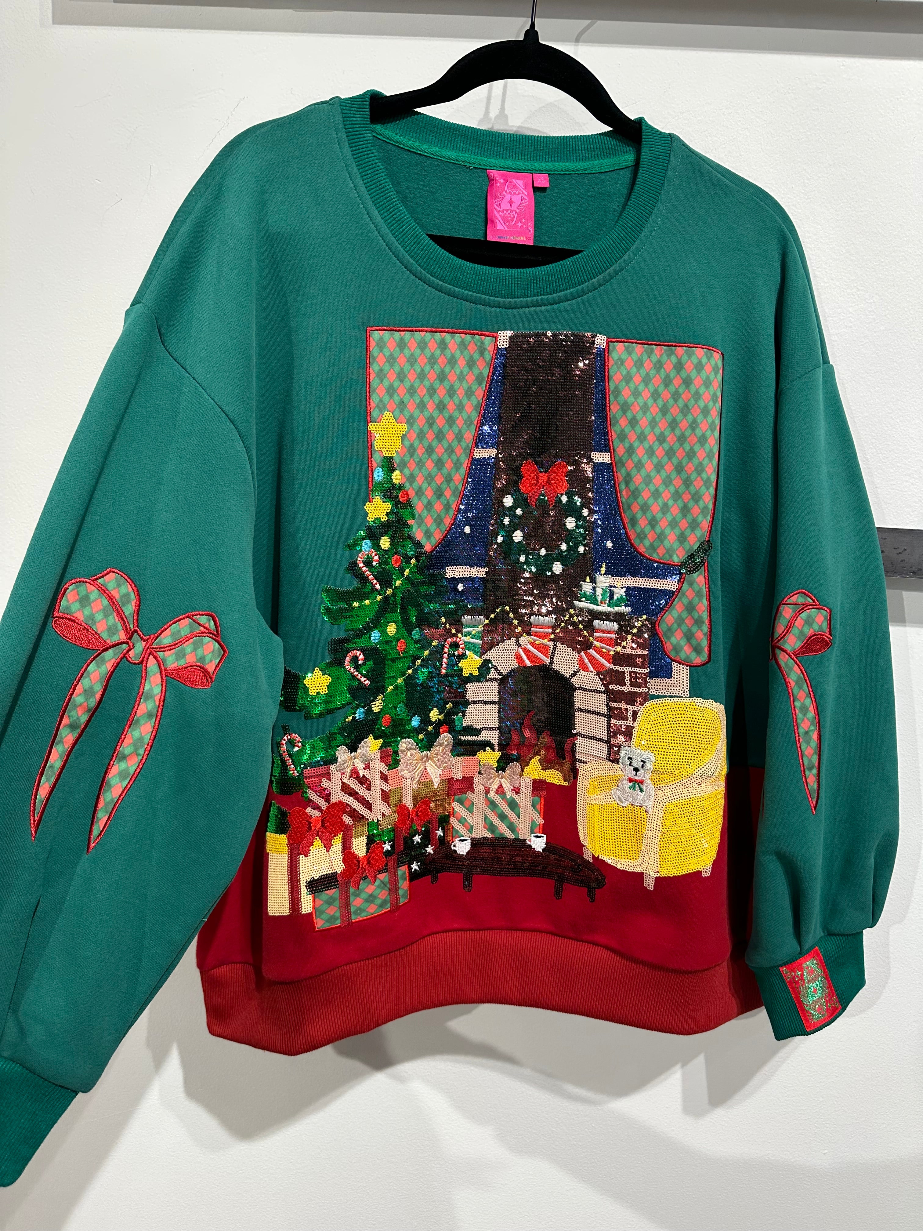 Green Christmas Living Room Sweatshirt With Bow Sleeves | Queen Of Sparkles