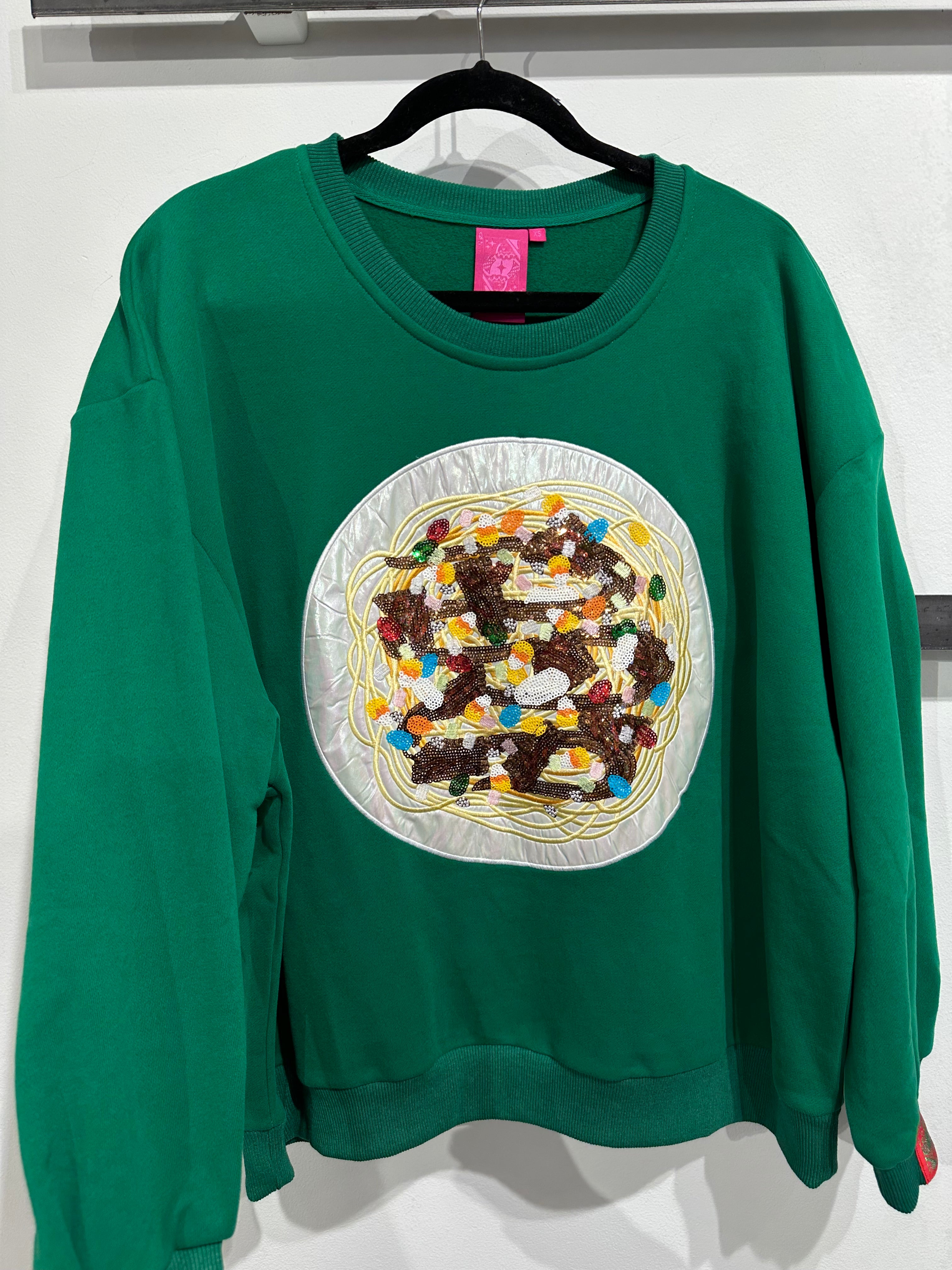 The Queen Of Sparkles Green Elf Spaghetti Sweatshirt features a relaxed fit with a classic crewneck and long sleeves. Decorated with a sparkling graphic inspired by the iconic elf spaghetti scene, this cozy piece is perfect for holiday parties, casual gatherings, or adding a fun, whimsical touch to your festive outfits.