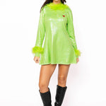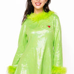 The Queen Of Sparkles Green Full Sequin Feather Trim Grinch Heart Dress features a relaxed fit with long sleeves and feather-trim detailing. Covered in shimmering sequins and accented with tiny Grinch hearts, this mini dress brings bold holiday cheer to any gathering. Perfect for festive parties, photos, or adding a whimsical touch to your seasonal wardrobe.