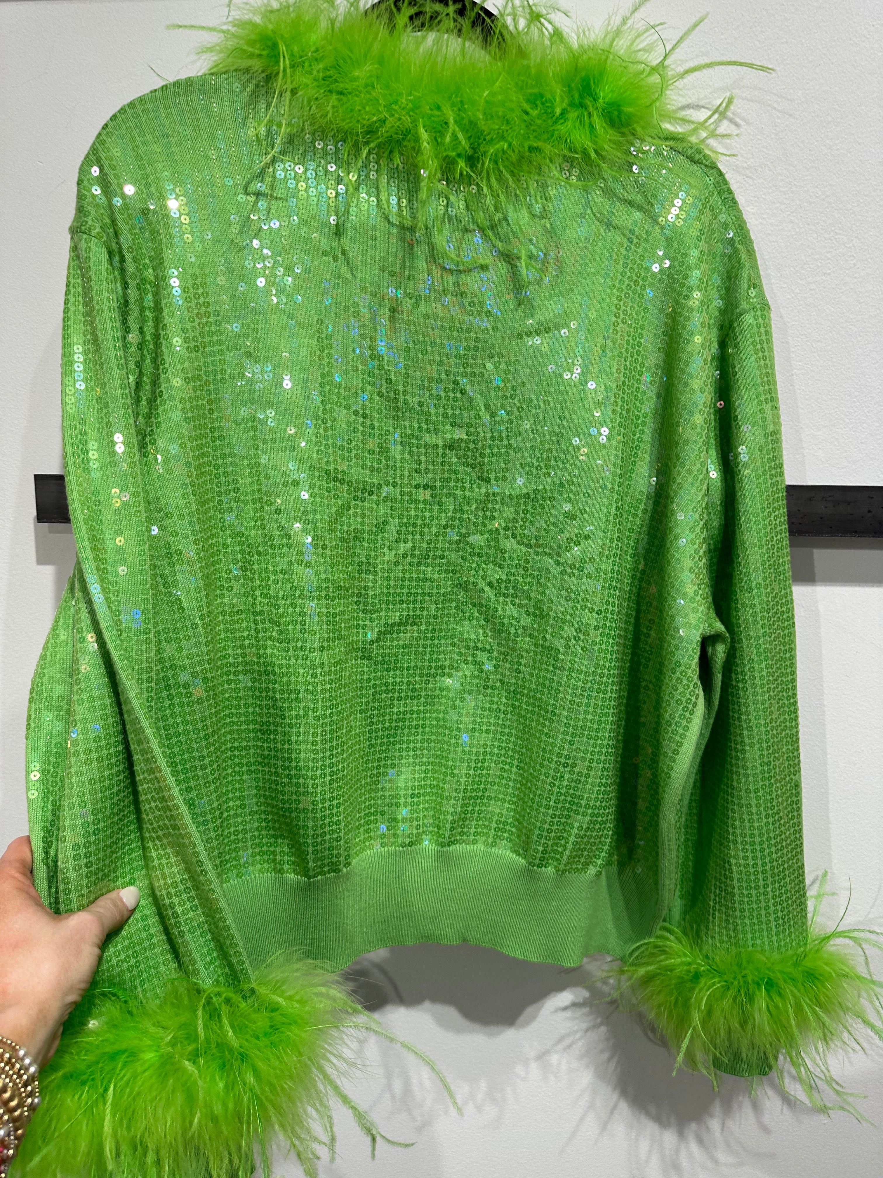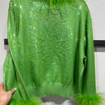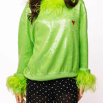 Queen Of Sparkles Green Full Sequin Feather Trim Grinch Heart Sweater