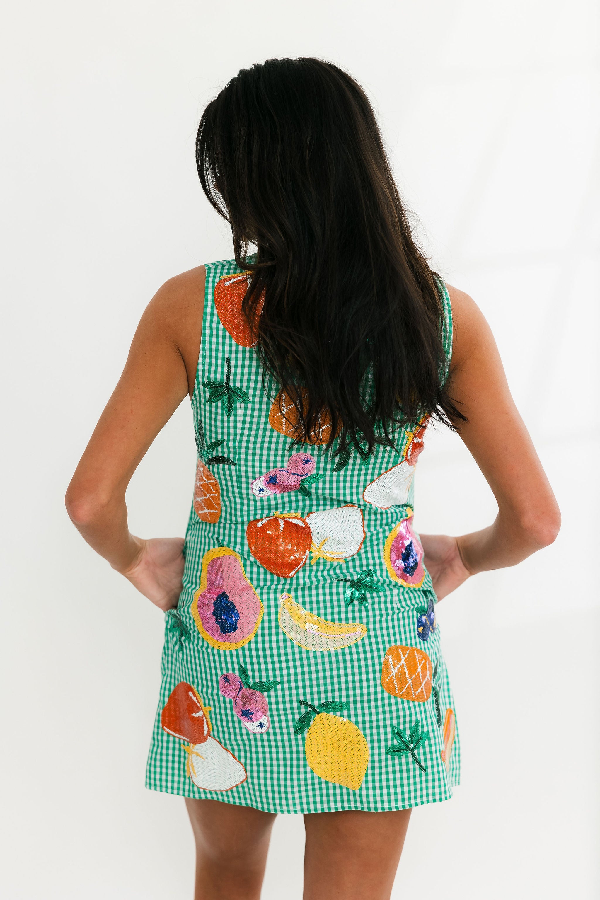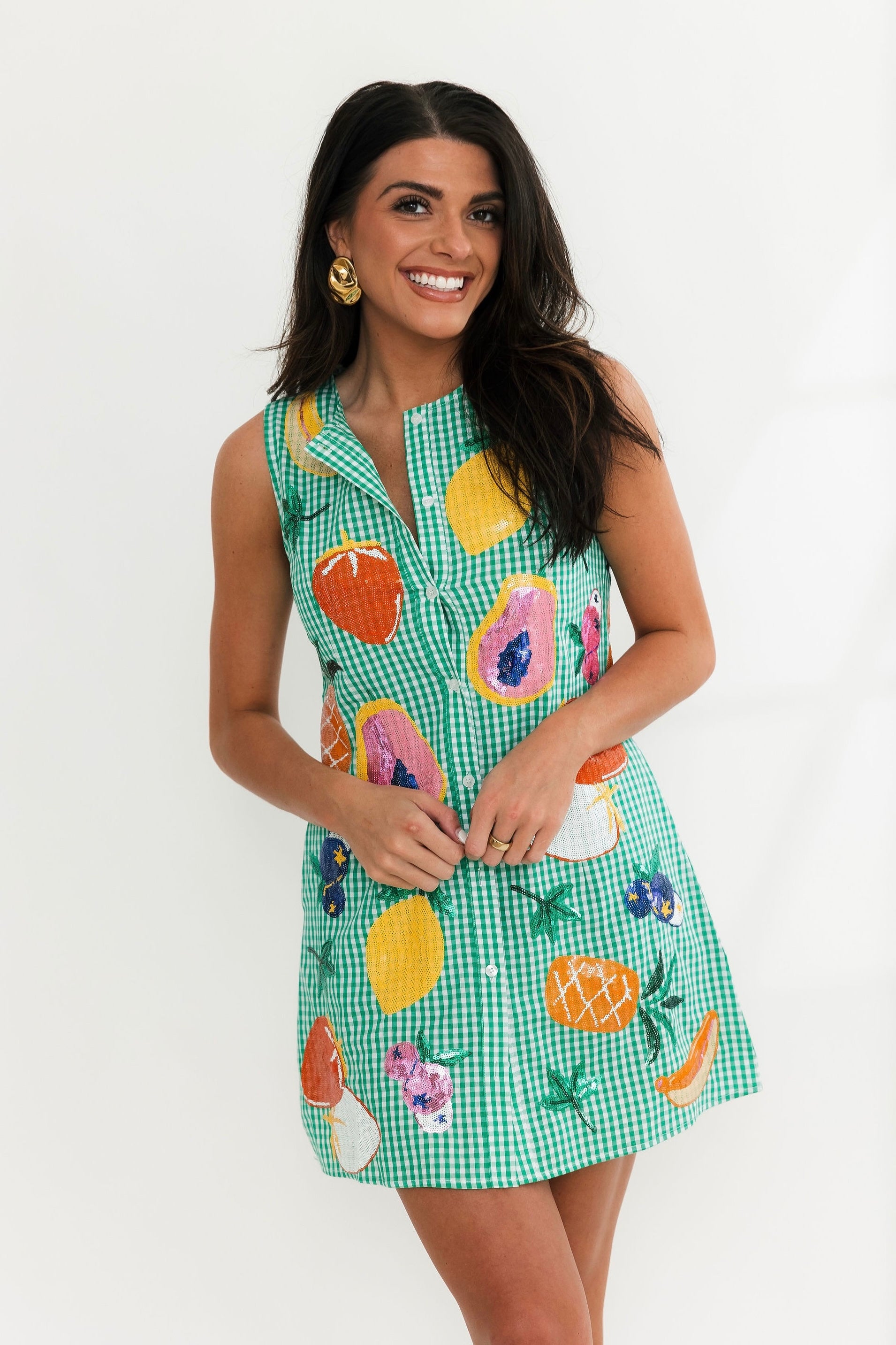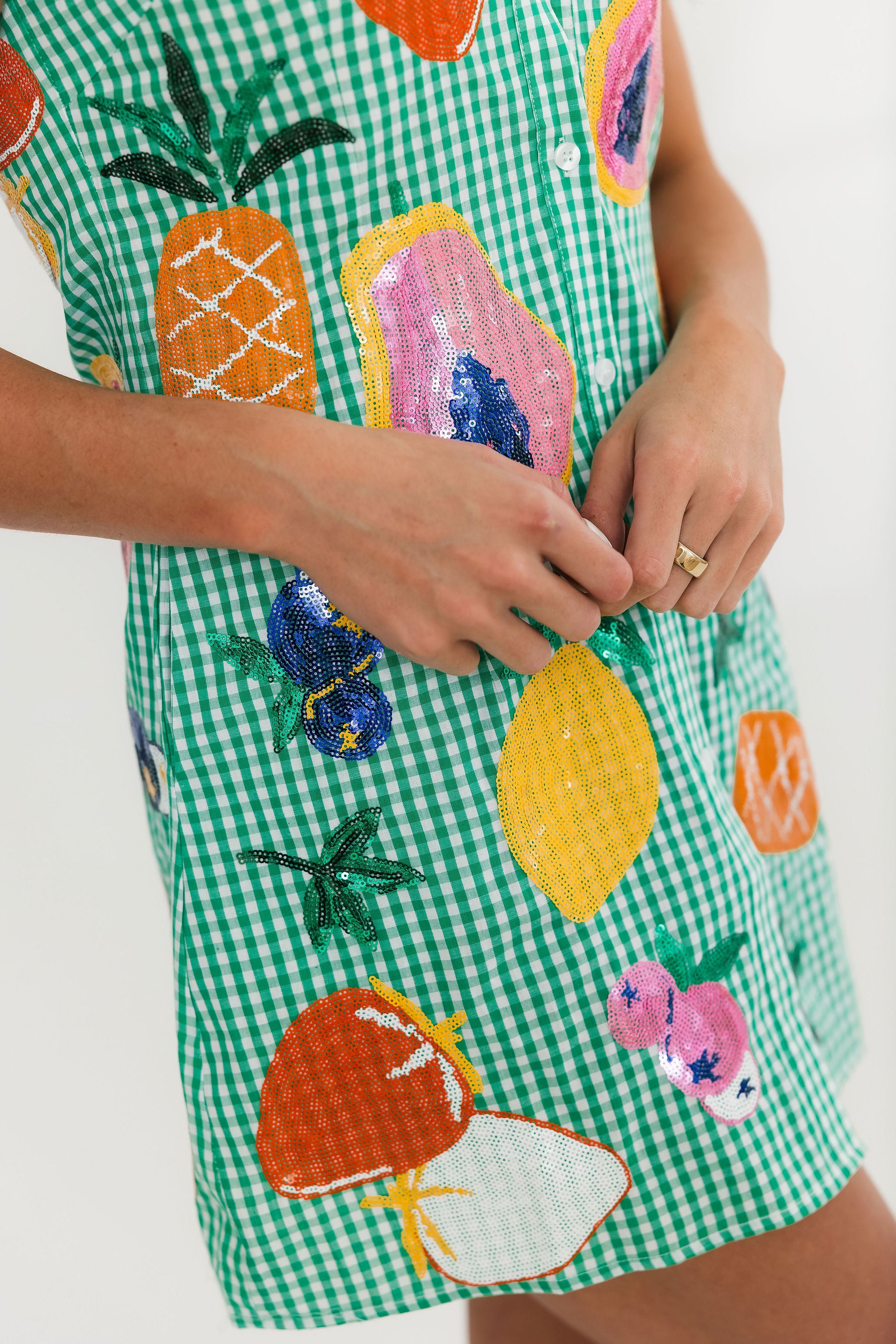 Queen Of Sparkles Green Gingham Fruit Button Up Tank Dress