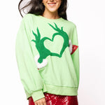 The Queen Of Sparkles Green Grinch Heart Hands Sweatshirt features a relaxed fit with a classic crewneck and long sleeves. Adorned with a sparkling Grinch heart hands graphic, this cozy piece is perfect for holiday parties, casual gatherings, or adding a fun, whimsical touch to your seasonal style.