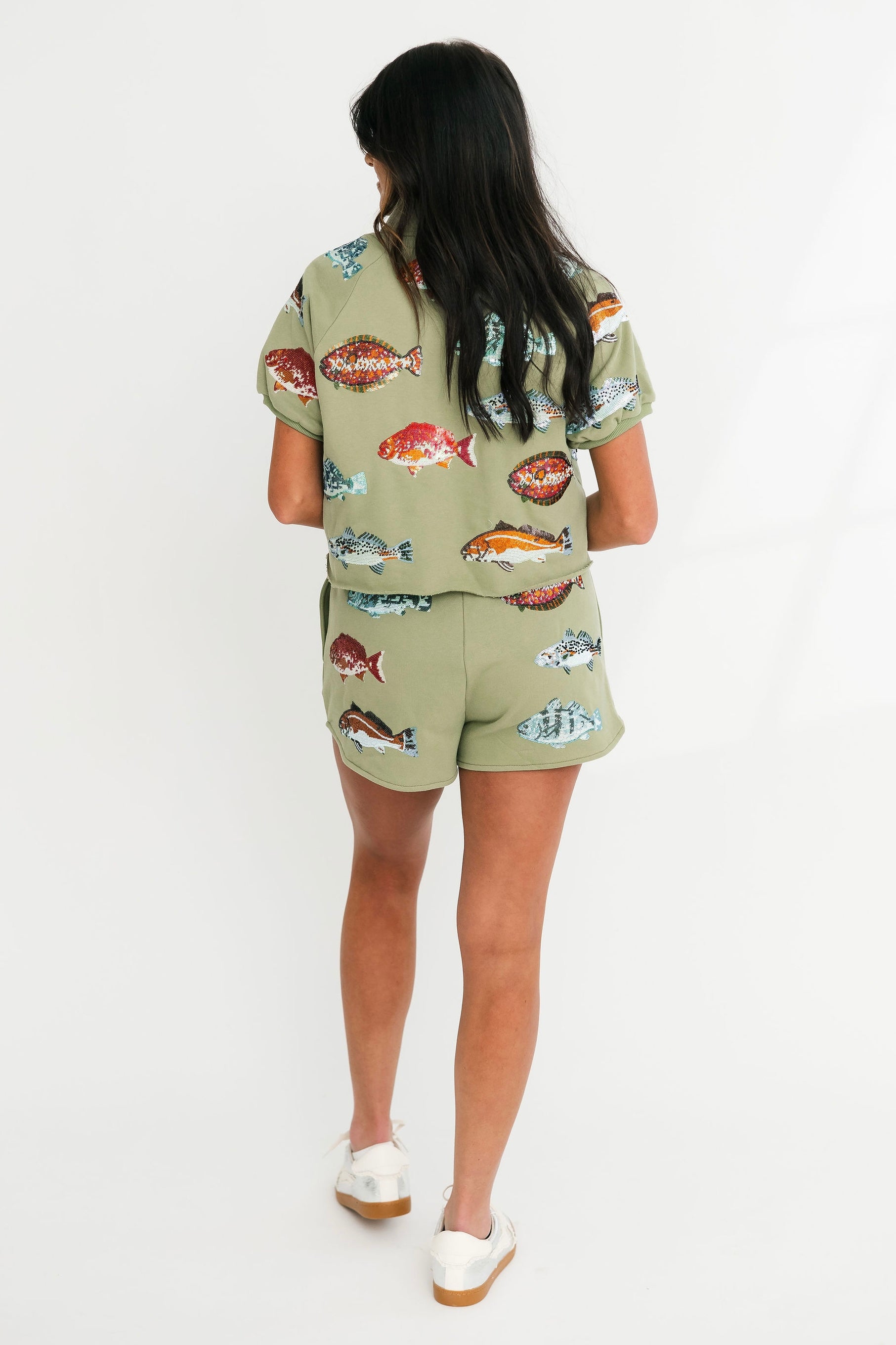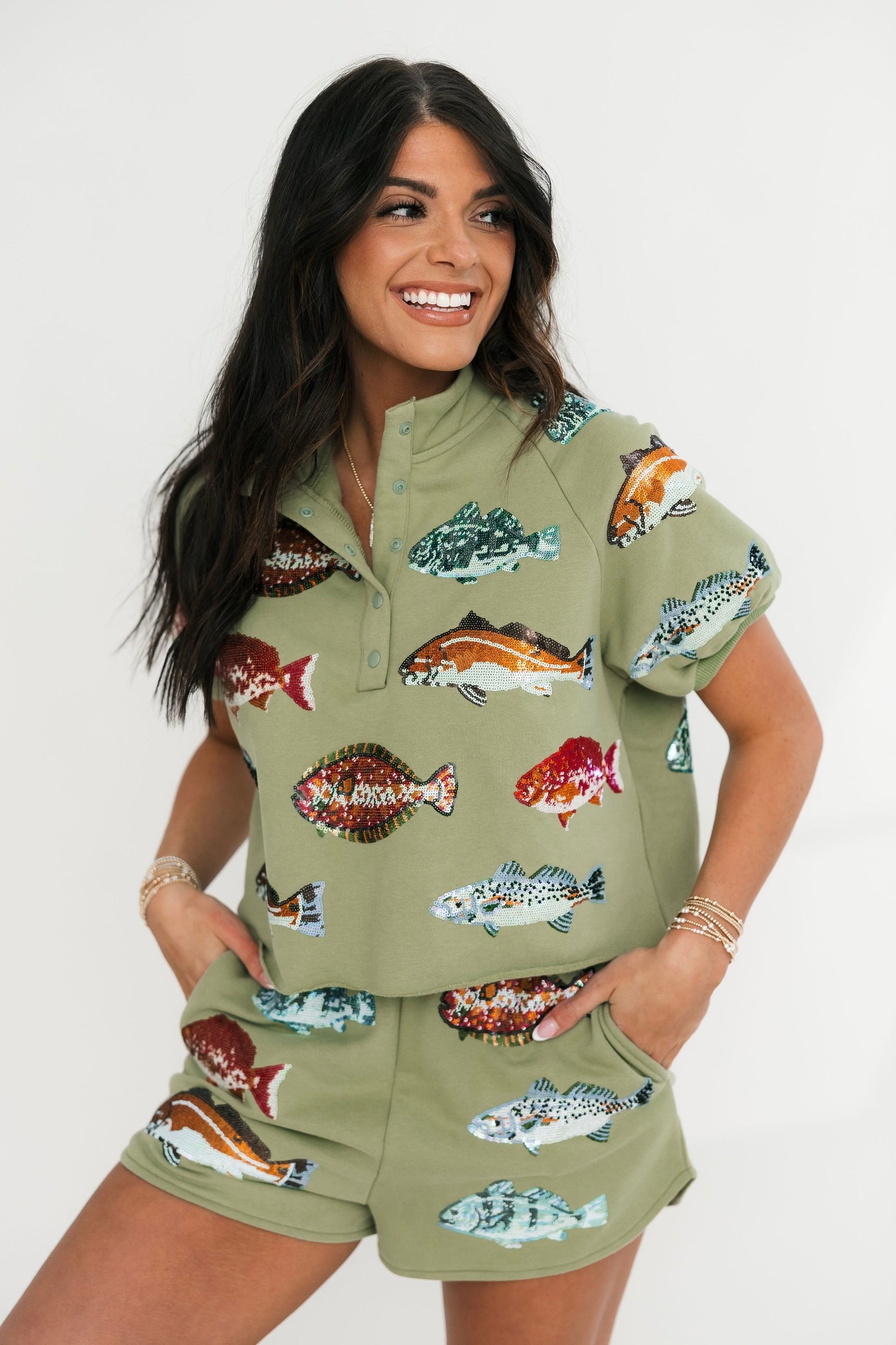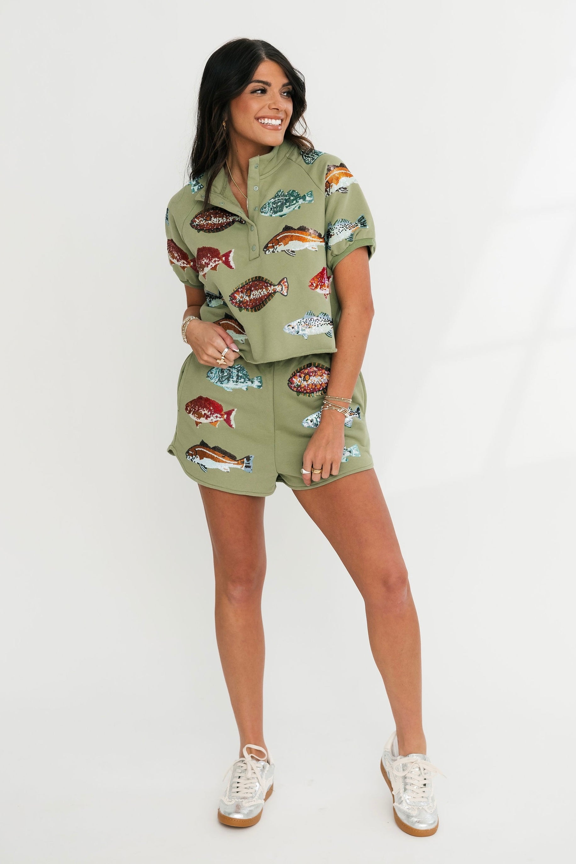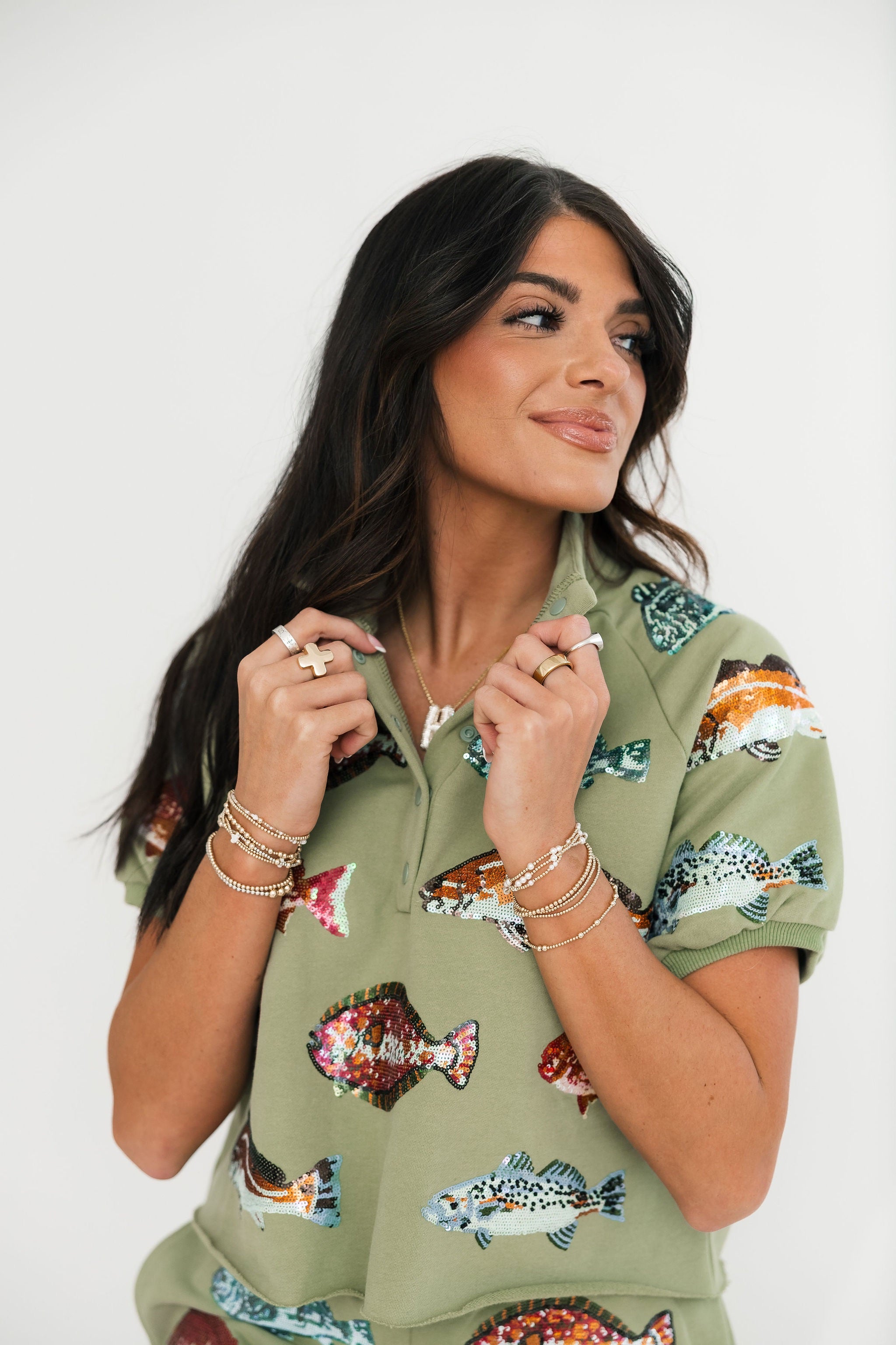 Green Multi Fish Henley Top | Queen Of Sparkles