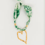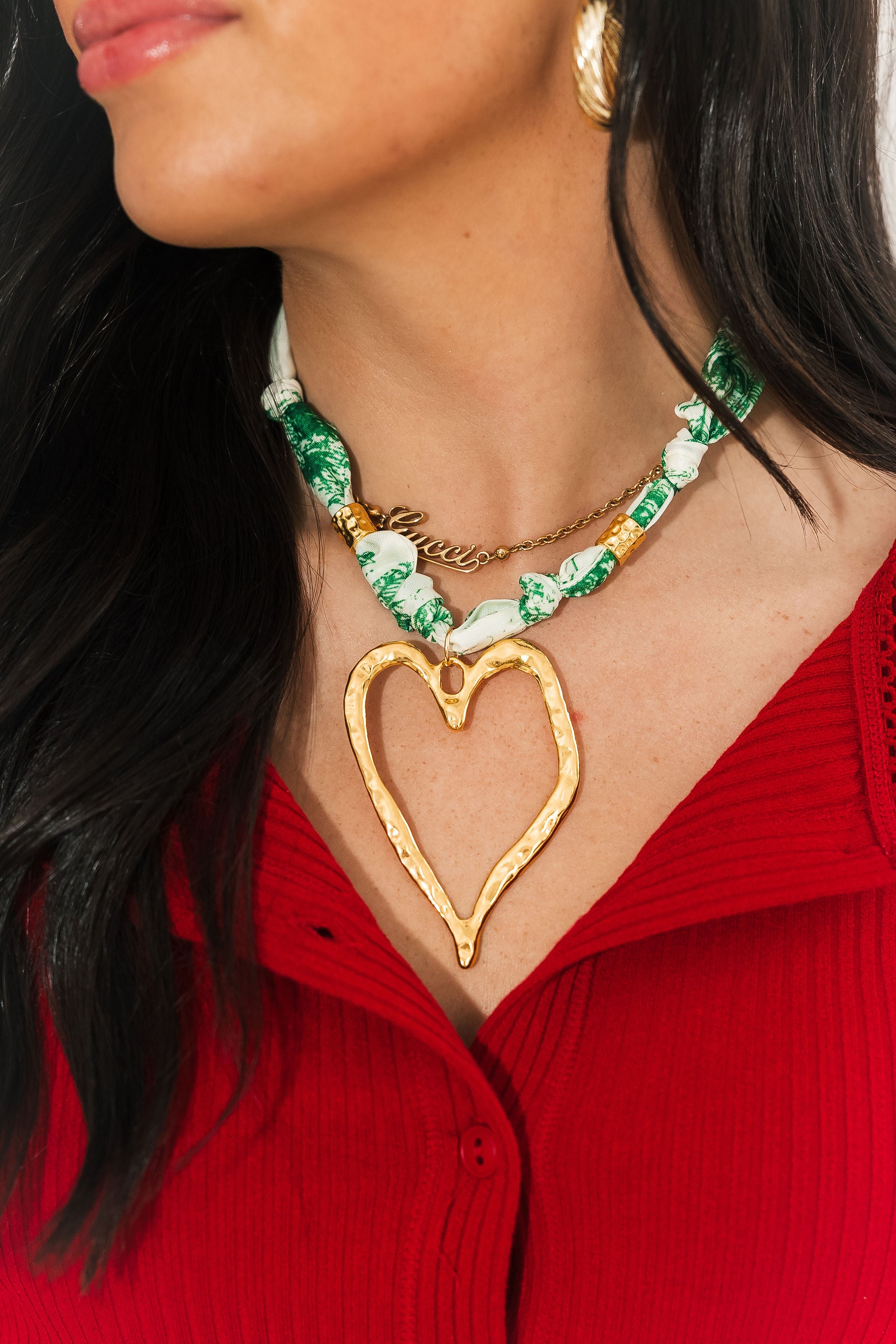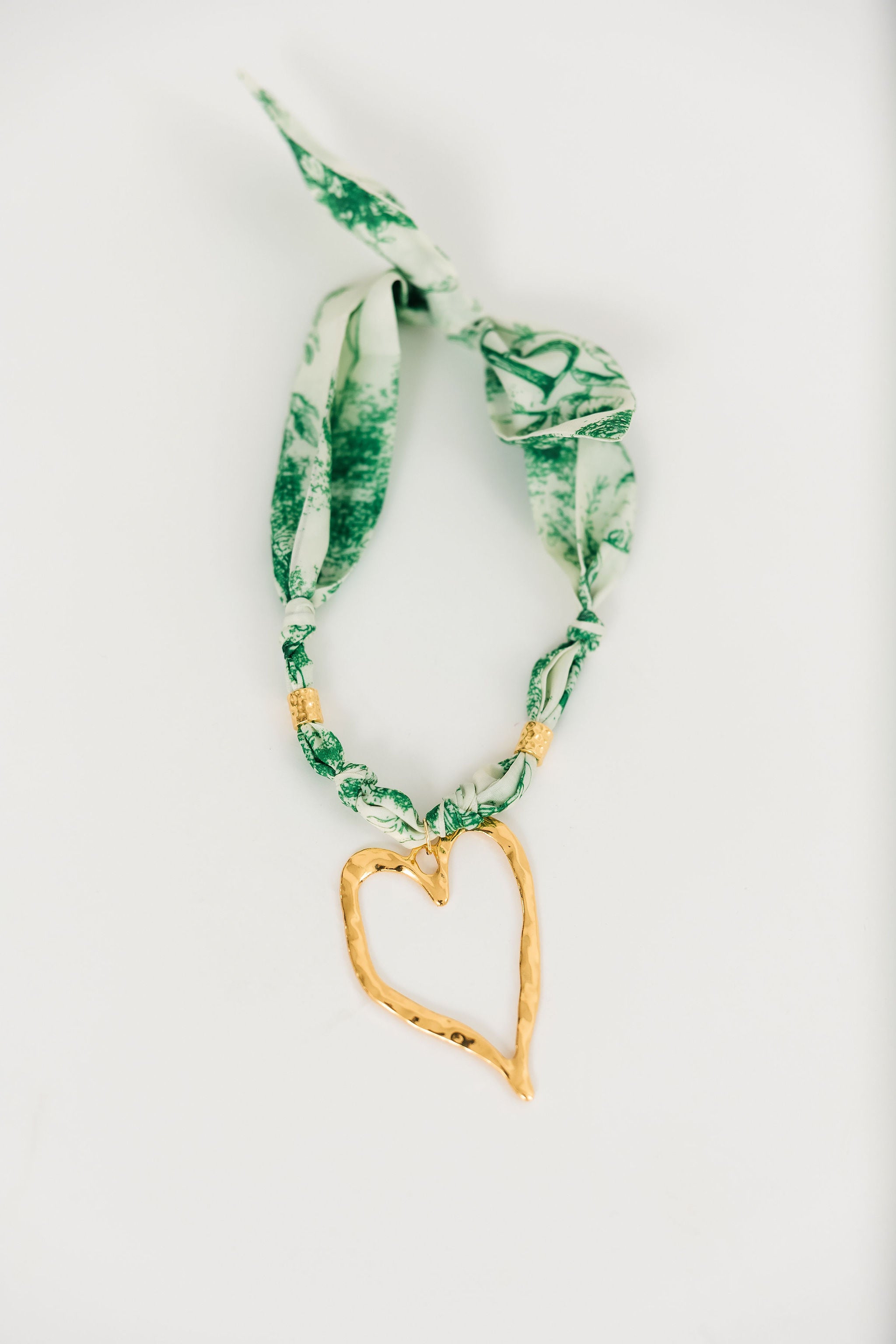 Romantic and eye-catching, the Green Toile Scarf Necklace features a statement heart pendant paired with a soft patterned scarf designed to be tied for a chic finishing touch. It’s the perfect mix of bold and feminine — instantly elevating any outfit.