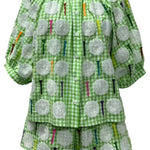 The Queen Of Sparkles Green & White Gingham Golf Ball & Golf Tee Button Up Cotton Top features a billowy, relaxed fit with a classic crewneck, short puff sleeves, and front button closure. Perfect for pairing with your favorite skirts or shorts for a fresh, spring-ready ensemble.