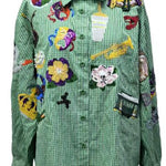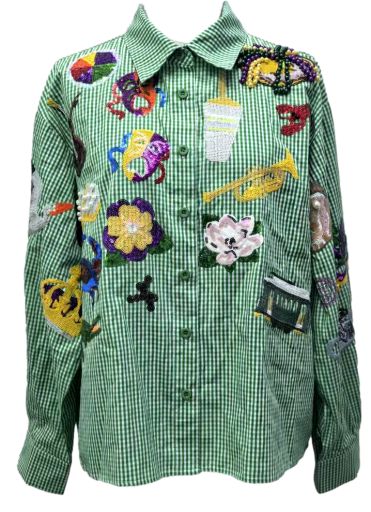 This collared button-up top pairs a fresh green-and-white gingham print with dazzling Mardi Gras icons for a look that’s festive yet effortlessly chic. The relaxed fit and soft cotton fabric make it perfect for parades, parties, or adding a pop of carnival charm to your everyday style.