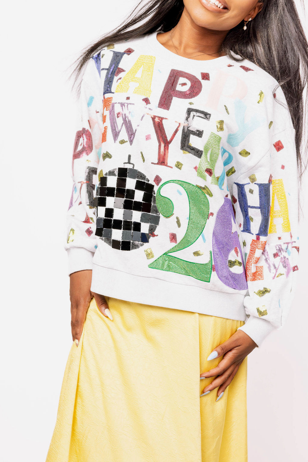 Celebrate midnight in comfort and sparkle with the Queen Of Sparkles Grey Multi 'Happy New Year 2026' Sweatshirt. This relaxed-fit crewneck pairs a soft, cozy feel with dazzling details—featuring a shimmering “Happy New Year 2026” graphic surrounded by confetti and disco ball accents. Whether you’re hosting at home, watching the ball drop, or heading out with friends, this sweatshirt delivers effortless festive flair. Pair it with sequined skirts, faux leather leggings, or classic denim for a look that’s as fun as the countdown itself.