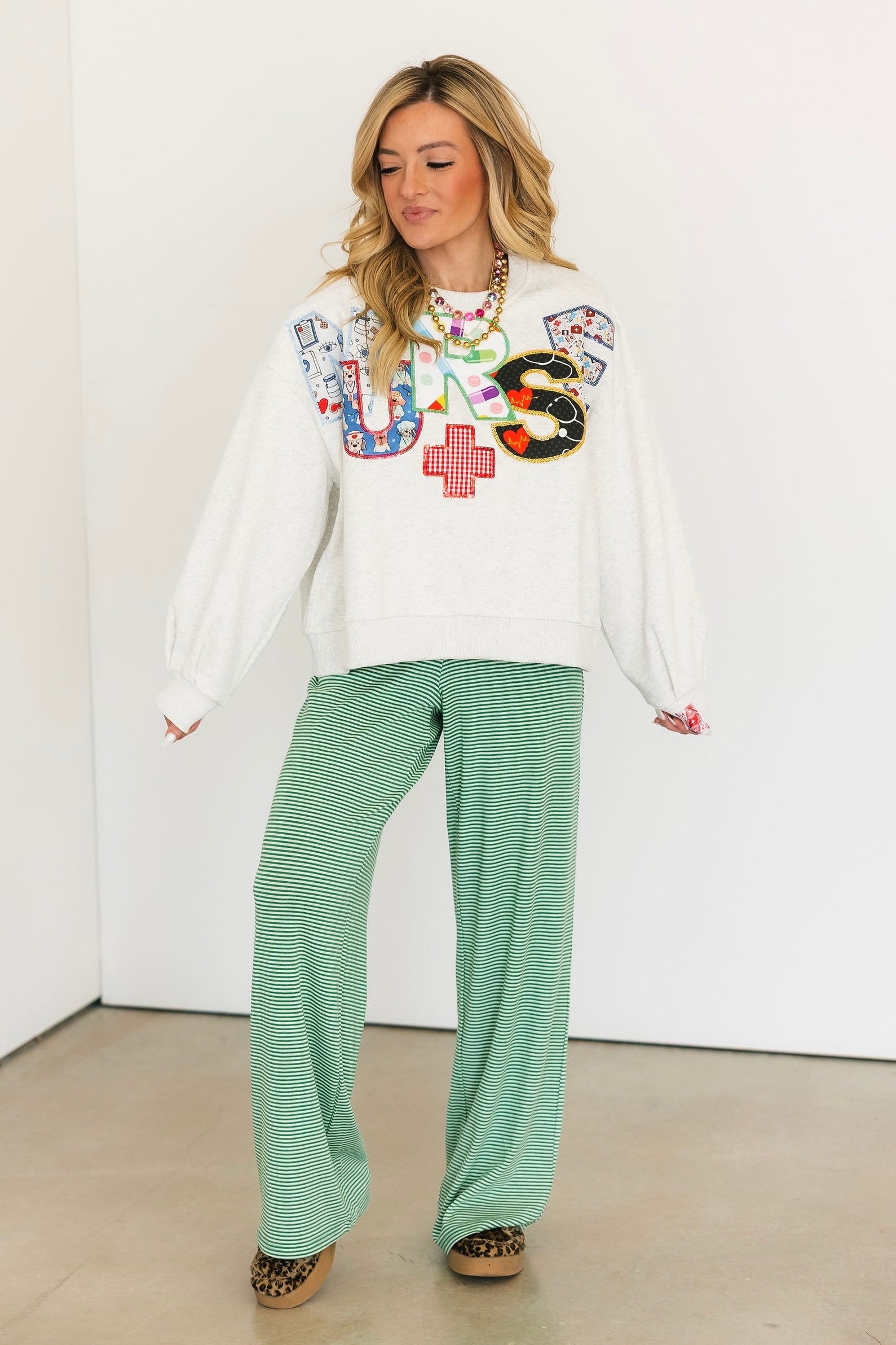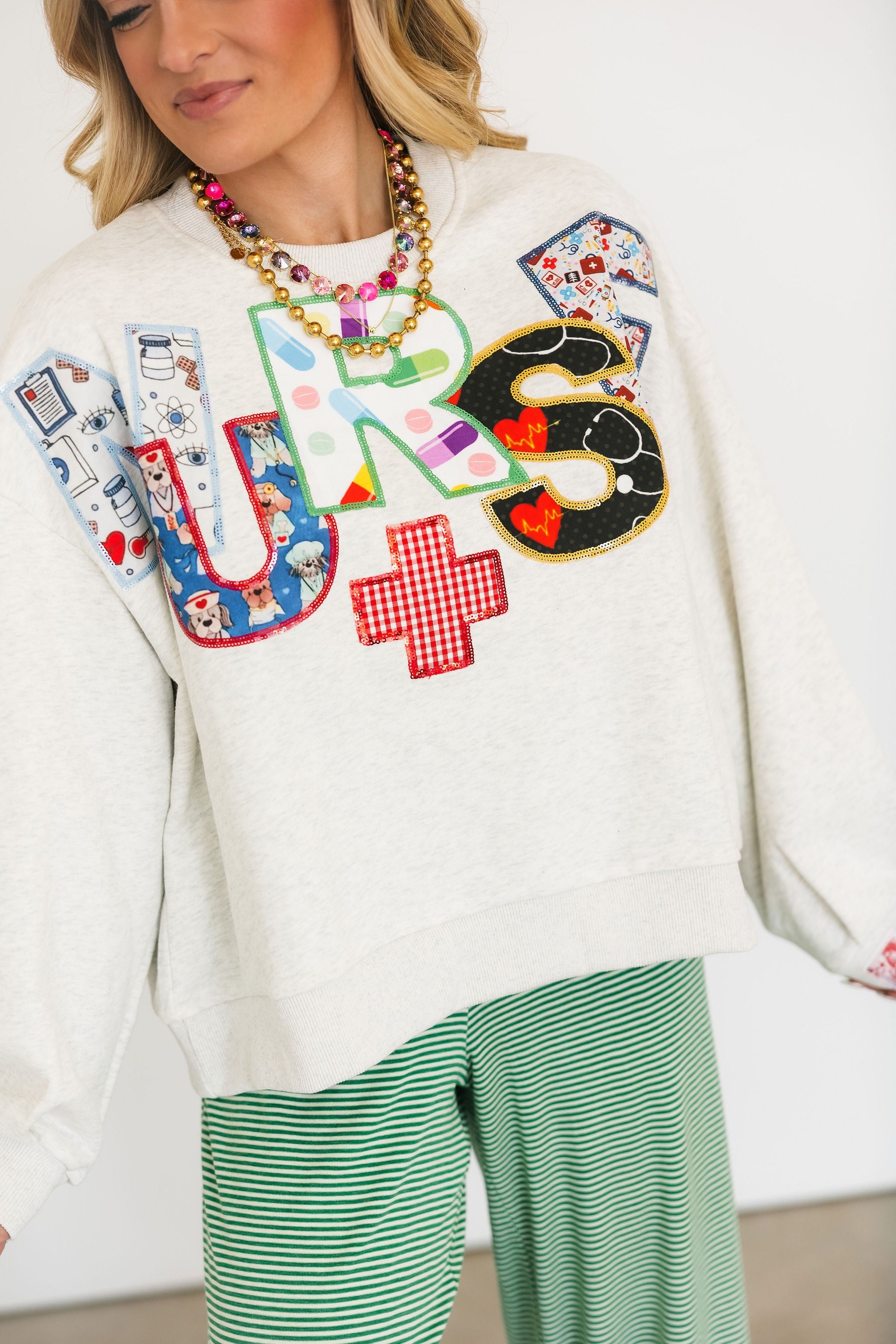 The Queen Of Sparkles Grey 'Nurse' Multi Fabric Sweatshirt features an oversized, relaxed fit with a classic crewneck and long sleeves. A playful nod to the medical world, it’s an easy-to-wear piece that combines comfort with personality. Lexi Jade is wearing an XS.