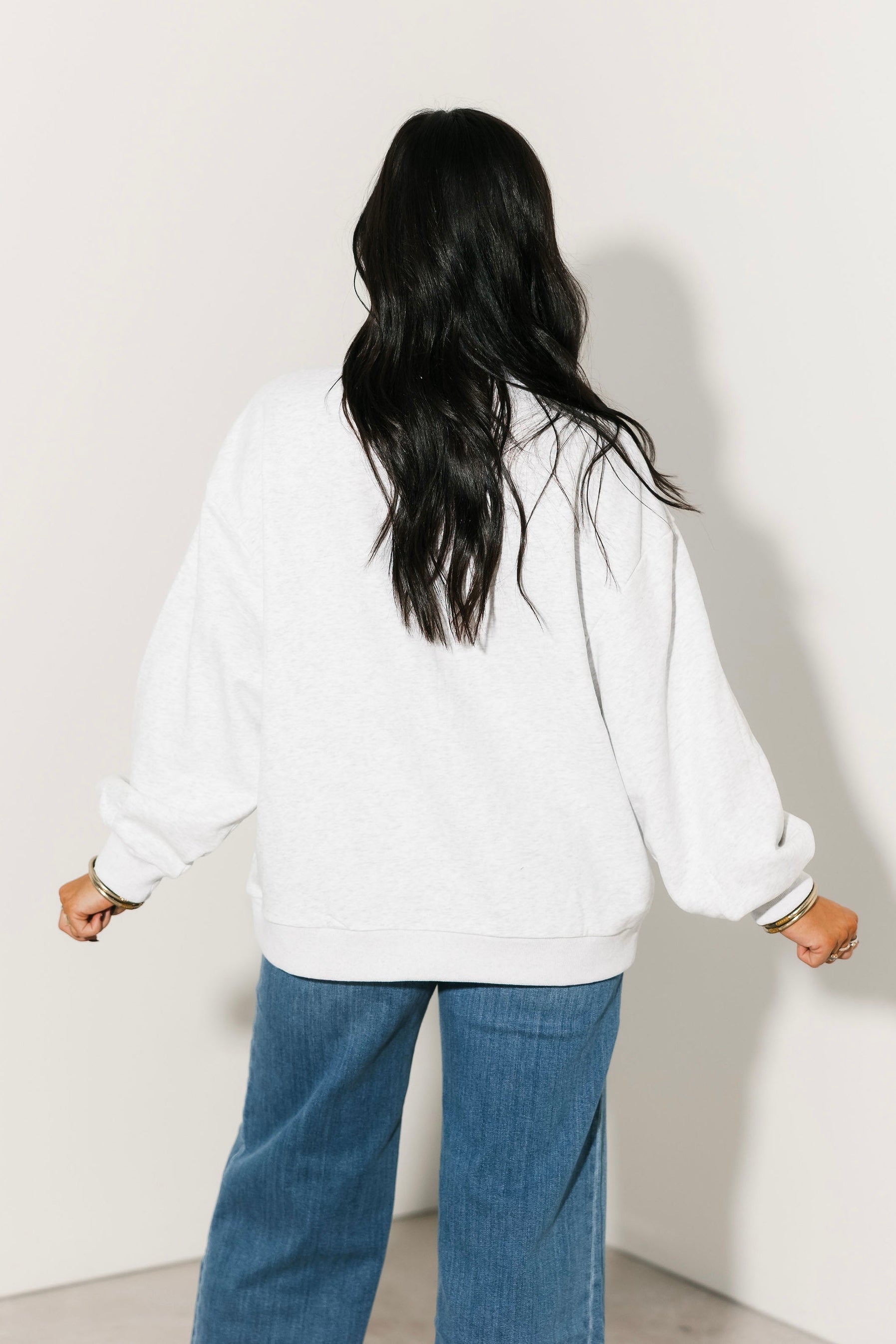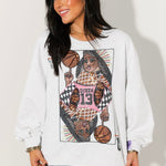 The Queen Of Sparkles Grey & Pink Medium Skin Basketball Queen Card Sweatshirt features a relaxed fit, classic crewneck, and long sleeves, highlighted by the whimsical QOS basketball card logo. Soft and comfortable, it’s ideal for layering over tees or pairing with jeans for a chic, game-day-ready look. Sage is wearing an XS.