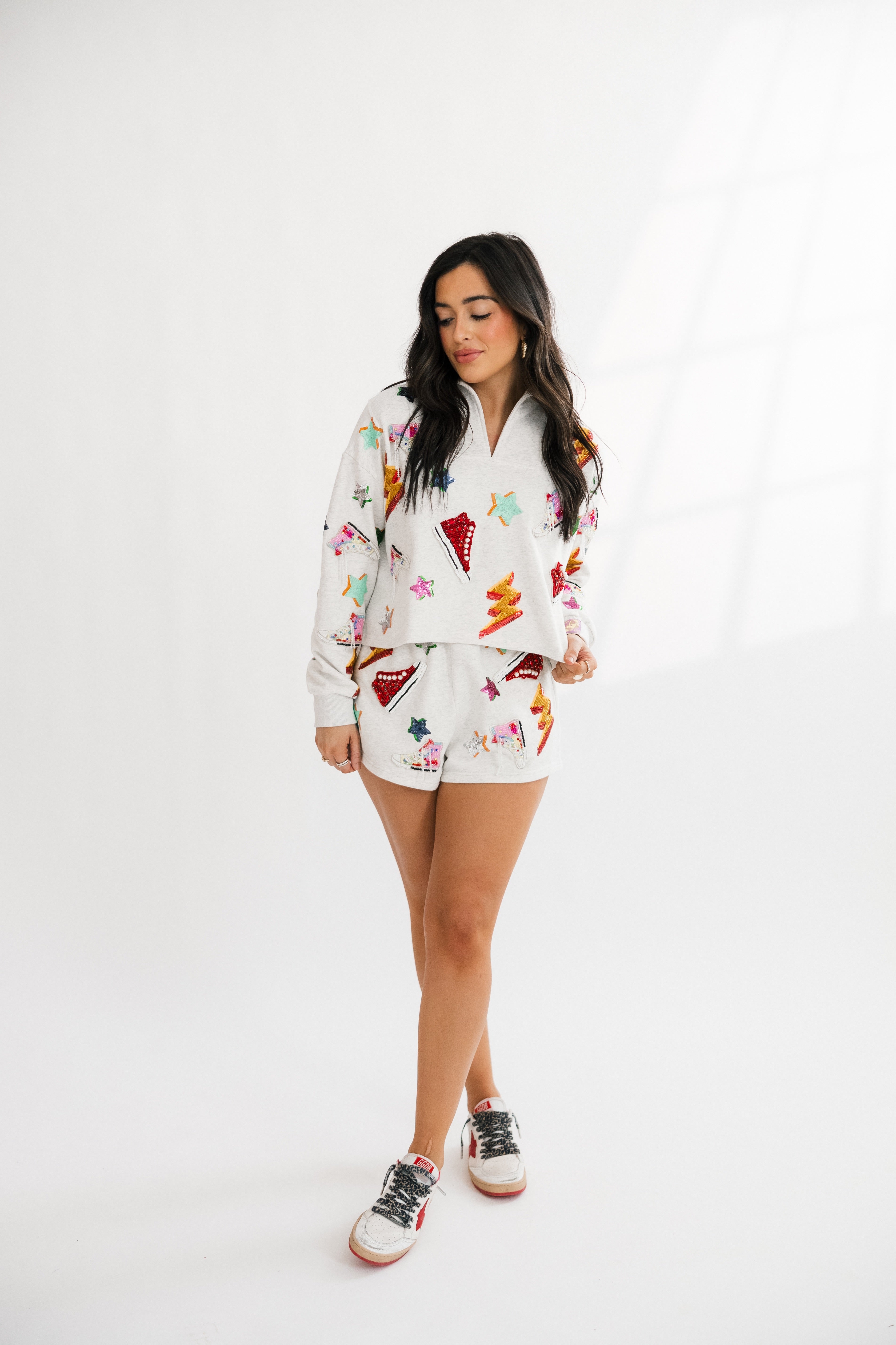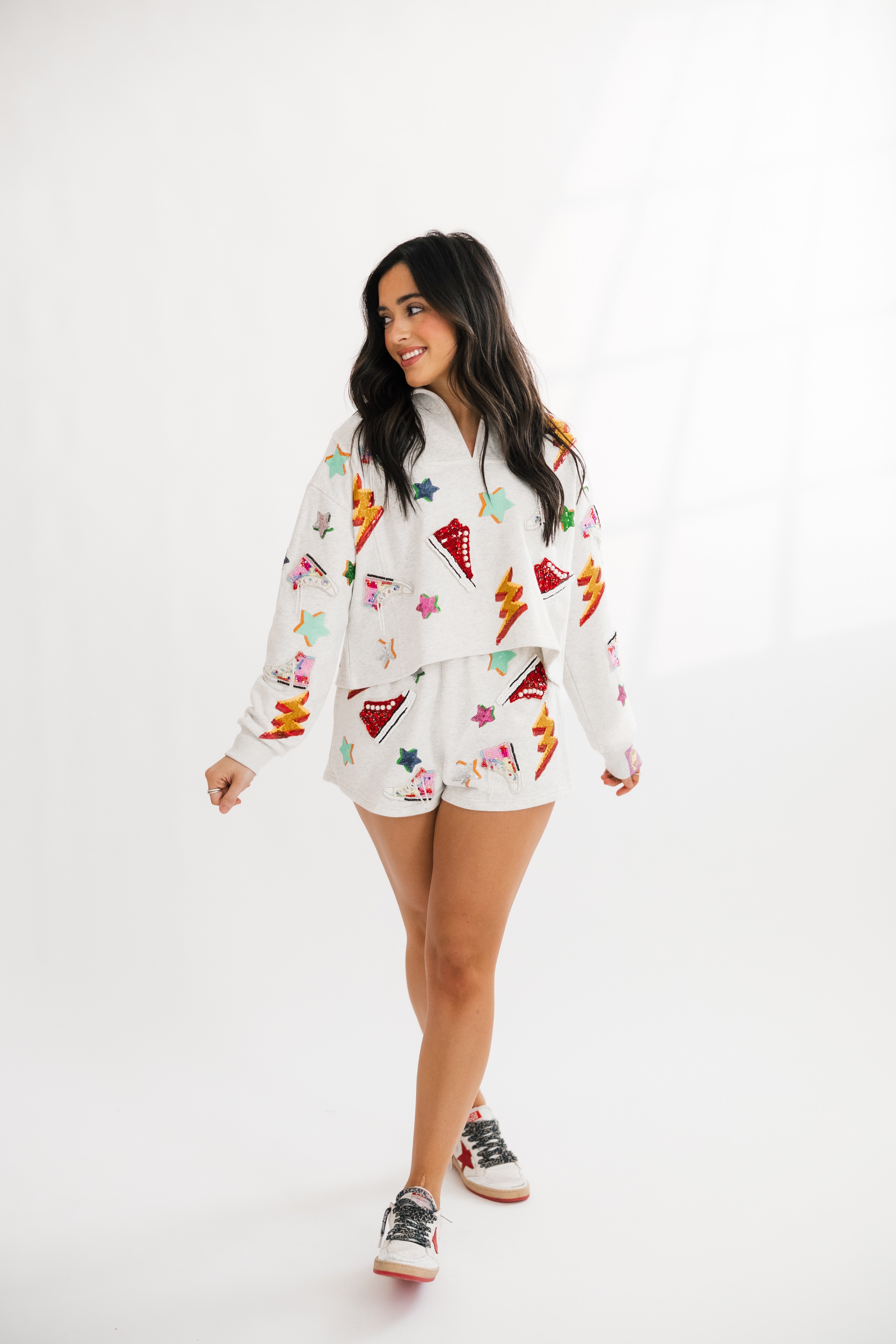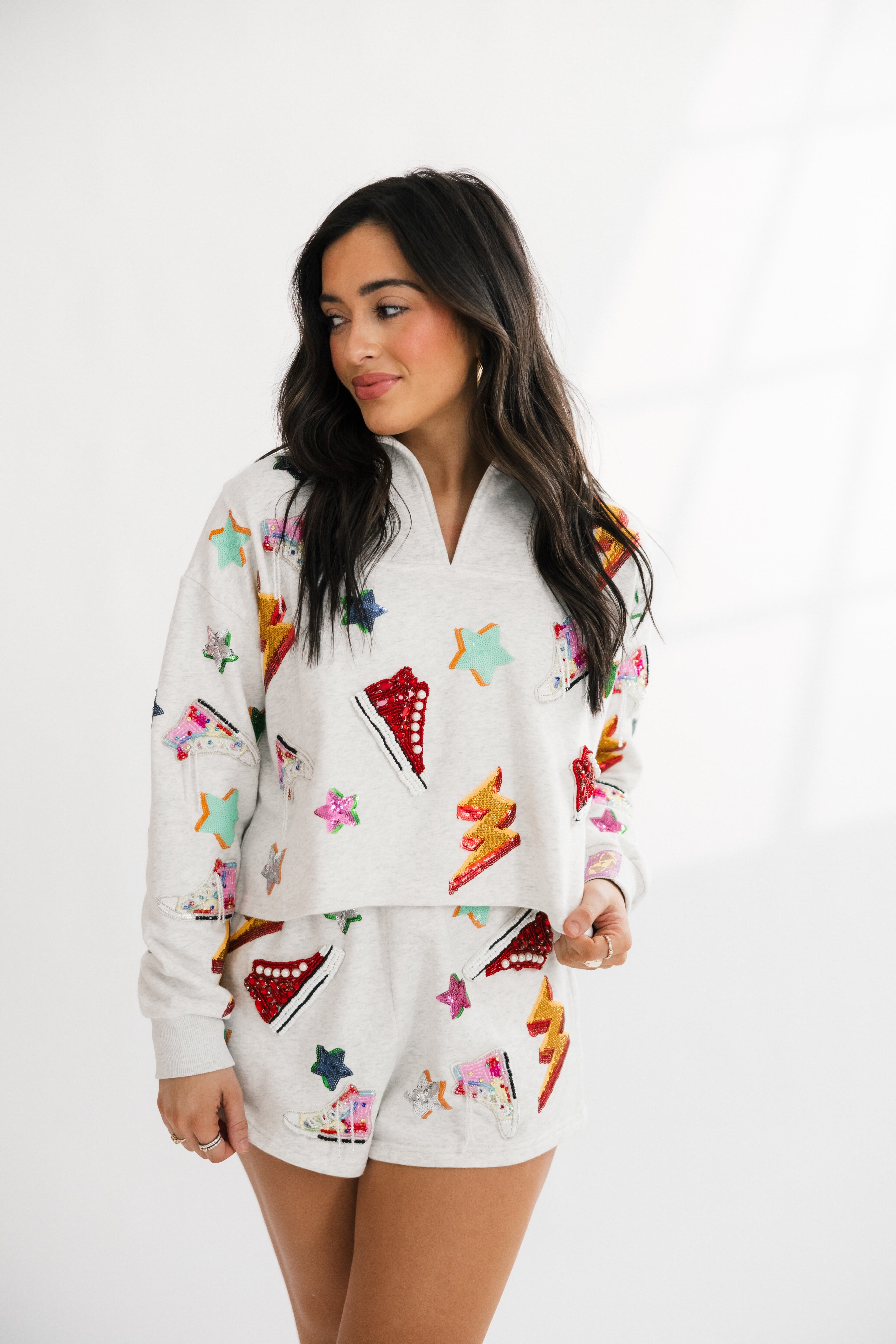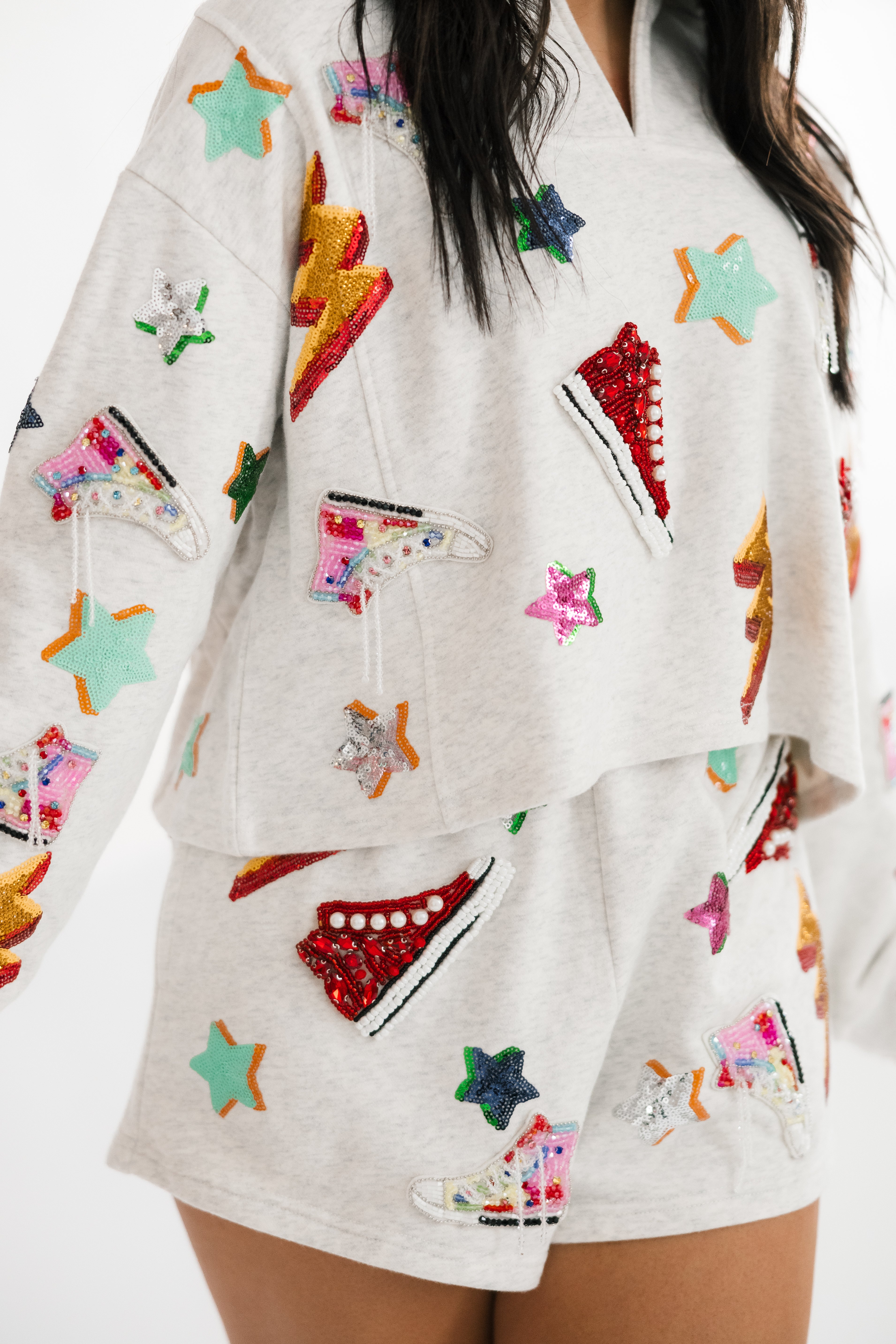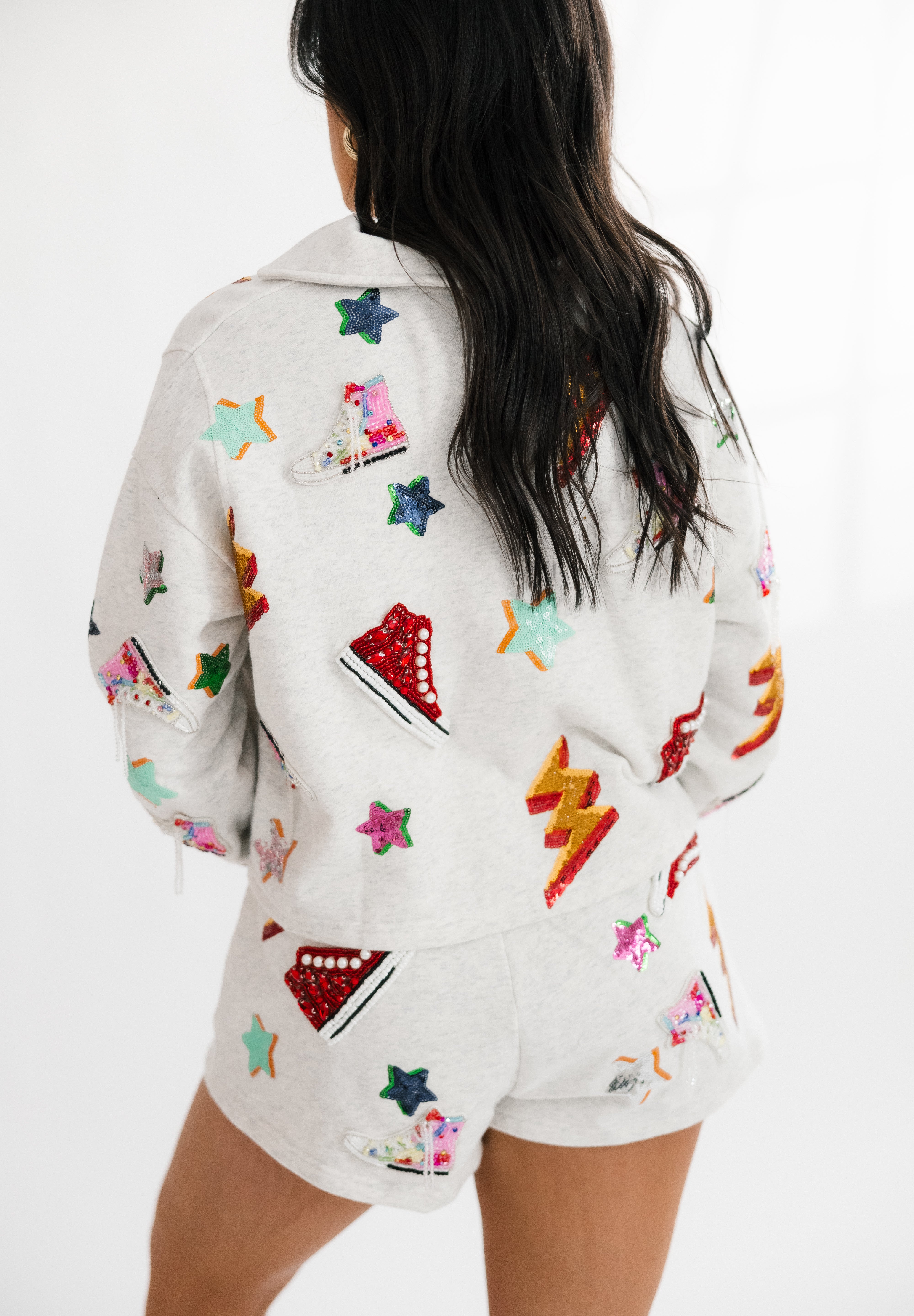 Get ready to shine, sparkle, and slay! This fabulous Queen of Sparkles sweatshirt is here to bring the party wherever you go. With playful sequin and beaded sneakers, electrifying lightning bolts, and twinkling stars, it's a wearable celebration of fun! The cute collar adds a touch of sass to this cozy yet glam look. Perfect for brunch, holiday hangs, or anytime you want to turn heads—because sparkle is always in style! ✨👟⚡🌟