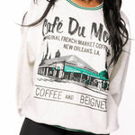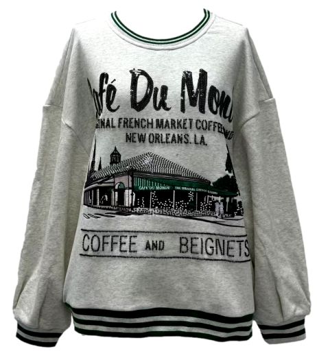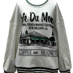 The Queen Of Sparkles Grey Sport Stripe “Café Du Monde” Sweatshirt brings cozy comfort and festive flair in one relaxed fit. Featuring a classic crewneck, long sleeves, and sporty striped accents, it’s finished with a playful nod to the beloved New Orleans café. Perfect for everyday wear or Mardi Gras celebrations.