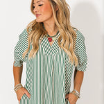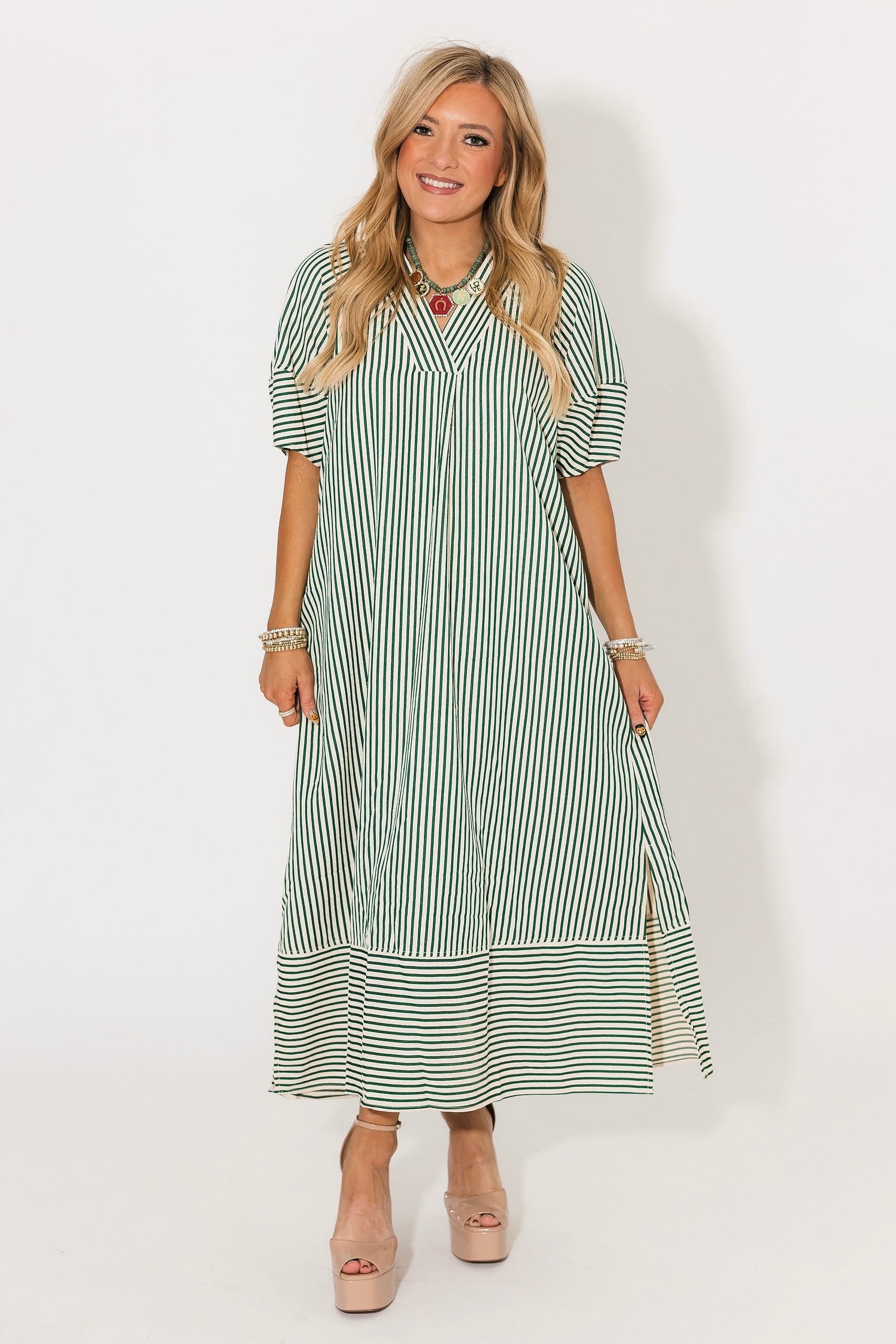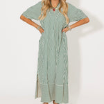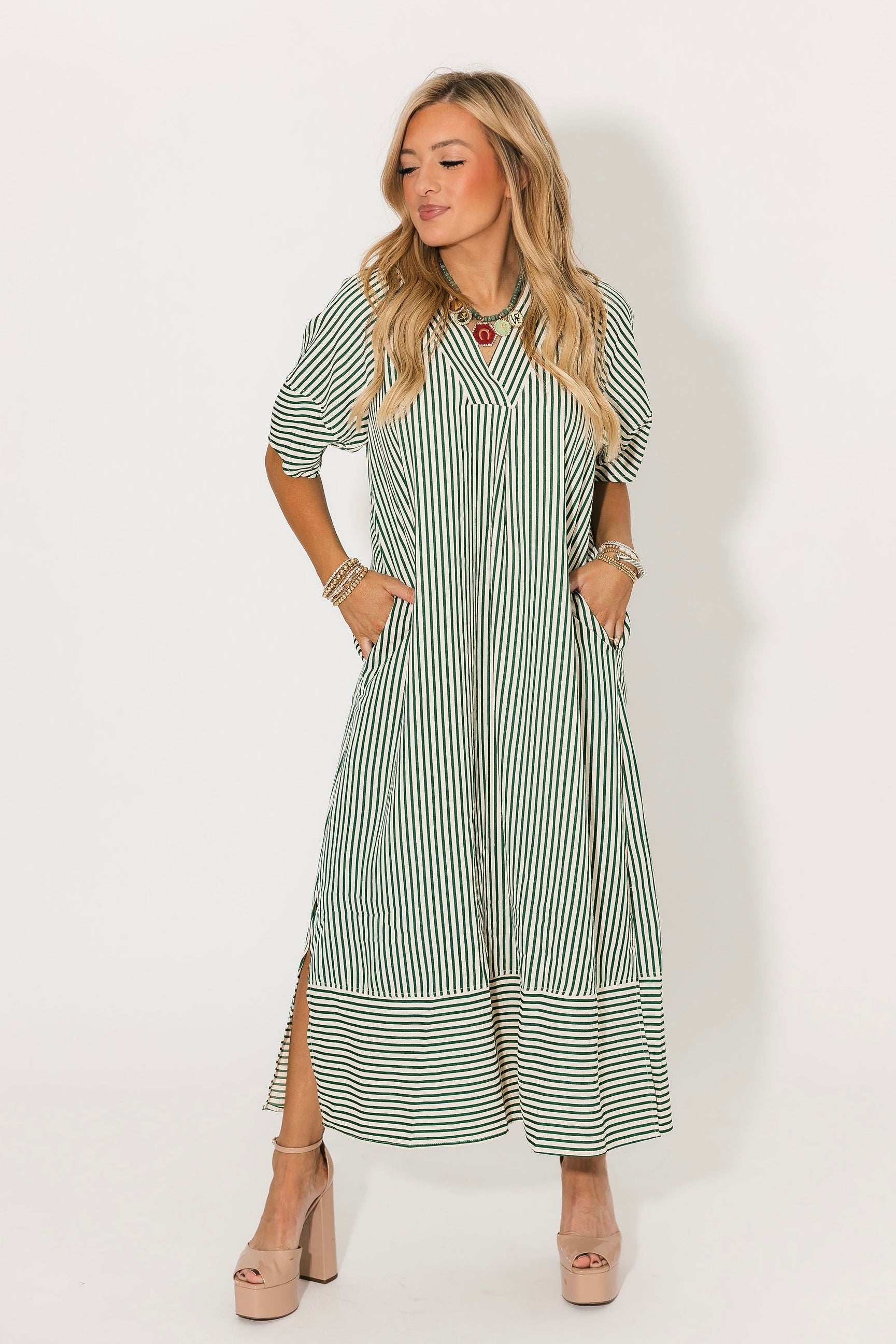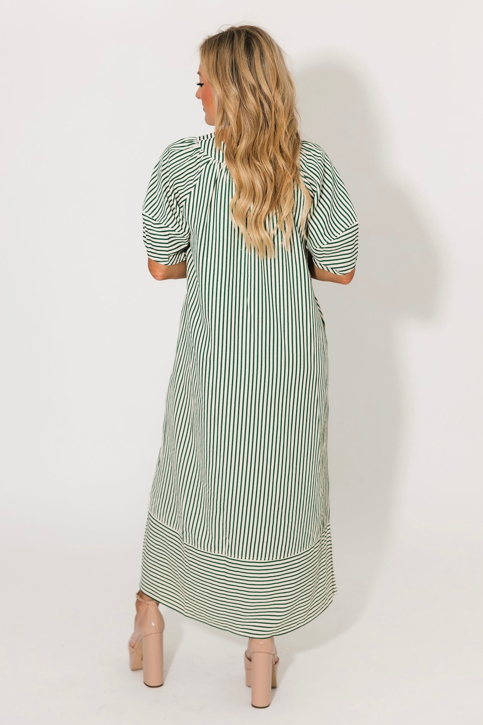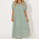 The Harbor Stripe Midi Dress is a laid-back yet elevated piece made for effortless style. With its billowy fit and textured stripe fabric, it drapes beautifully for all-day comfort. Designed with lantern sleeves and side slits for easy movement, it’s finished with hidden pockets for a practical touch. Timeless and versatile, this dress pairs perfectly with boots, flats, or casual sneakers. Lexi is wearing a small.