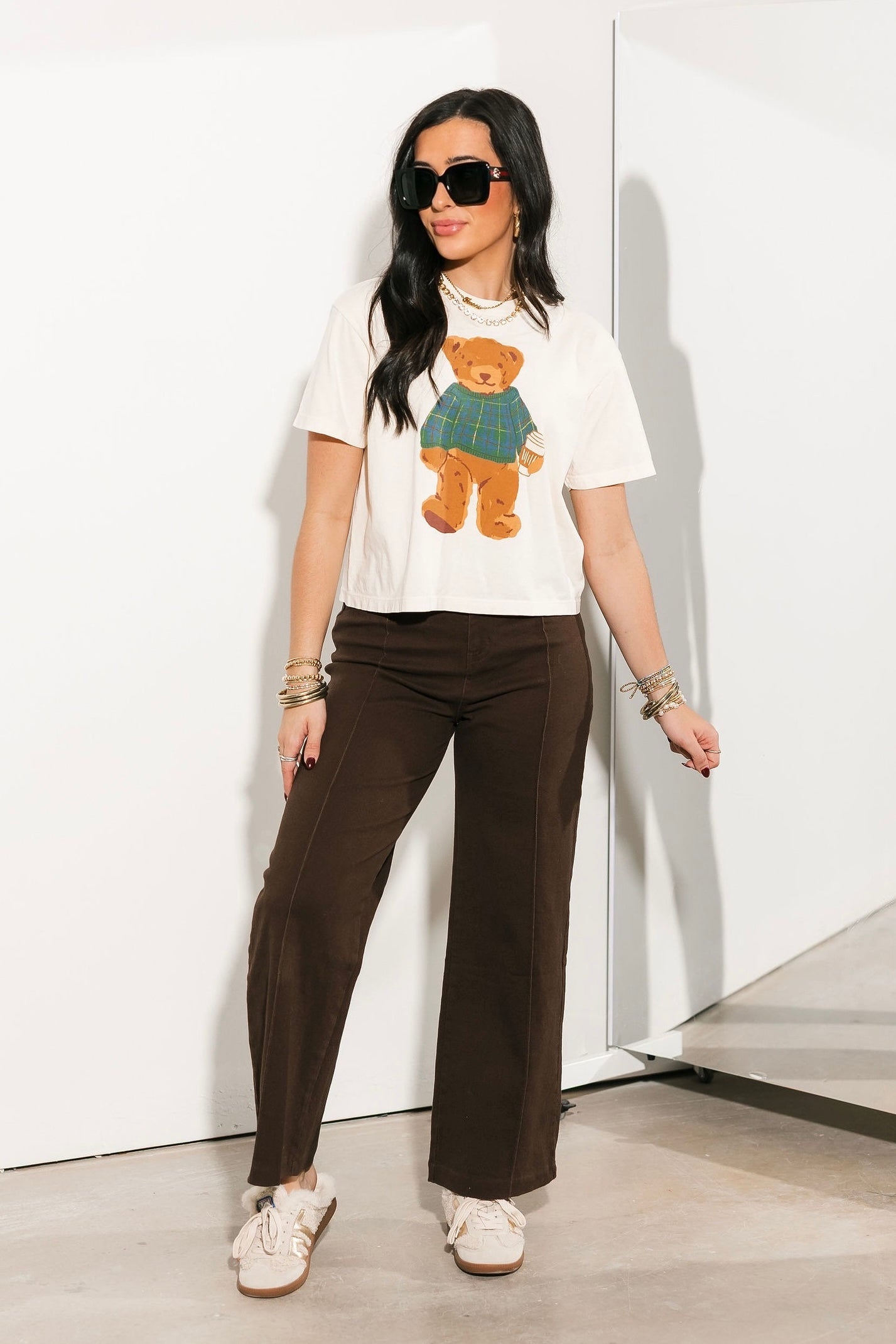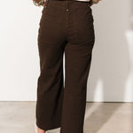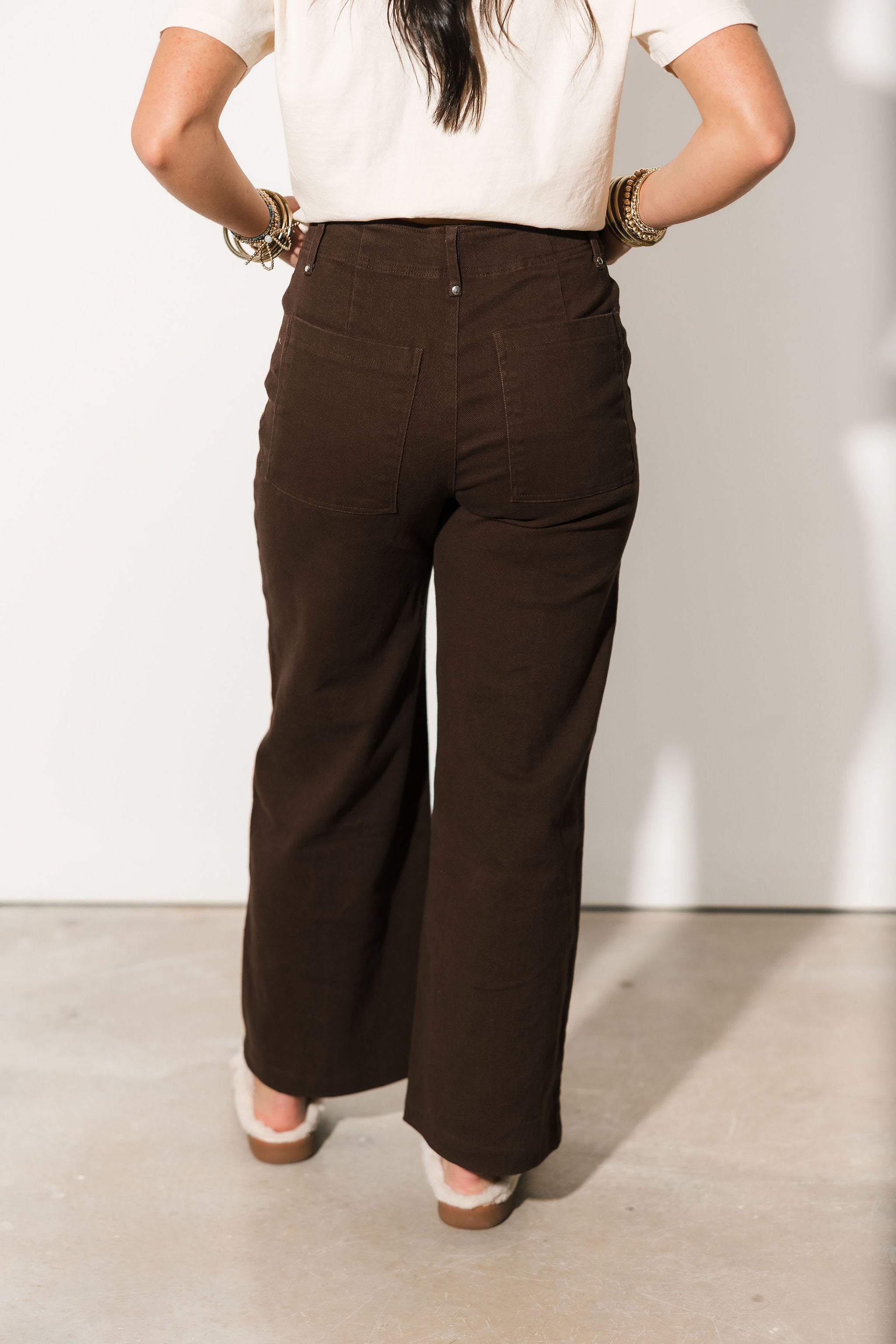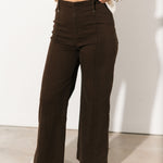 Elevate your everyday look with the High Society Pant in Brown. Designed with a sleek front seam detail and flattering wide leg, these pants bring effortless polish to any outfit. The structured silhouette and rich olive tone make them a versatile staple for both casual and dressy occasions. Sage is wearing a small.