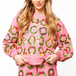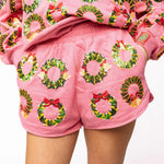 The Queen Of Sparkles Hot Pink Multi Wreaths Shorts are a playful holiday staple with just the right mix of cozy and chic. Featuring a relaxed fit with an elastic waistband for all-day comfort, these shorts are brought to life with vibrant multi-color wreath graphics that sparkle against the hot pink base. Pair them with the matching sweatshirt for a full festive set, or mix and match with a simple tee or chunky knit for a more casual seasonal vibe.