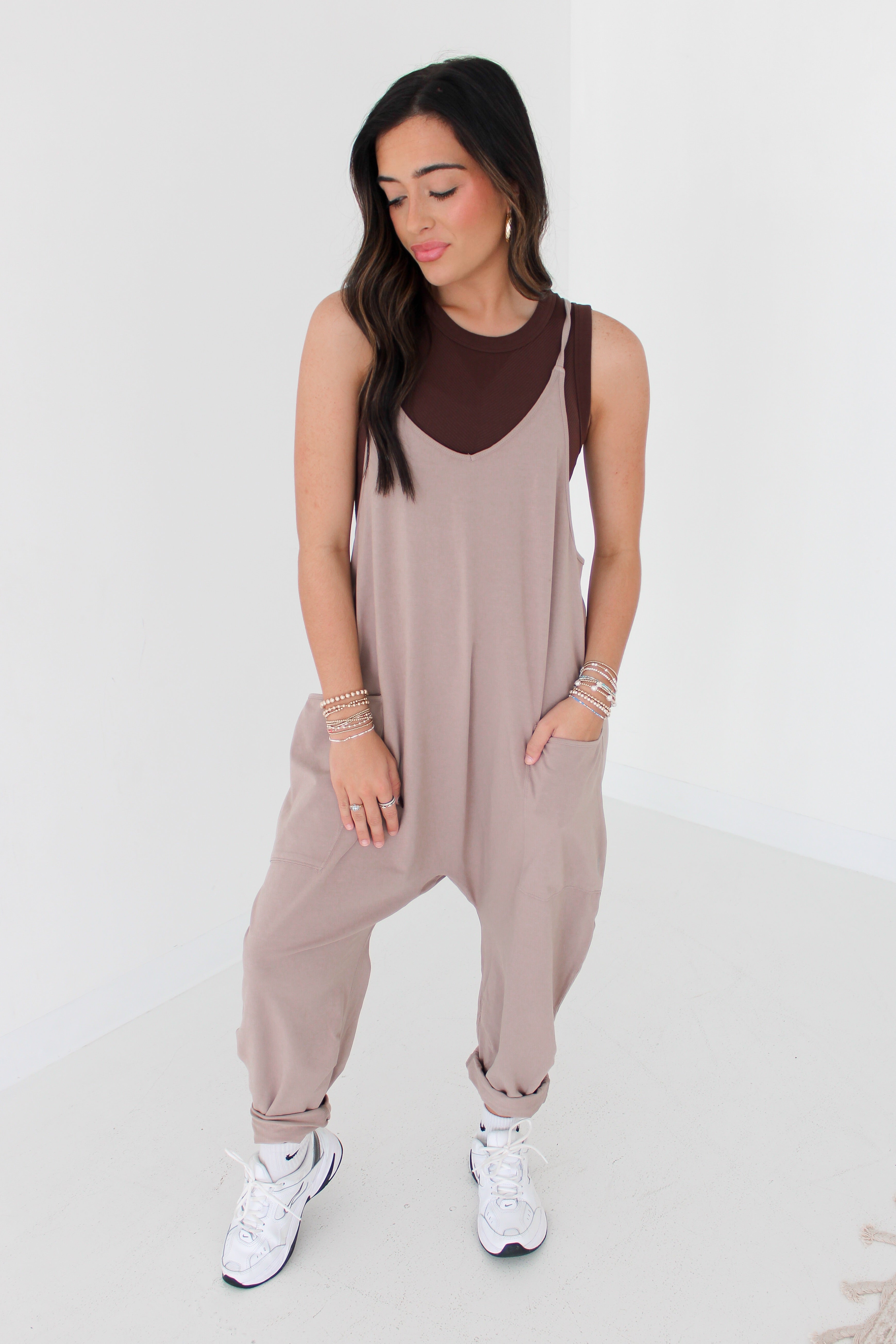 This soft and comfy onesie features a slouchy, relaxed-fitting design with a dropped crotch and convenient side pockets.