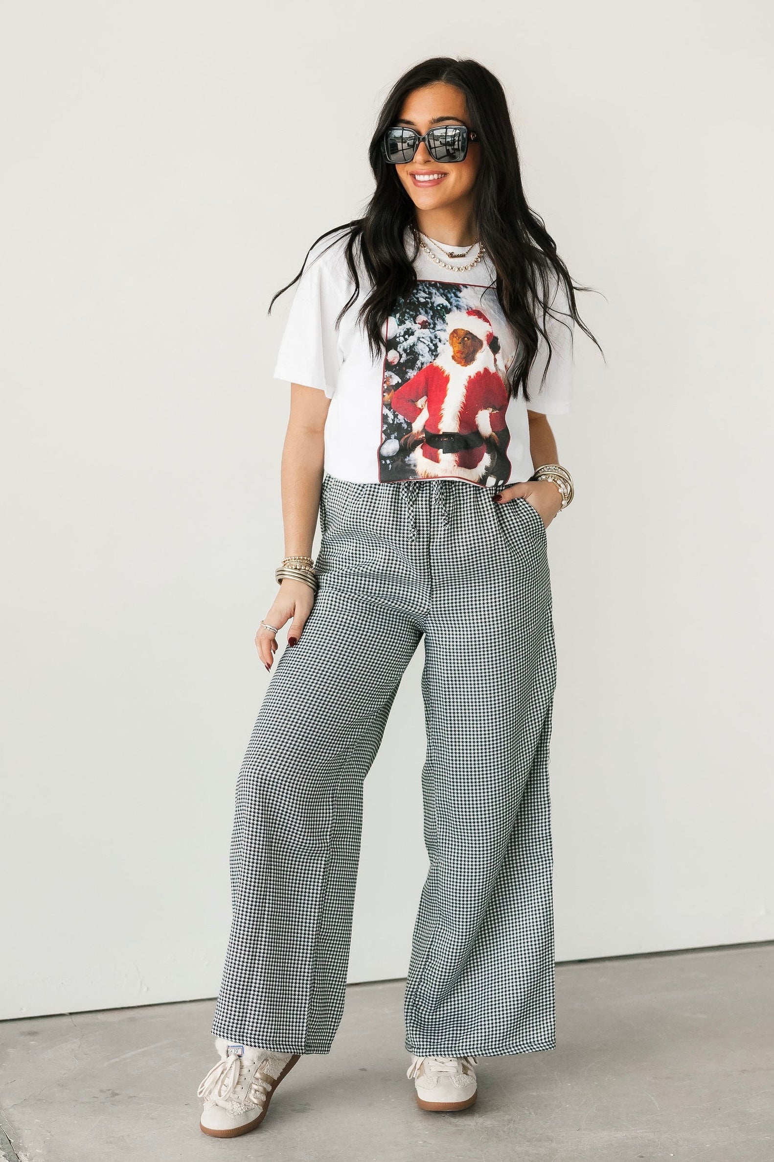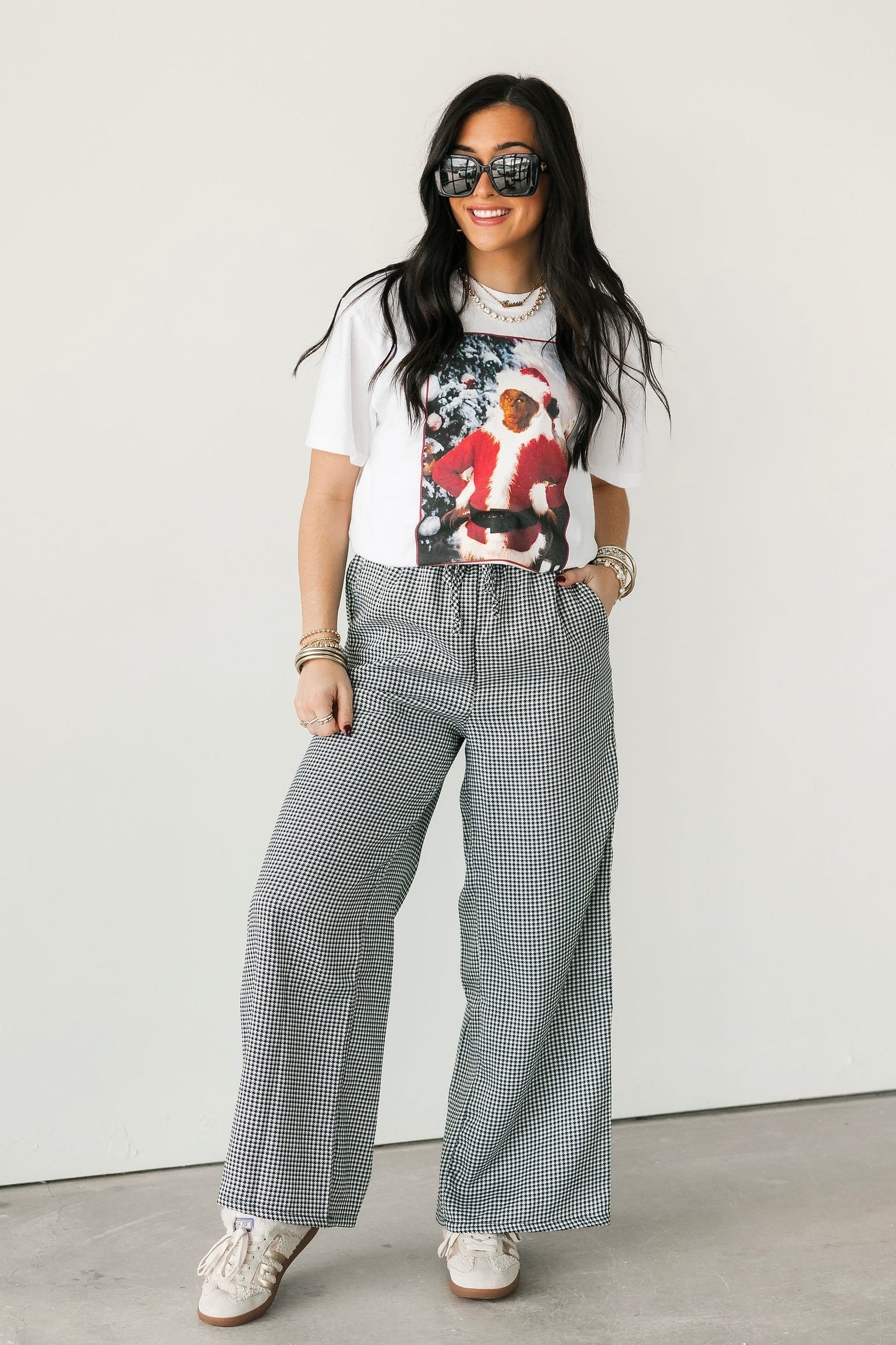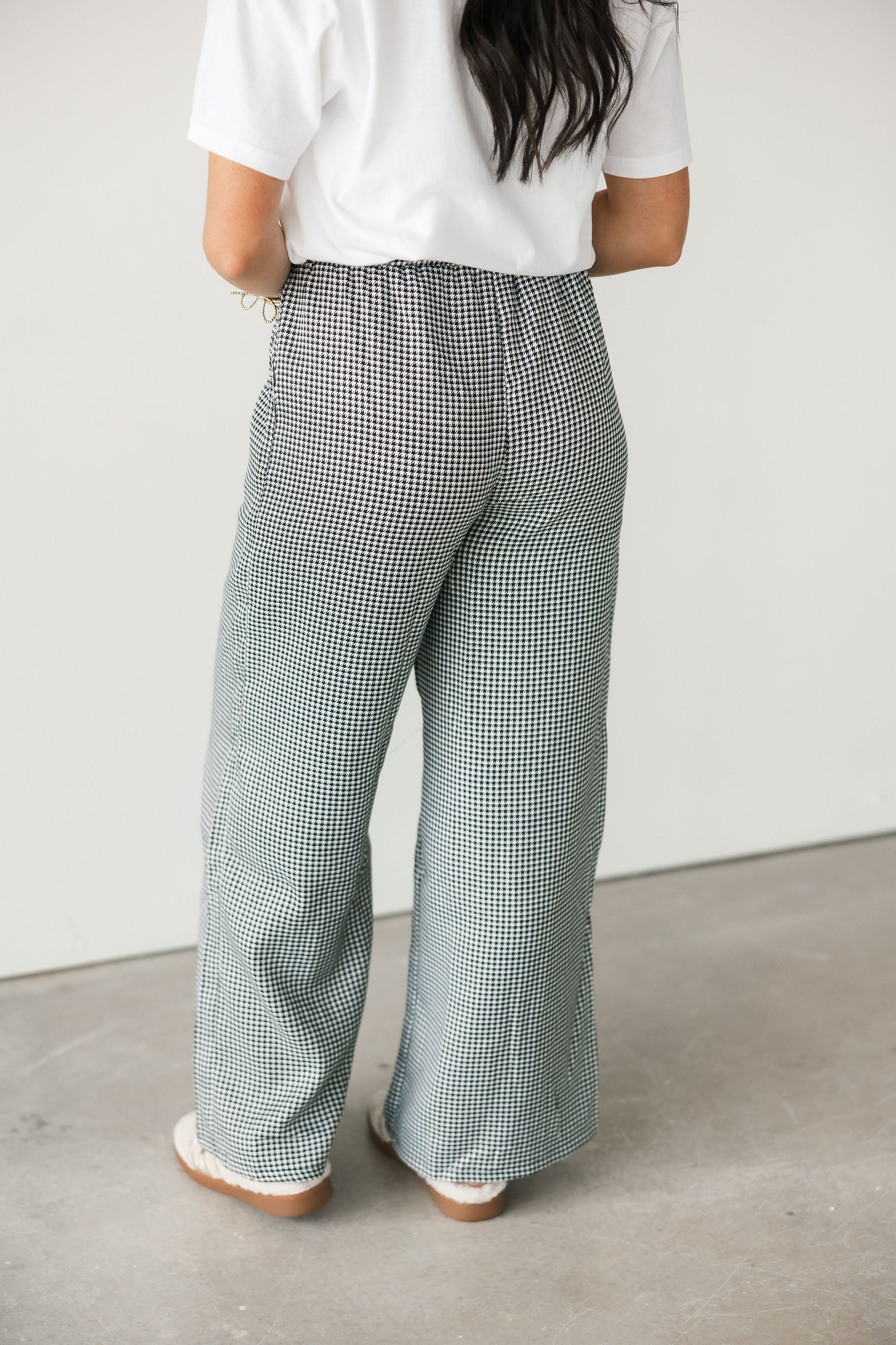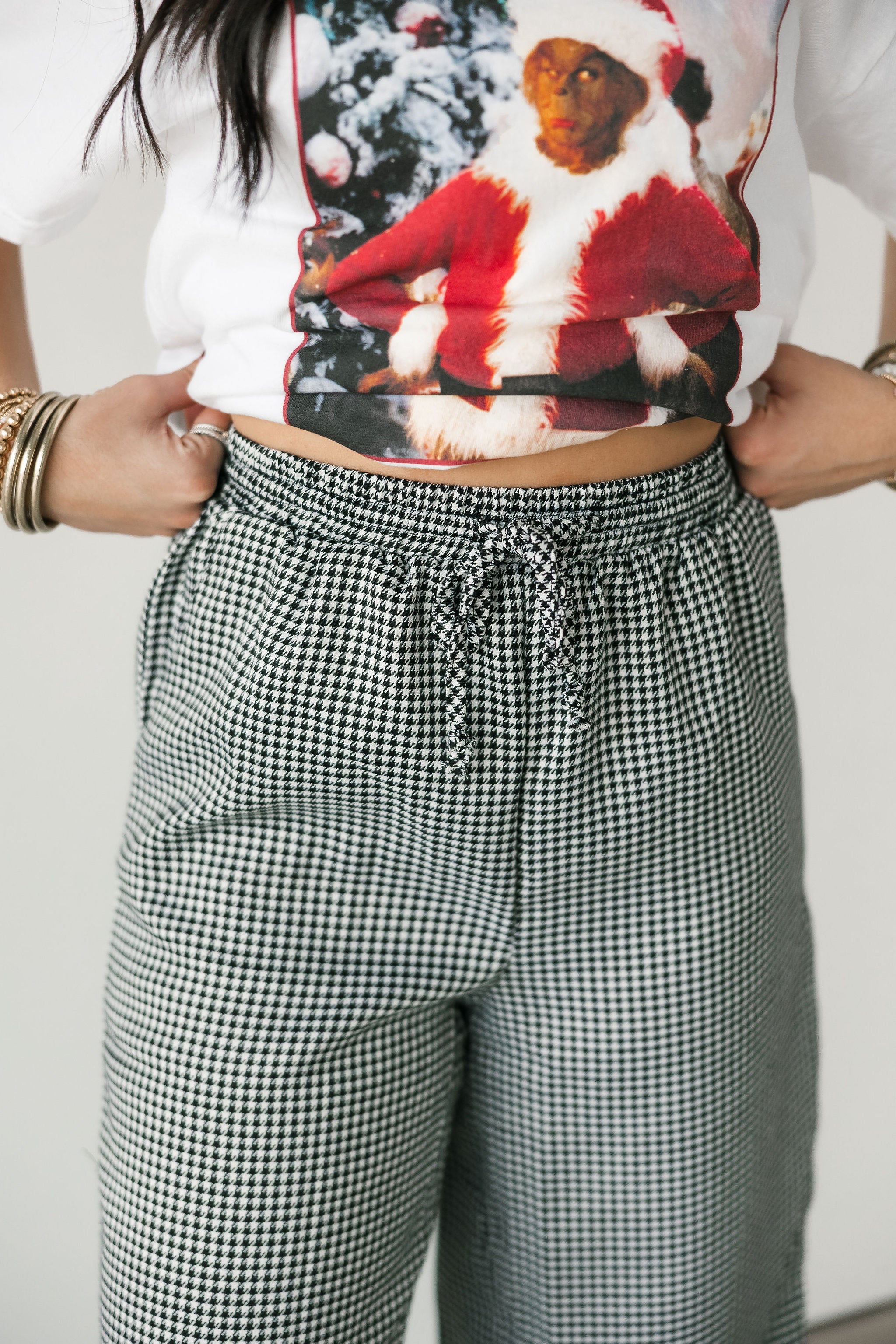 These wide-leg pants feature a stretchy elastic waistband with a drawstring for all-day comfort. With a classic houndstooth pattern and flattering wide-leg silhouette, they’re a chic and versatile addition to any wardrobe. Sage is wearing a small.