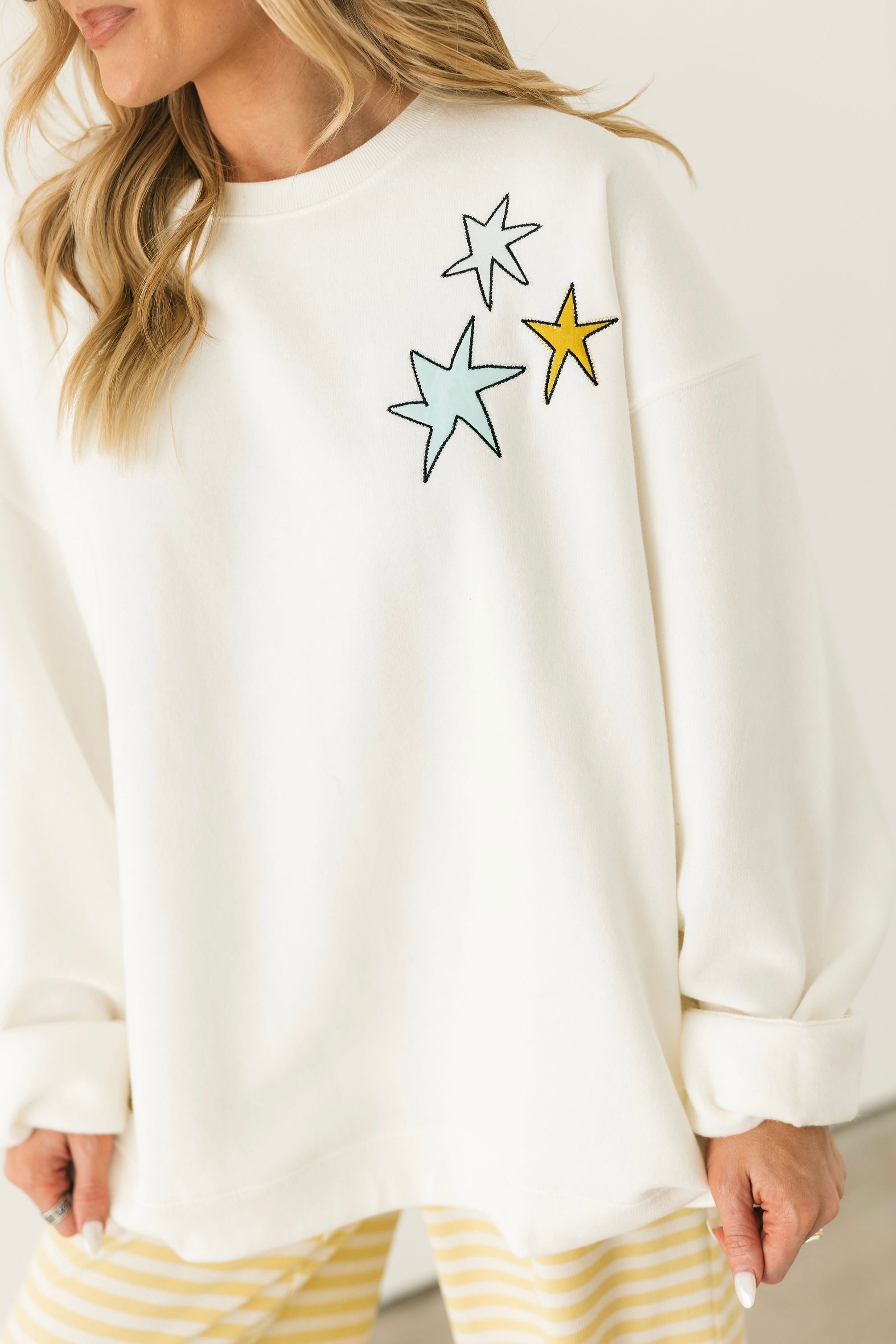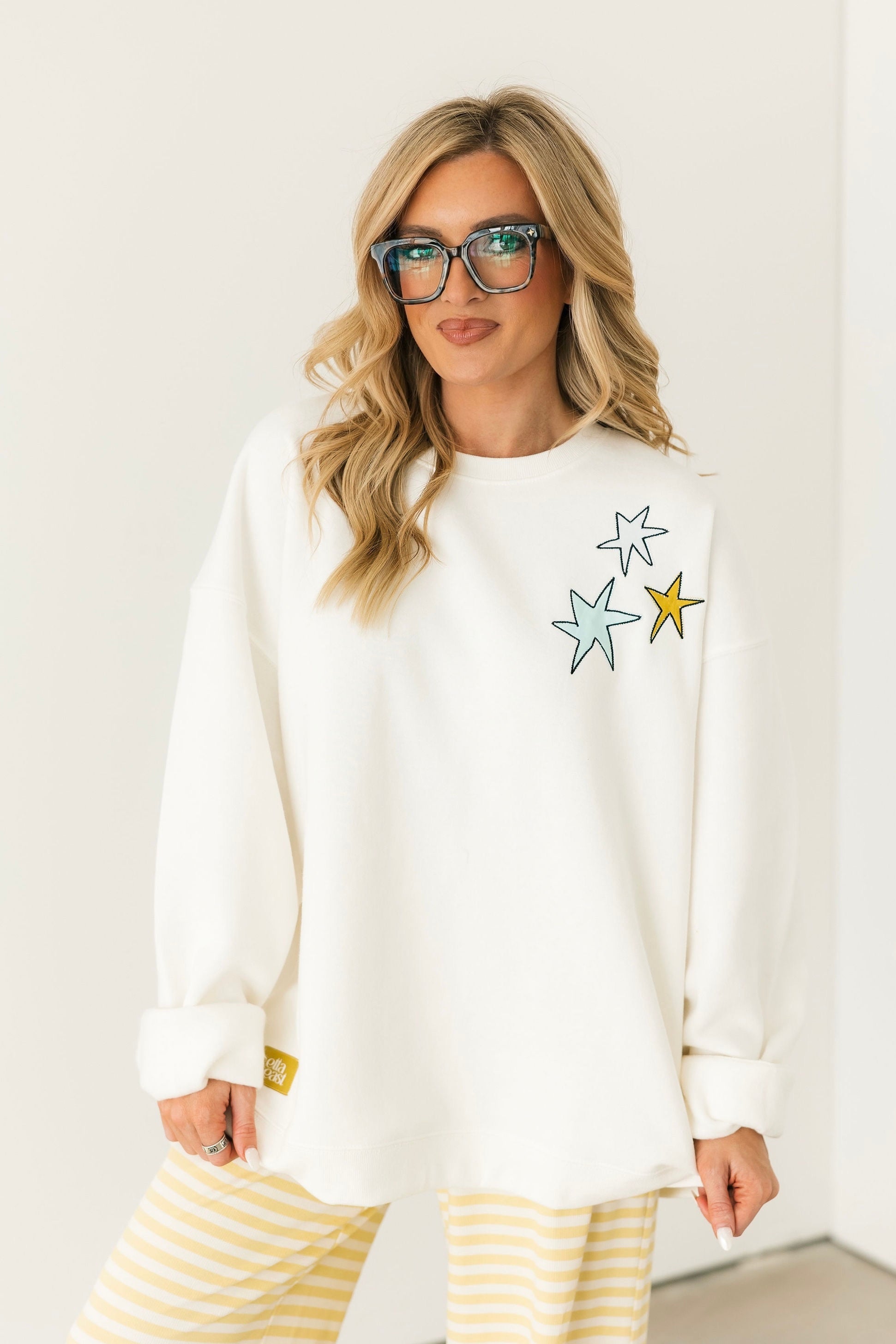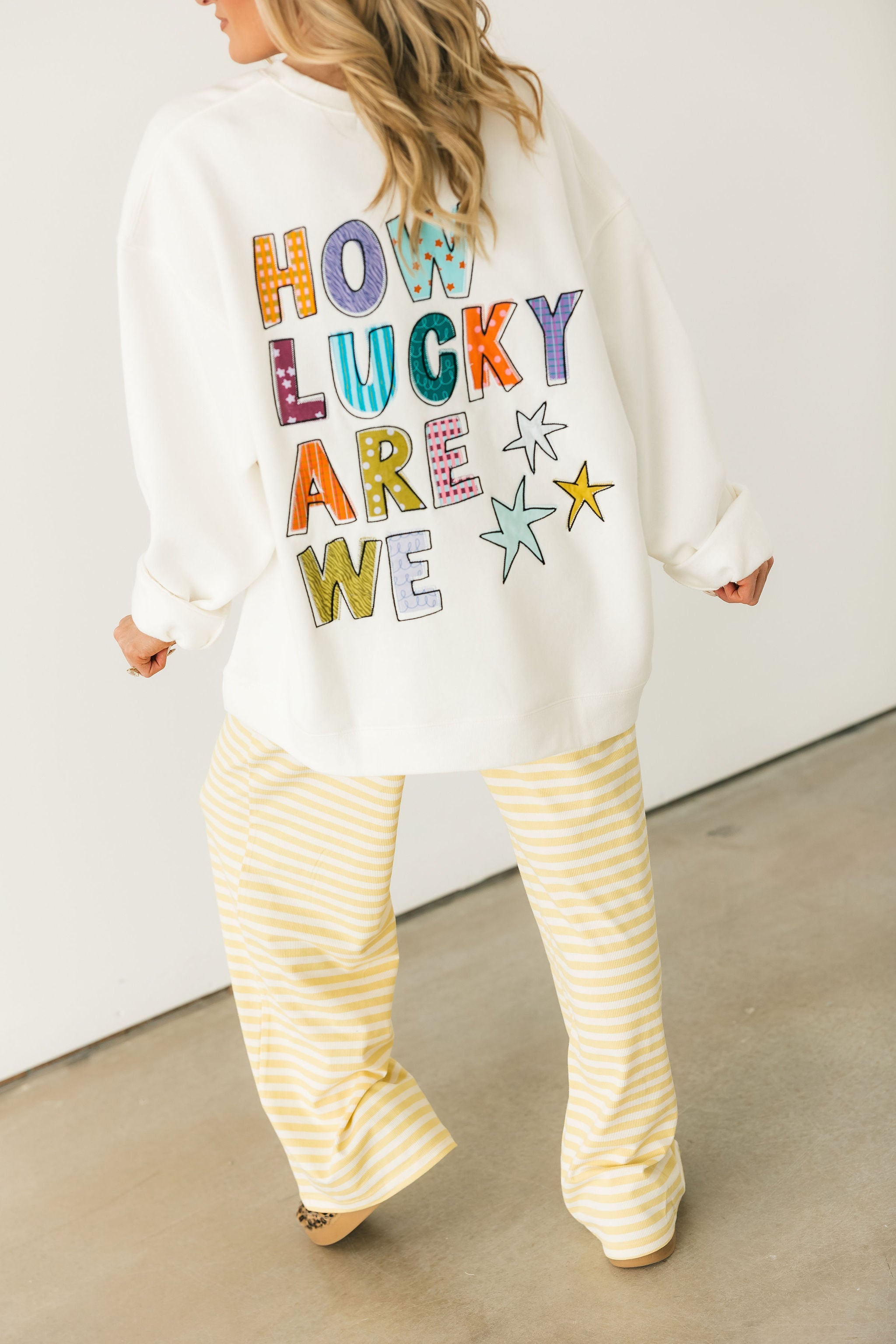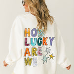 Cozy with a statement — this oversized crewneck features “HOW LUCKY ARE WE” embroidered across the back with sweet star details on the front. Designed with a relaxed, slouchy, oversized fit. The classic crewneck and long sleeves keep it timeless, while the super soft fleece lining makes it one you’ll never want to take off! Lexi is wearing a S/M. ⭐✨