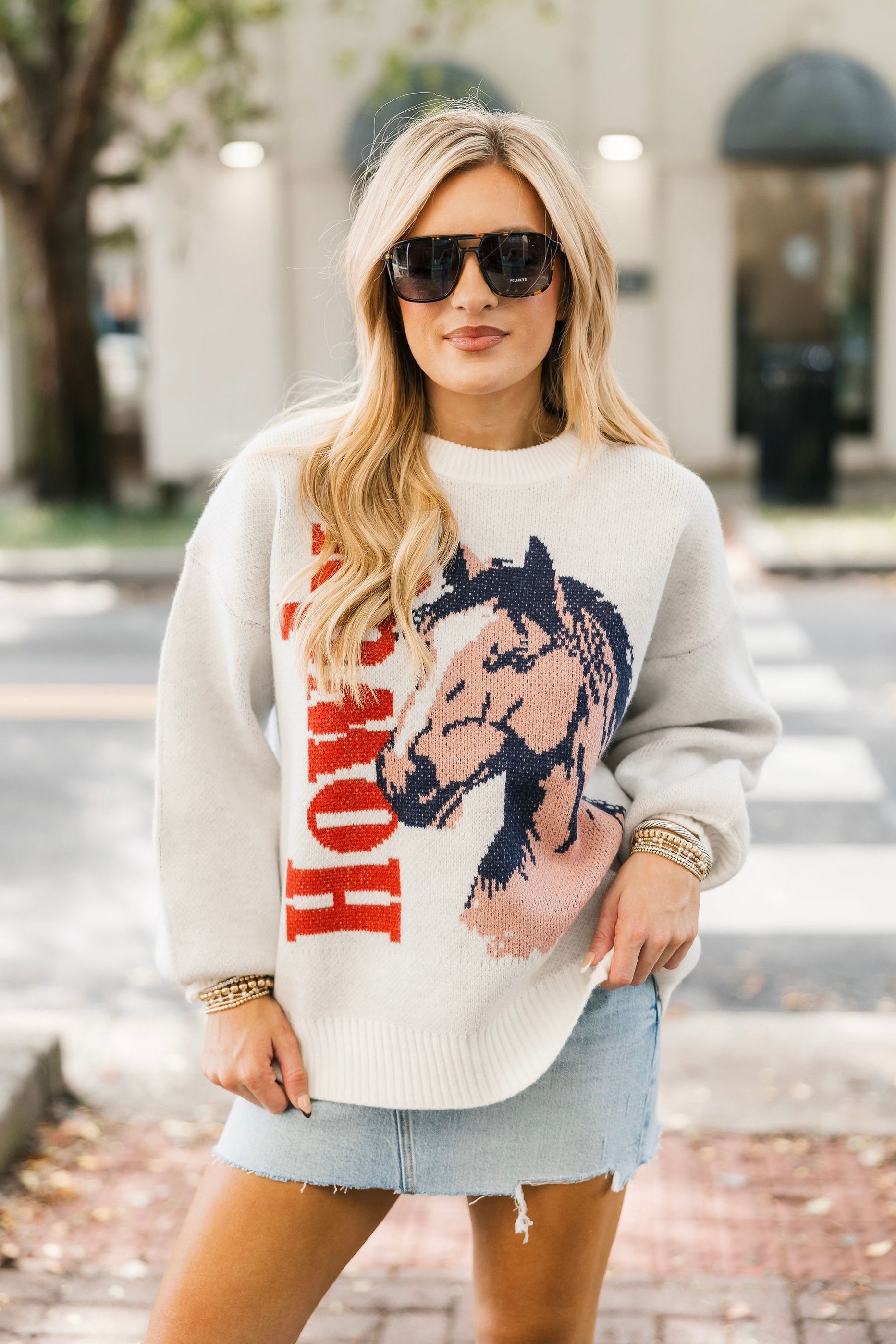 This relaxed-fit sweater brings a playful Western vibe with its bold horse graphic set against a cozy knit backdrop. Designed with a classic crewneck and long sleeves, it’s the perfect mix of comfort and standout style. Lexi is wearing a S/M.