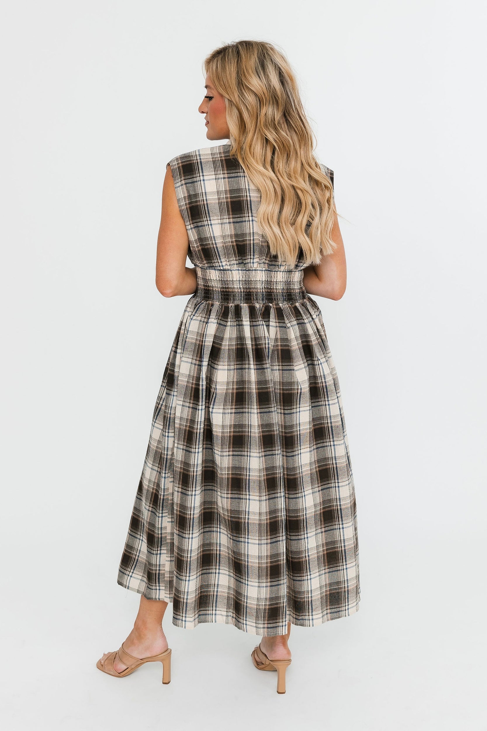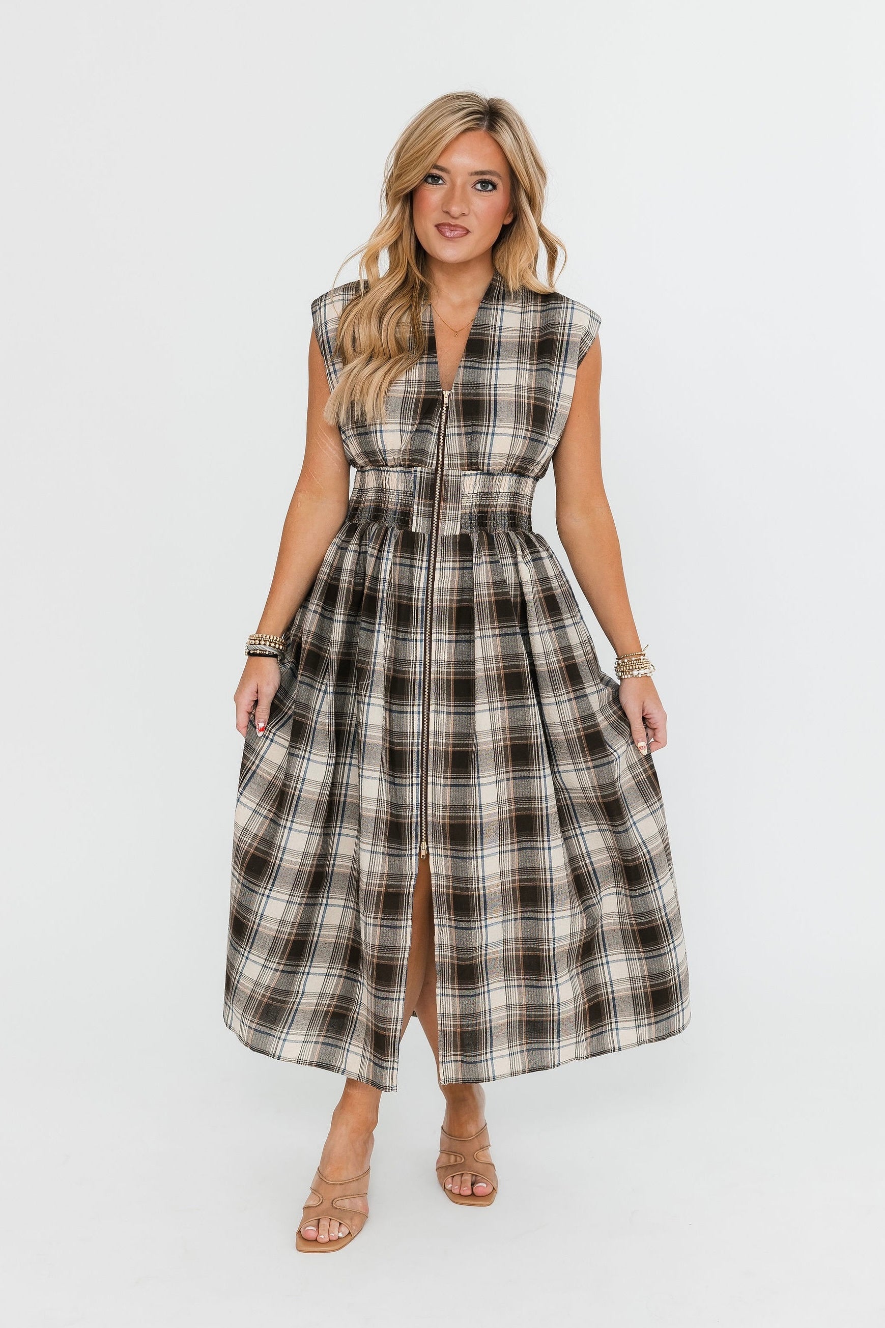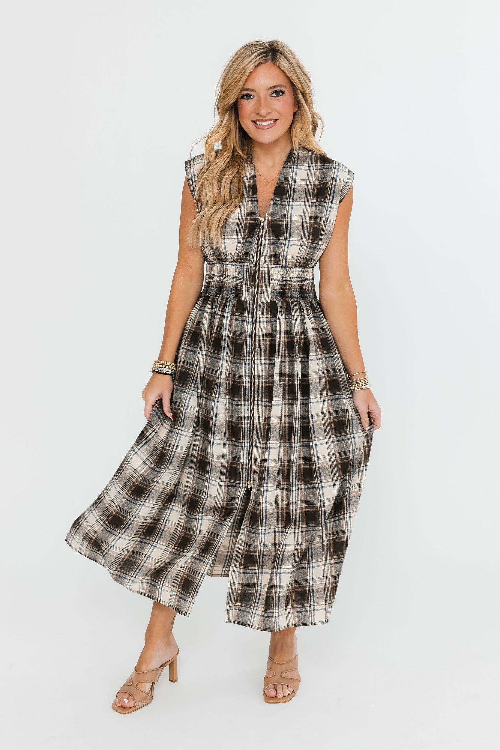 Flirty, flattering, and full of charm — the In This Moment Midi is your go-to dress for effortless styling. Featuring a relaxed fit with a cinched smocked waist, this sleeveless piece includes a V-neckline, front zipper closure, and handy side pockets. The classic plaid print adds just the right amount of edge. Lexi is wearing a small.