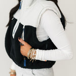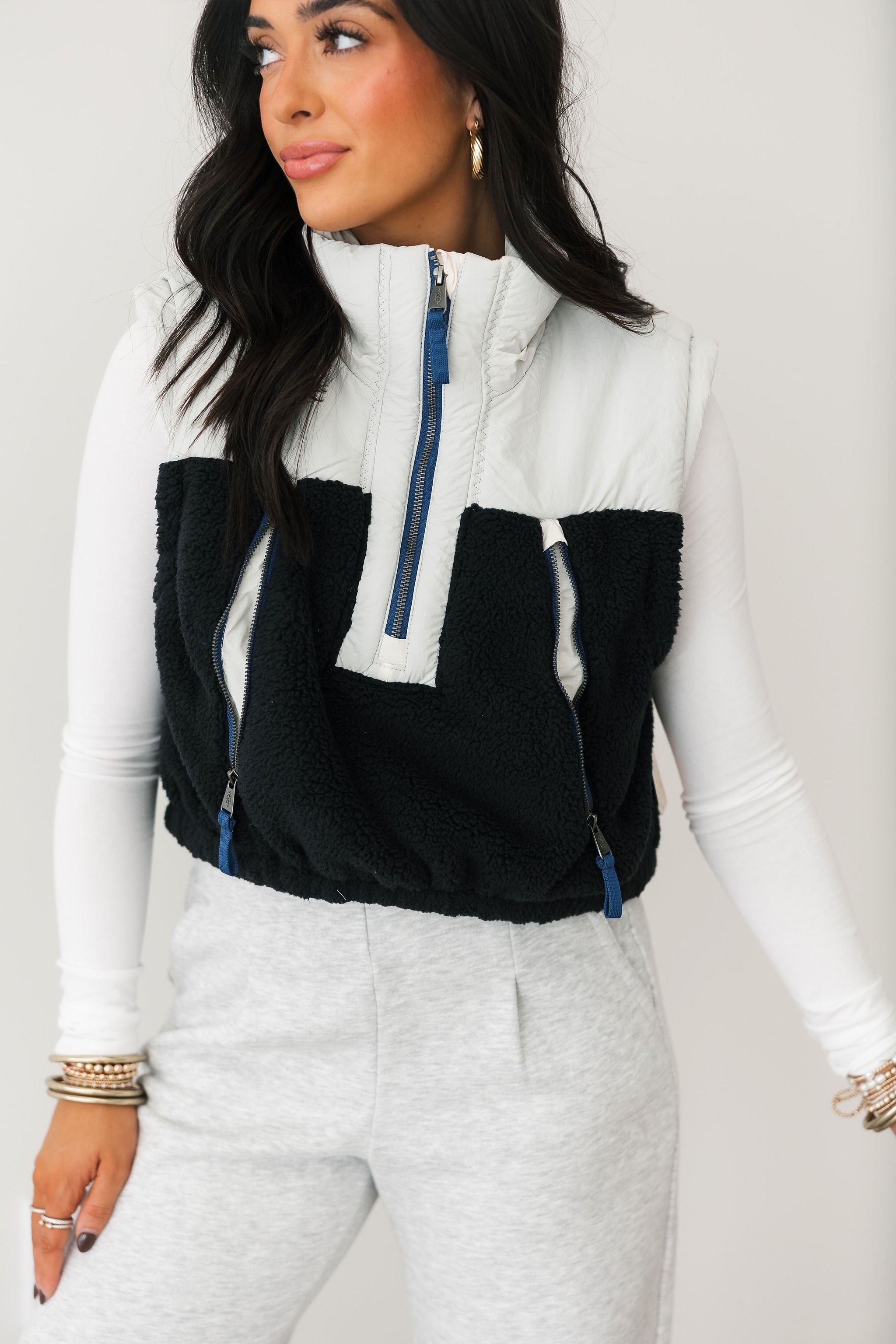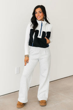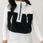 The Free People Journey Ahead Vest in Ivory Combo features a cropped, boxy silhouette with a high neck, quarter-zip front, and front pockets. Sherpa detailing adds softness and dimension, making it the perfect layering piece over tees, long sleeves, or lightweight sweaters for a relaxed yet stylish finish. Sage is wearing an xs.
