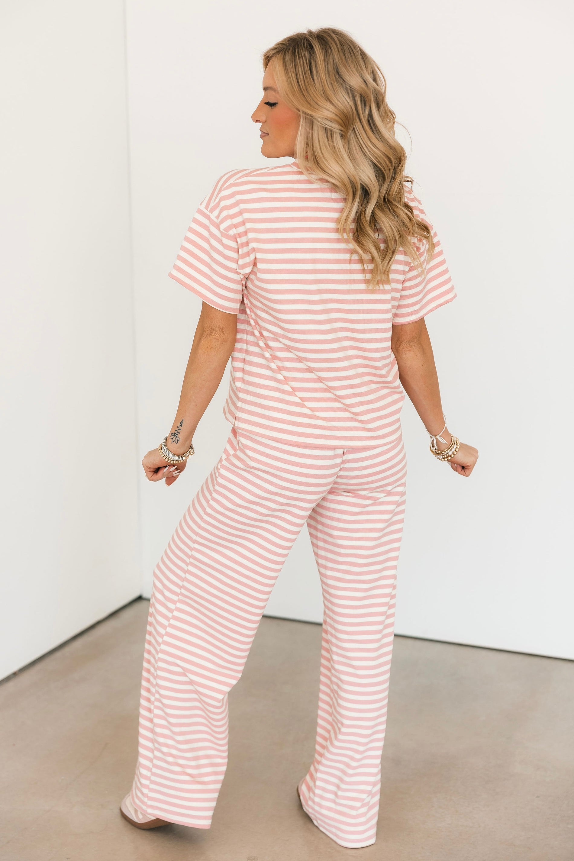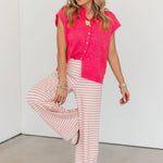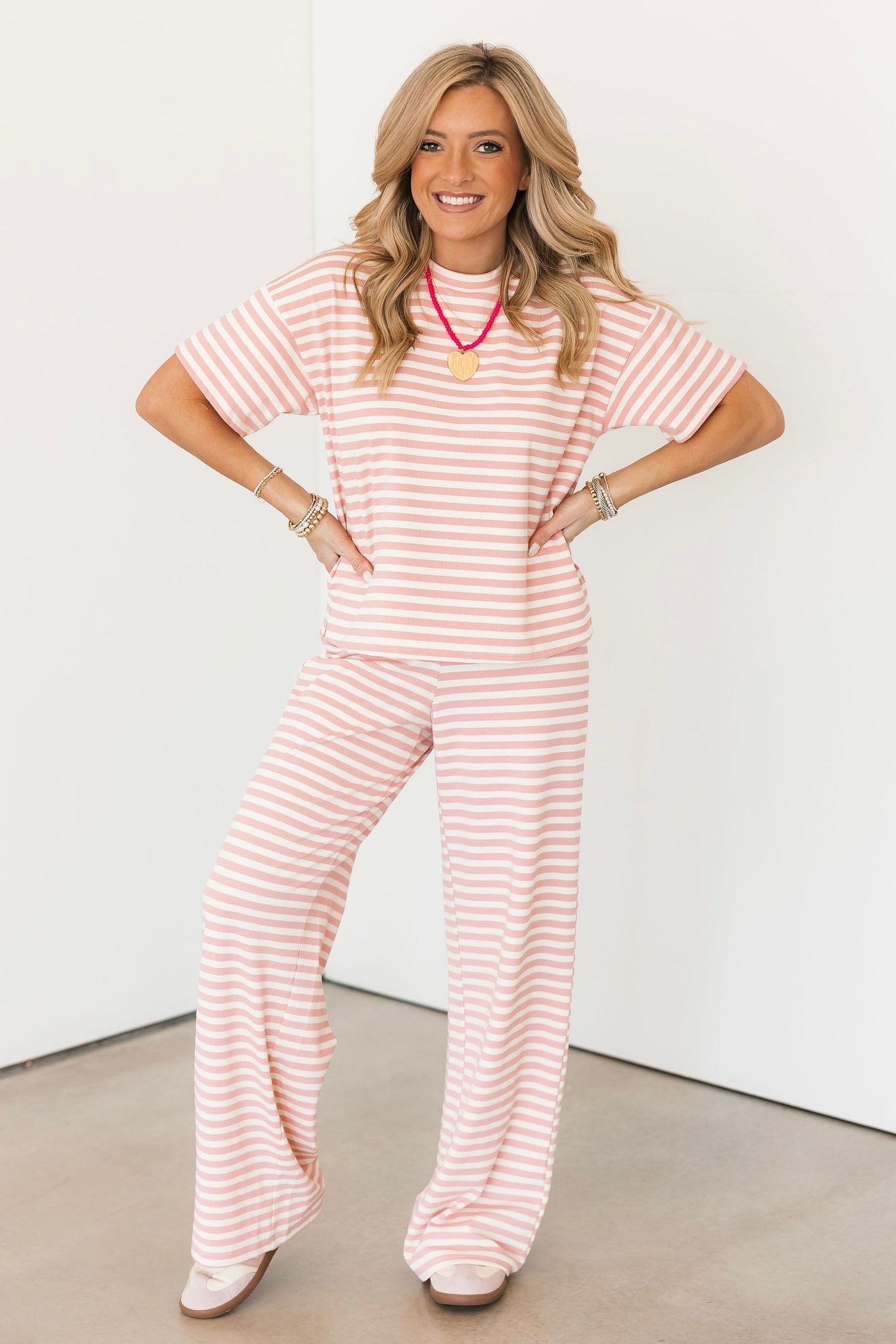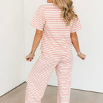 Our Jumie Striped Pants in Baby Pink are one of our favorites, designed with a comfy elastic waistband and an easy pull-on fit. They’re as cozy as they are cute and pair perfectly with the matching top for a complete set, or styled with other pieces in your closet for a fun, effortless look. Lexi is wearing a small.