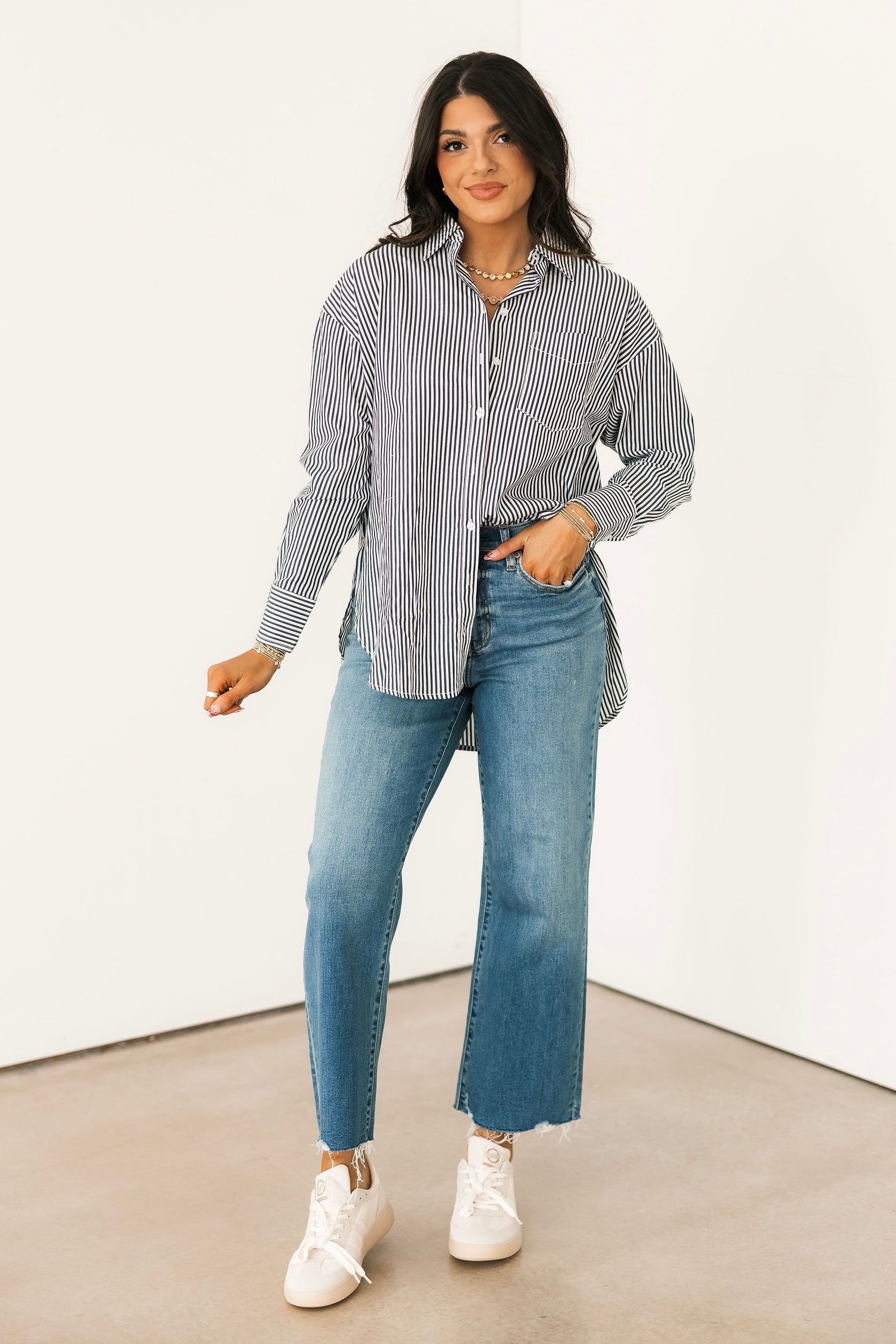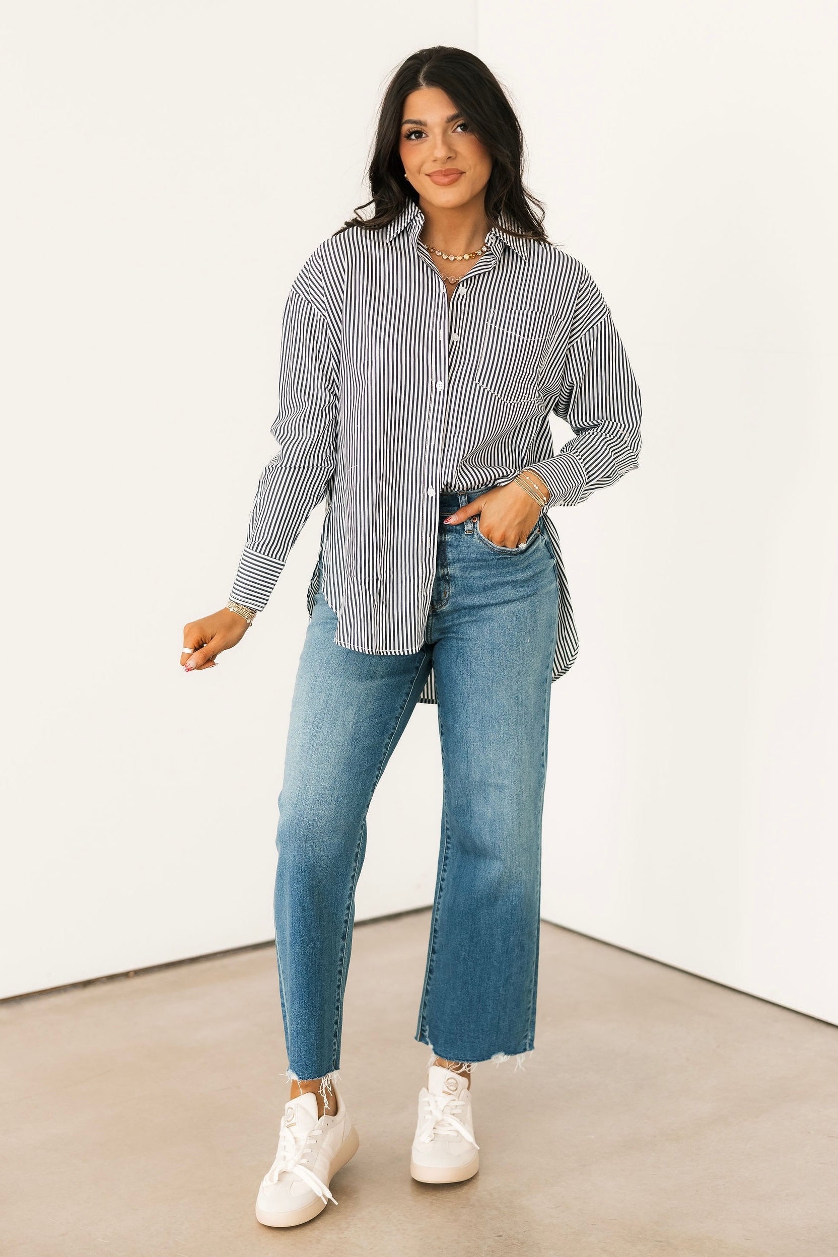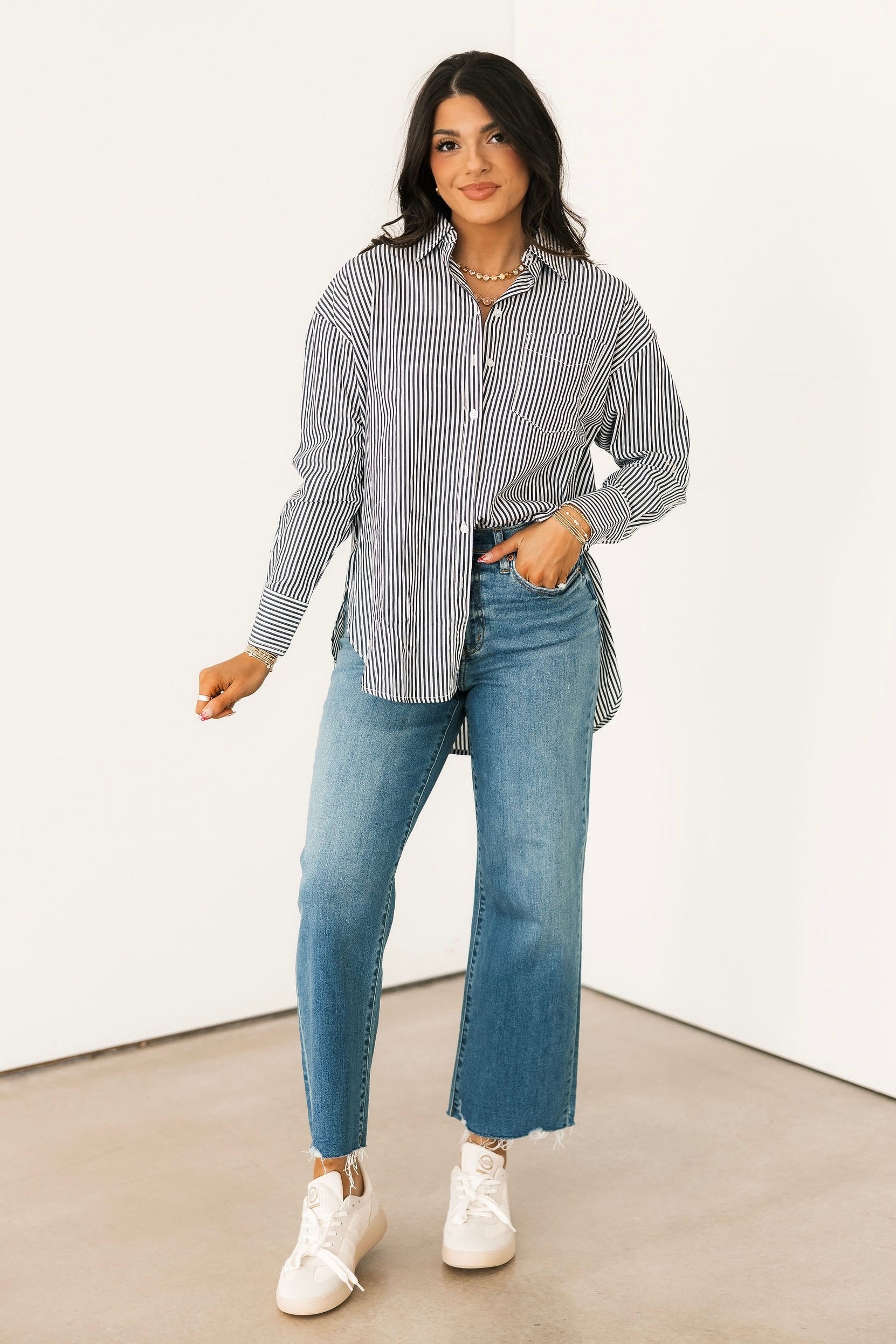 The Lainey Button Down Top In Navy is a classic button down collared blouse. The navy color is easy to pair with everything from denim to tailored trousers, whether you’re heading to work, brunch, or a casual night out. Harli is wearing a medium.