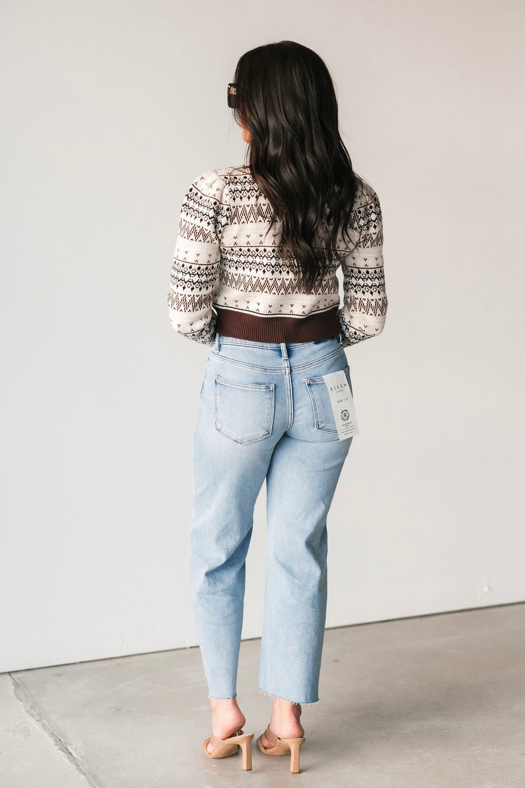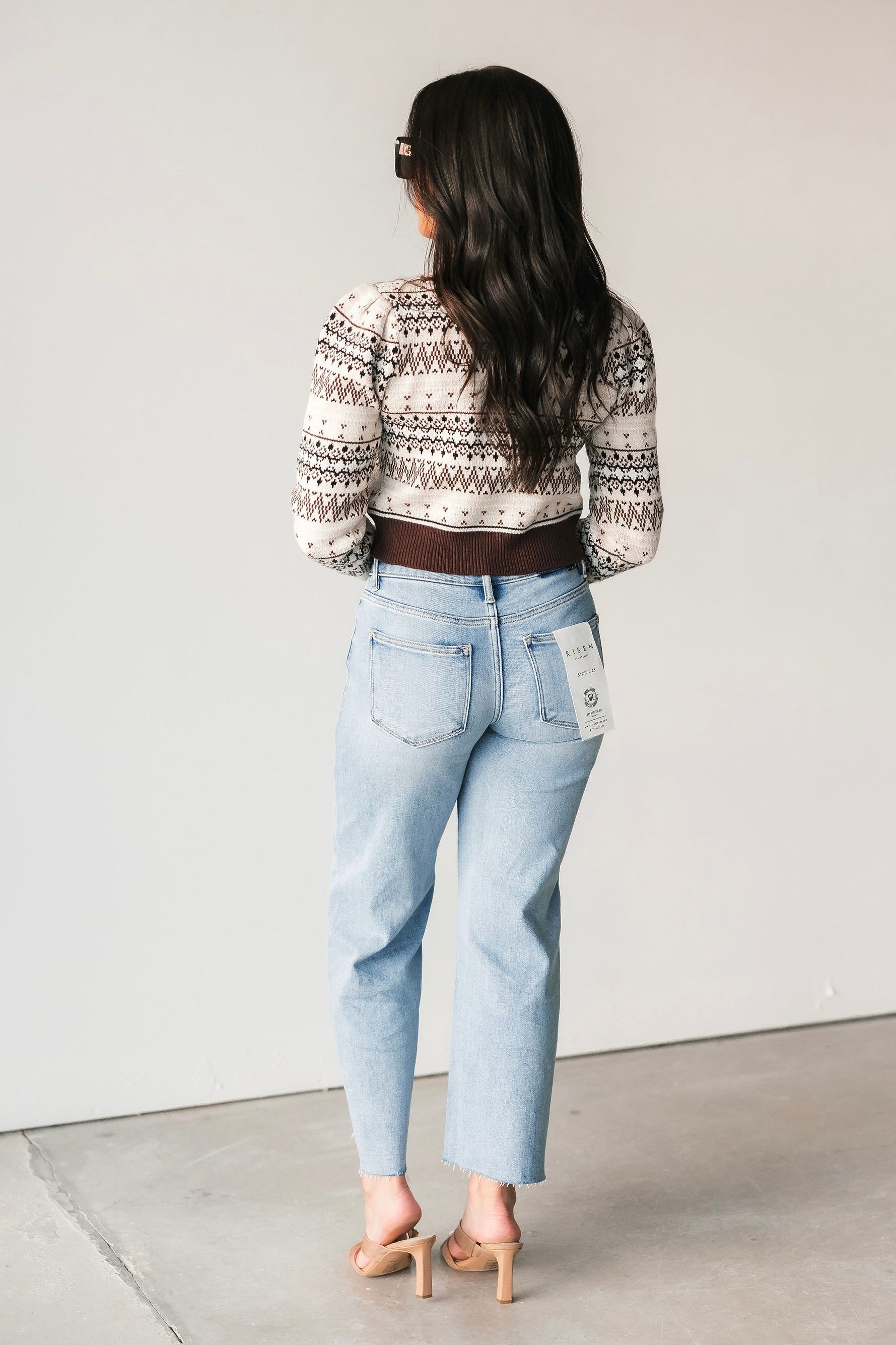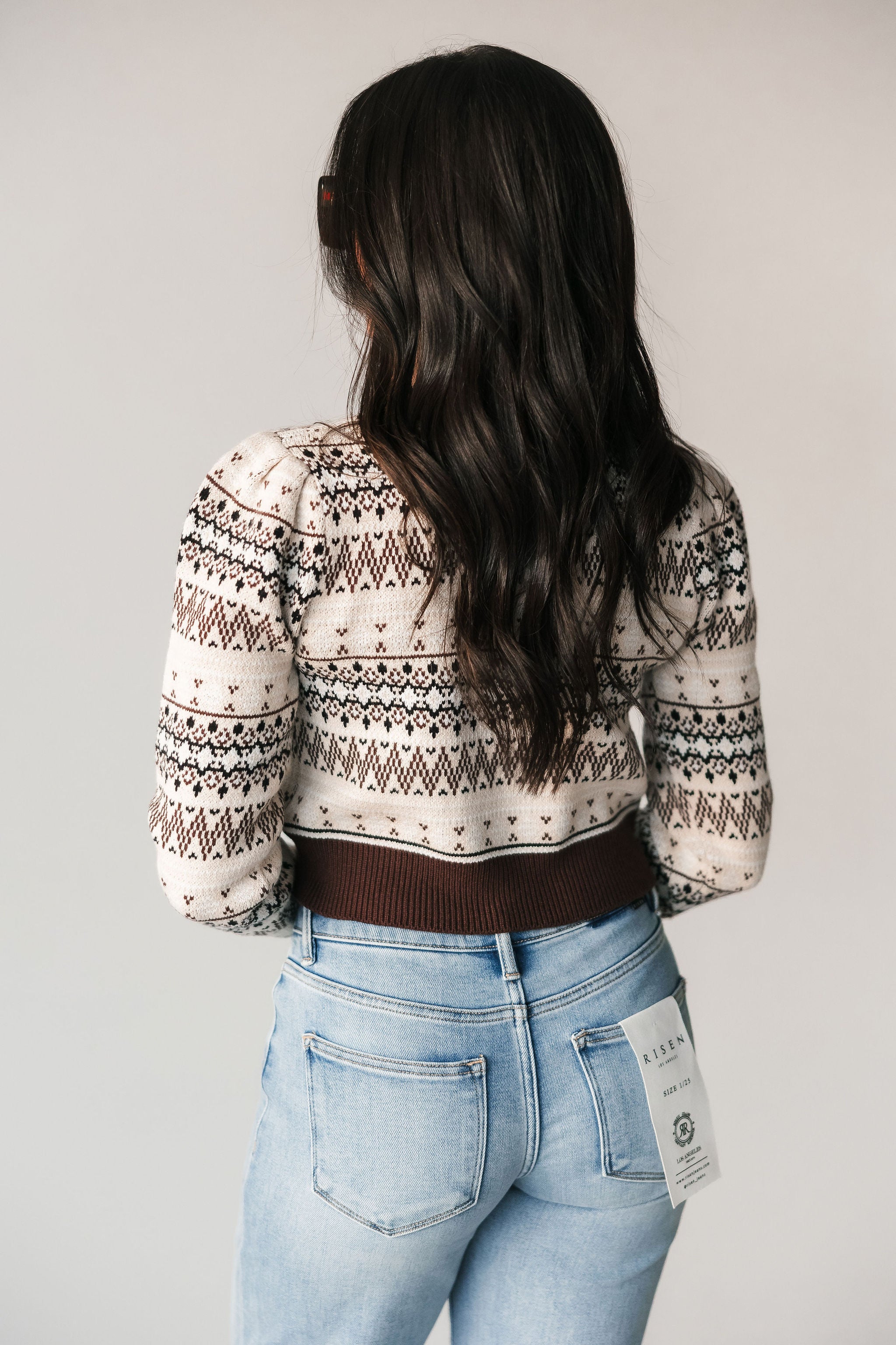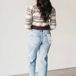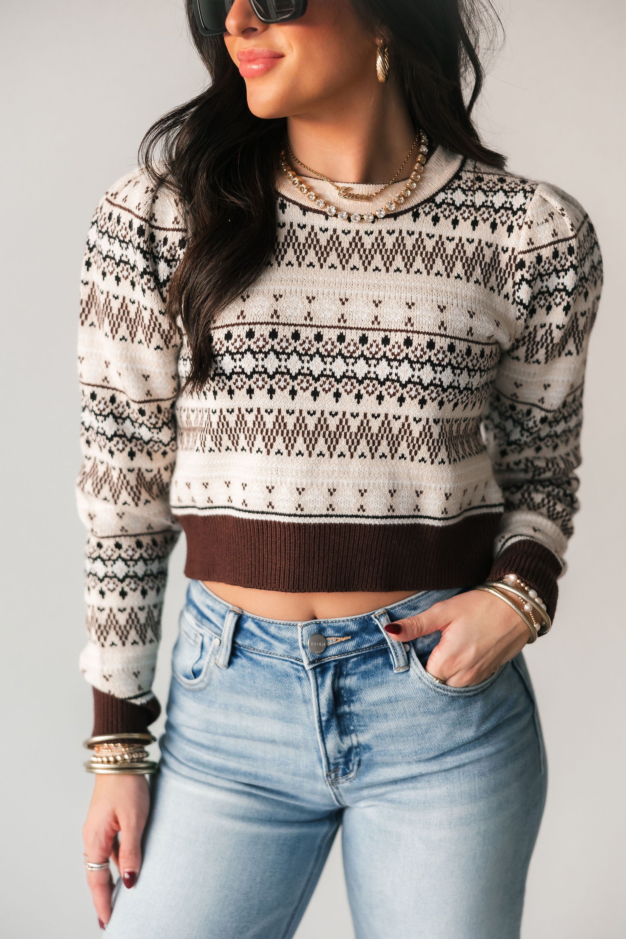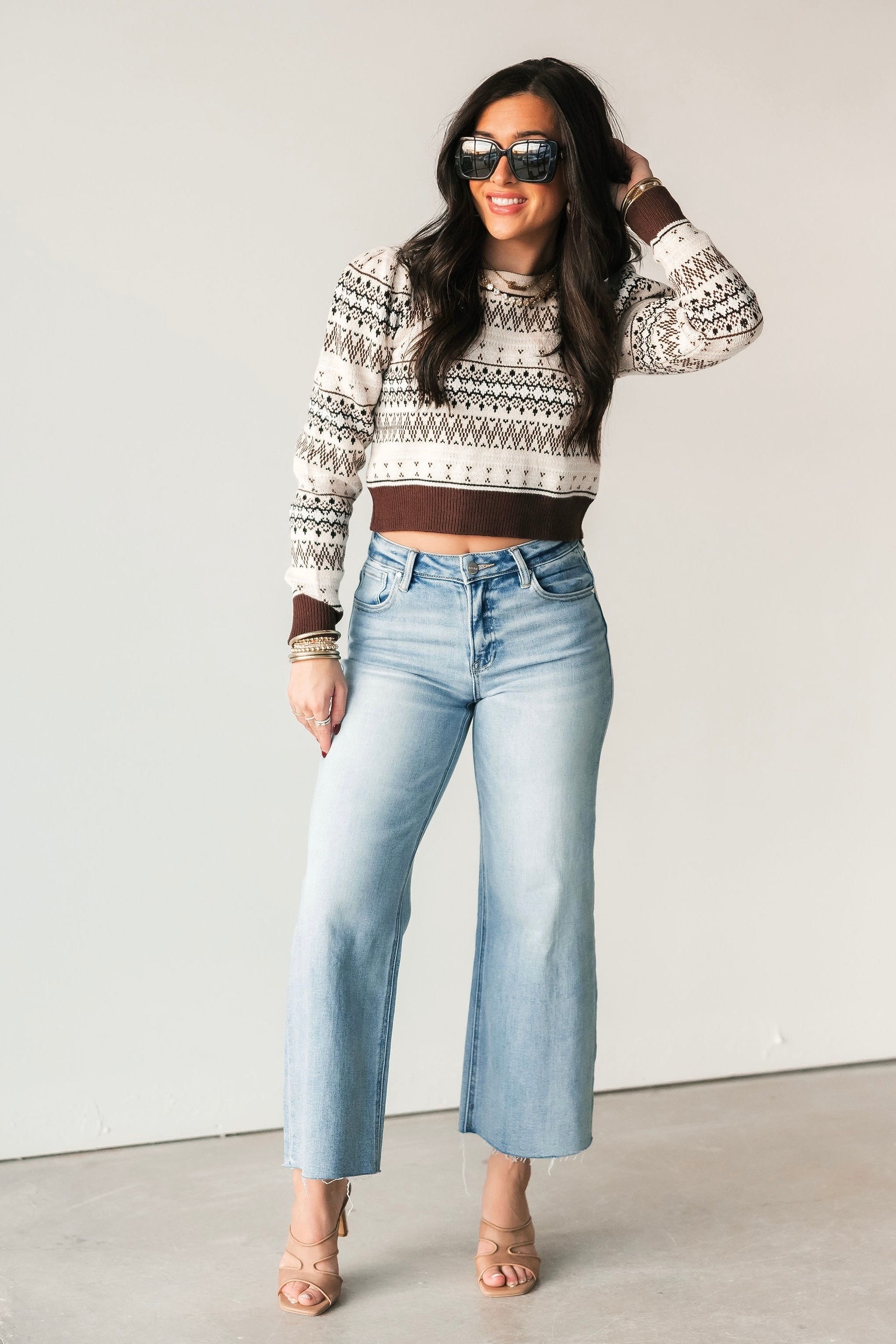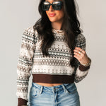 This cropped sweater features long sleeves, a classic crew neckline, and a charming patterned knit that adds texture and warmth. Soft, cozy, and easy to style, it’s the perfect piece for transitioning through the seasons. Sage is wearing a small.
