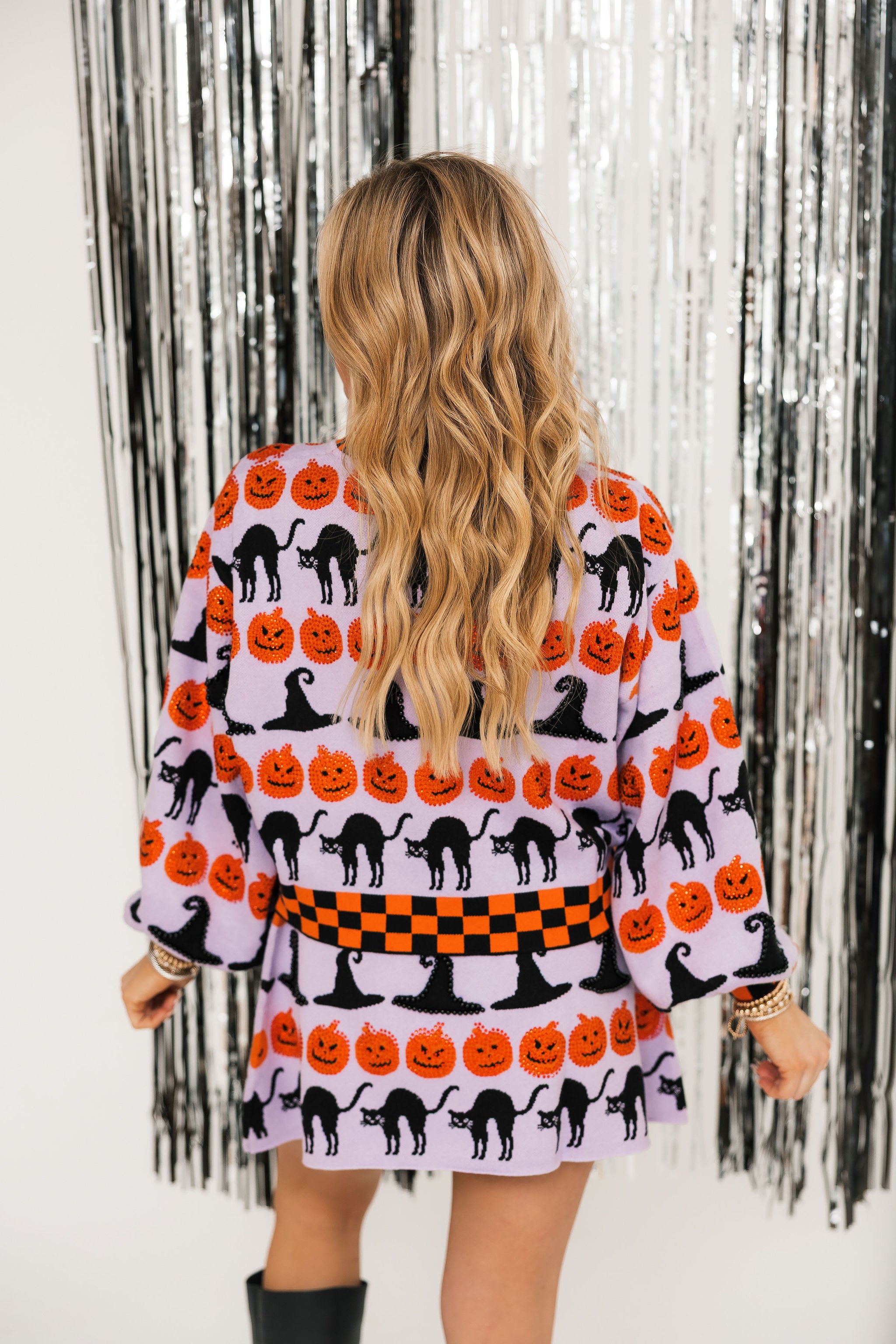 Get spooky and sparkly in the cutest way possible. This Queen Of Sparkles Halloween Icon Sweater features bold sequin jack-o’-lanterns, witch hats, and black cats all set on a soft lavender knit. The black and orange checkerboard trim adds a fun, retro twist while keeping the festive vibes strong. Designed to pair with the matching skirt or stand on its own, this sweater is perfect for pumpkin patch days, Halloween parties, or simply showing your love for all things October. 🎃🖤✨ Lexi is wearing an XS.