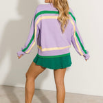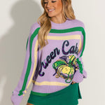 This festive sweater is designed with lavender, green, and yellow stripes that perfectly capture the spirit of Mardi Gras. The relaxed fit and crew neckline make it easy to wear and style, while the long sleeves add comfort for cooler days. We love how the playful colorblocking brings a bold and fun touch, making this a must-have for celebrating the season.