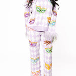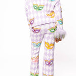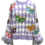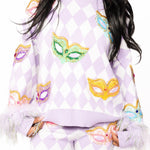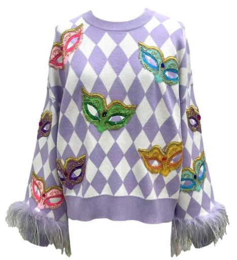 The Queen Of Sparkles Lavender & White Diamond Print Multi Mask Feather Sleeve Sweater is a statement piece made for Mardi Gras magic. Designed with a relaxed crewneck fit, it features a diamond-print knit, eye-catching mask graphics, and dramatic feather-detailed sleeves. Cozy yet striking, it’s a must-have for festive celebrations or standout everyday style.