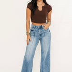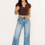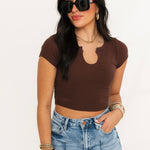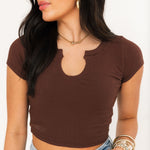 The Layered Up Baby Tee in chocolate features a fitted, cropped silhouette with a split U-neckline, short sleeves, and soft knit fabric—perfect for styling solo or layering into your look. Sage is wearing a small.