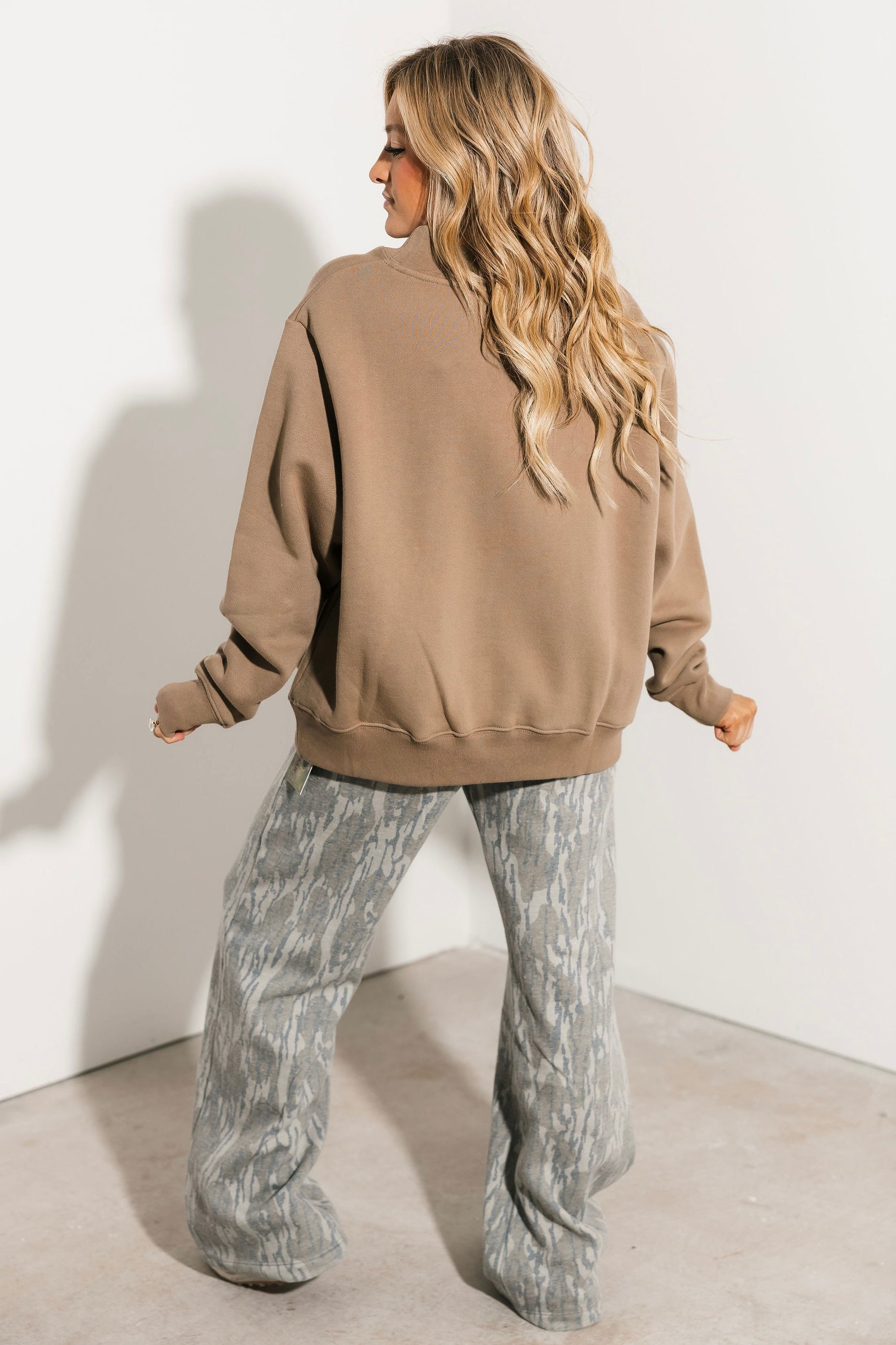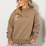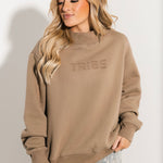The Tribe Kelley Legacy Mock Neck Sweatshirt in Driftwood features a true-to-size relaxed fit with long sleeves and a soft mock neckline. Its timeless design makes it a versatile staple you can pair with leggings, denim, or joggers for a laid-back, lived-in look. Lexi is wearing a small.
