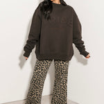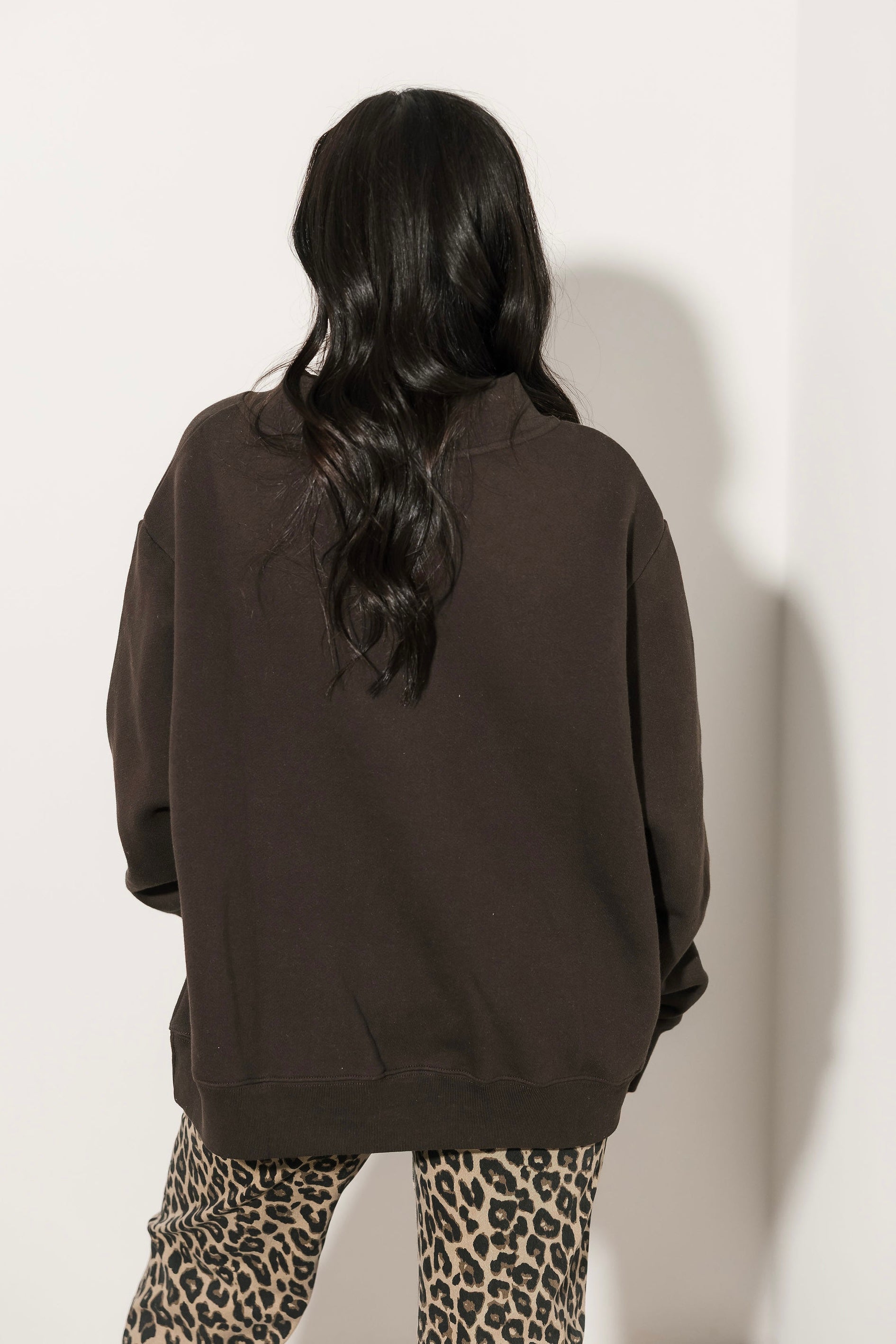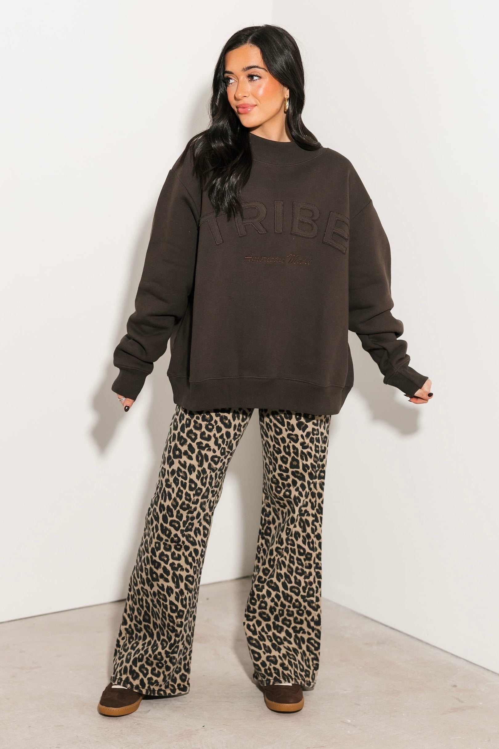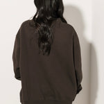 The Tribe Kelley Legacy Mock Neck Sweatshirt in Oxford Brown features a true-to-size relaxed fit with long sleeves and a soft mock neckline. Its timeless design makes it a versatile staple you can pair with leggings, denim, or joggers for a laid-back, lived-in look. Sage is wearing a small.