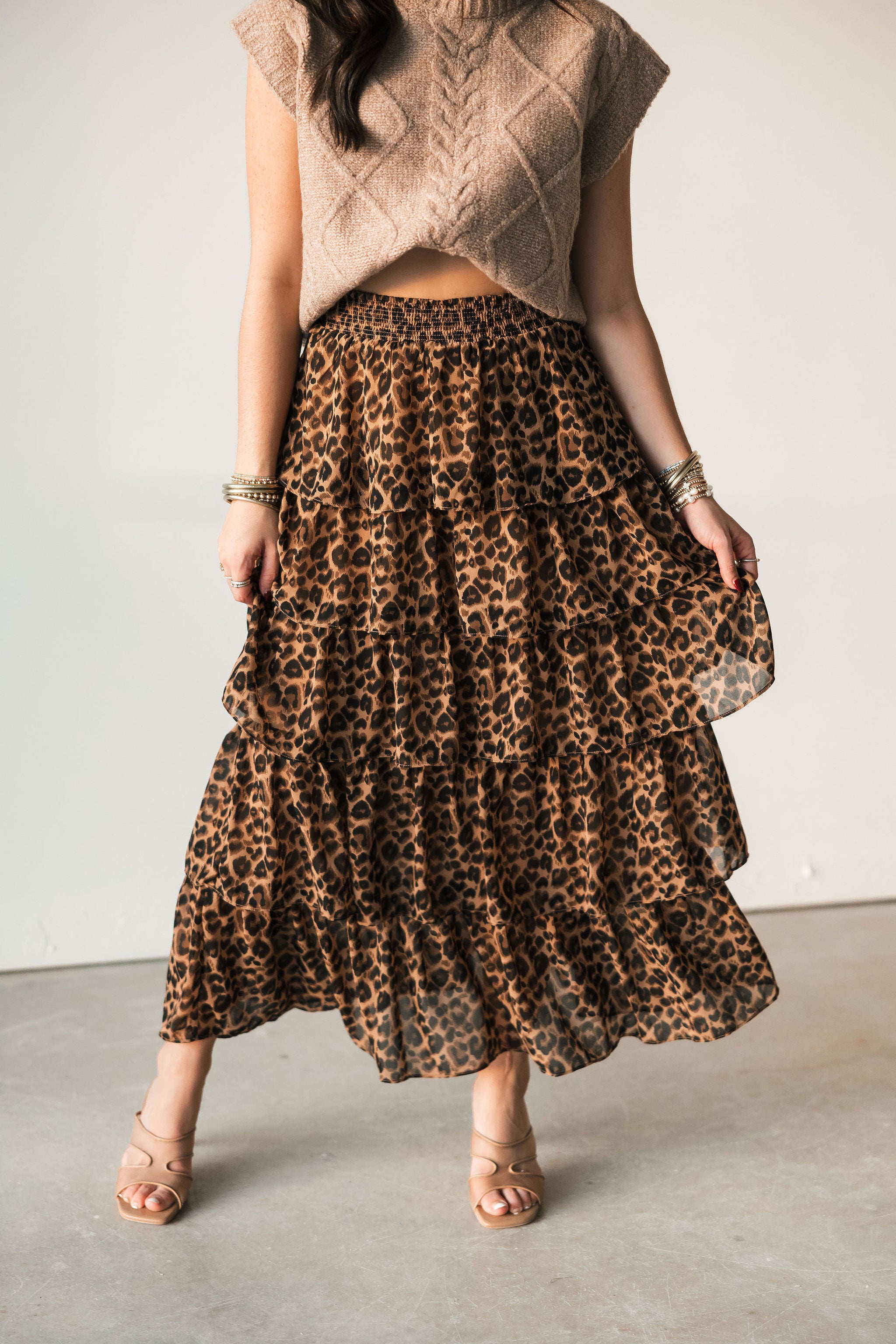 This flowy maxi skirt features a stretchy elastic waistband and a tiered design for easy movement. With its bold leopard print and flattering maxi length, it’s a standout piece that combines comfort and style for any occasion. Sage is wearing a small.